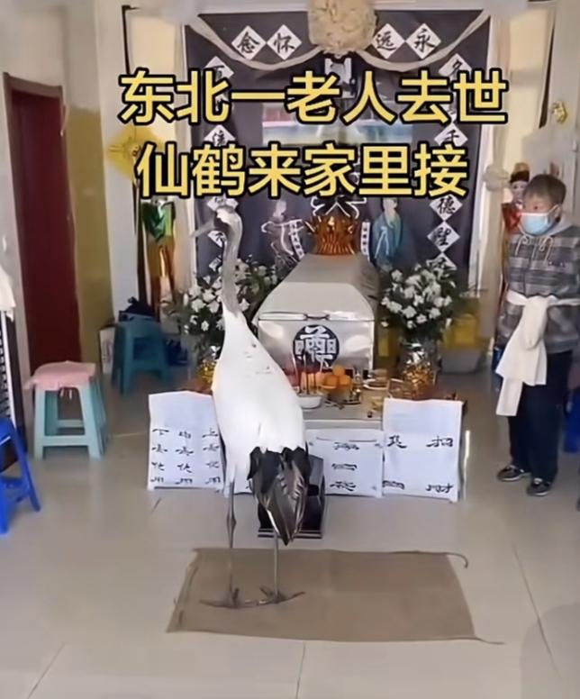 昨天刷抖音看到如图所示这个情景,说是东北一家人老人去世,一只仙鹤竟然从外面飞来,