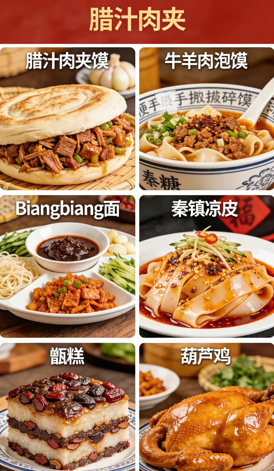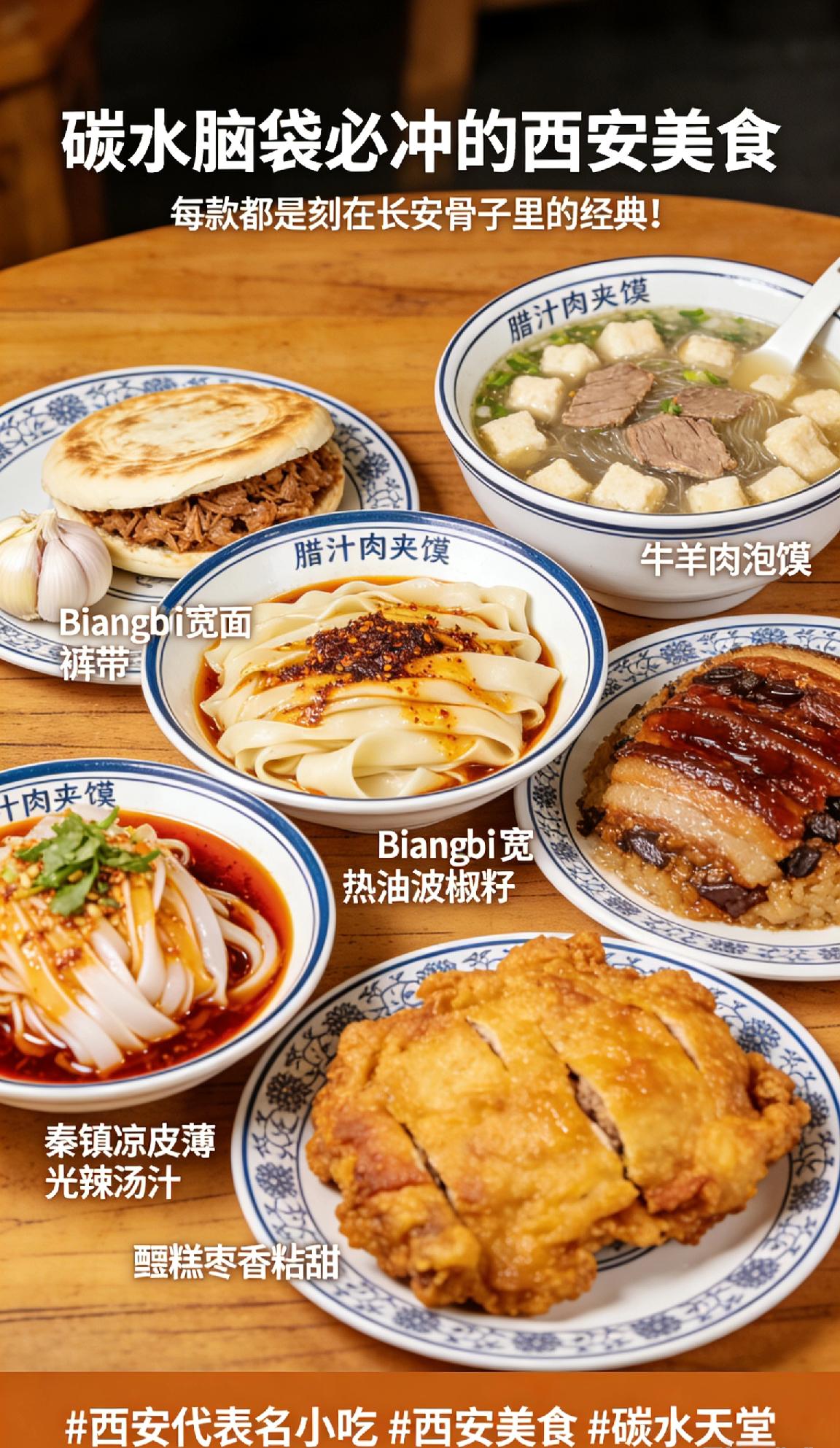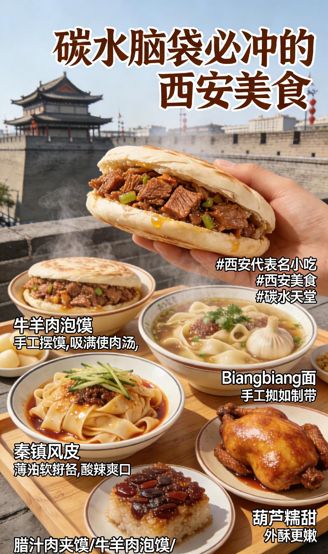 碳水脑袋必冲的西安美食,每款都是刻在长安骨子里的经典! 腊汁肉夹馍堪称中式汉堡天花板,外皮酥到掉渣,肥瘦相间的卤肉慢炖8小时,肉汁四溢超入味 。牛羊肉泡馍得自己亲手掰馍,煮后吸满浓郁肉汤,搭配糖蒜一口鲜掉眉毛。 Biangbiang面宽如裤带,手工扯制筋道十足,热油泼辣子瞬间香气爆炸。秦镇凉皮薄光软筋,酸辣爽口解腻,夏天来一碗太治愈。还有甑糕的枣香糯甜、葫芦鸡的外酥里嫩,每一口都是长安味! 西安代表名小吃 西安美食
