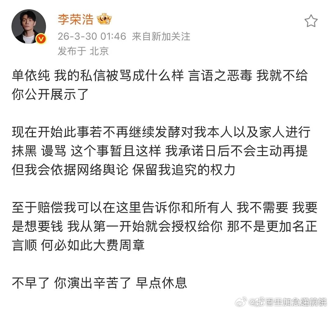 李荣浩也回应了,说自己的私信已经被谩骂淹没,若此事不再发酵、他本人及家人不再被谩骂抹黑,“这个事暂且这样”,更强调自己不需要赔偿。李荣浩说不需要赔偿单依纯承担全额版权使用费及赔偿单依纯发长文回应