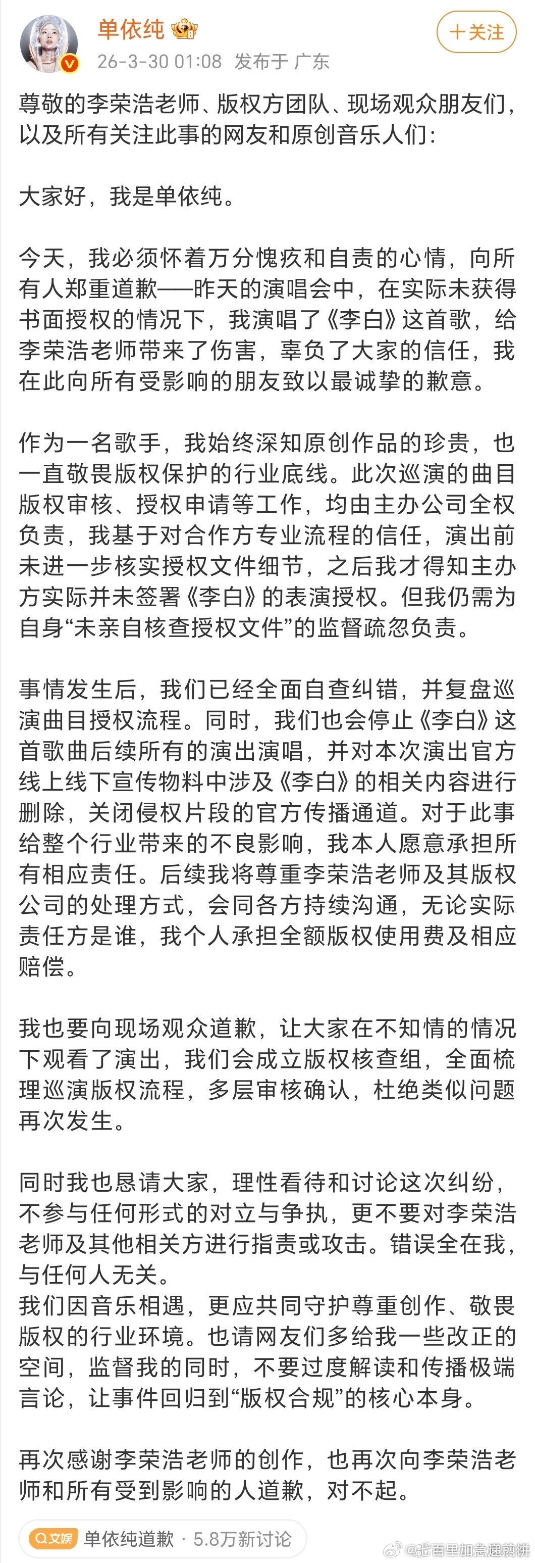 这个事情估计目前处理结果就这样,单依纯发长文向李荣浩道歉,称会停止《李白》后续所有的演出演唱,个人承担全额版权费及相应赔偿。单的经纪公司也发博道歉