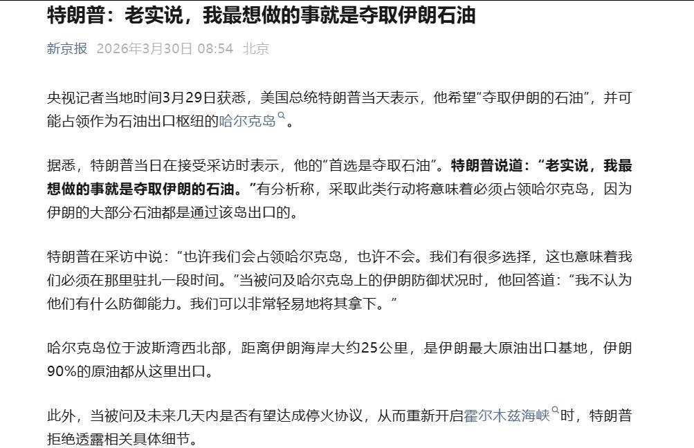 憋不住了,特朗普坏得一点都不掩饰了,特朗普说道:“老实说,我最想做的事就是夺取伊