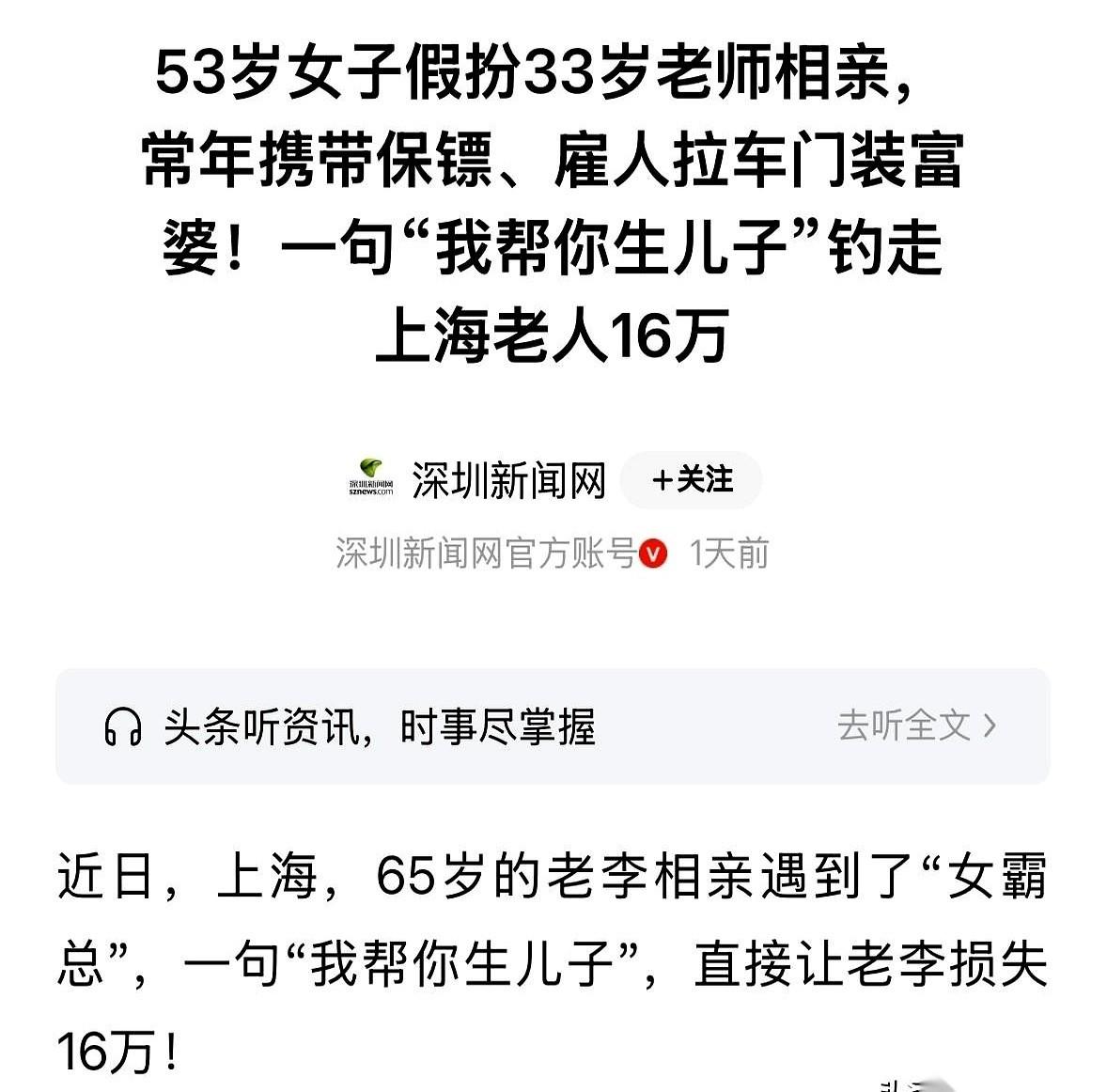 上海,一个65岁大爷,手捏300万,把一个女人的电话拉黑了。 他瞅着对方那张脸,说50岁都有人信,还自称33岁音乐老师?第二次见面,大爷让她带身份证,她支支吾吾拿不出来。大爷二话不说,直接删除。 清静了一个月。 电话突然响了,还是那个女人,只说了一句话:“我给你生个儿子。” 大爷拿电话的手,停在了半空。 这辈子,没儿没女,就是他心里那根拔不掉的刺。300万的家产,将来给谁?他一想这事,晚上就睡不着。 这句“我给你生个儿子”,直接把他的防火墙全干碎了。 第三次见面,约在KTV。包厢里灯光乱闪,她唱了两首歌,大爷起身去上厕所。 他推开沉重的包厢门,走廊的光照得他眯了下眼。等他再推门回来,沙发上空了。女人不见了,他放在茶几上的手机,也不见了。 他浑身的血一下就凉了。 他借别人的手机打过去,一个陌生的男声接了,说是出租车司机。要么自己去宝山拿,要么转1000块跑腿费送回来。 大爷直接挂了电话,手抖着报了警。 手机不值钱,但女人知道他卡里有17万活期,知道他有300万理财快到期了,更要命的是,她还见过他输入支付密码。 KTV的监控清清楚楚,就是她,趁他起身,顺走了手机。 一夜没合眼。 第二天一早,大爷哆哆嗦嗦打开银行APP,那个17万的数字,变成了一串冰冷的零。 警察最后把人抓了。什么33岁音乐老师,就是个53岁的骗子。出门开车门的司机,都是花钱雇的演员,专门钓他这种一心求后的老人。 钱,追回来了。大爷对着银行卡余额看了半天,一句话没说。 从那天起,他再也没提过传宗接代的事。 说白了,有时候你心里最想要的那点东西,恰恰就是别人给你下的最狠的钩子。