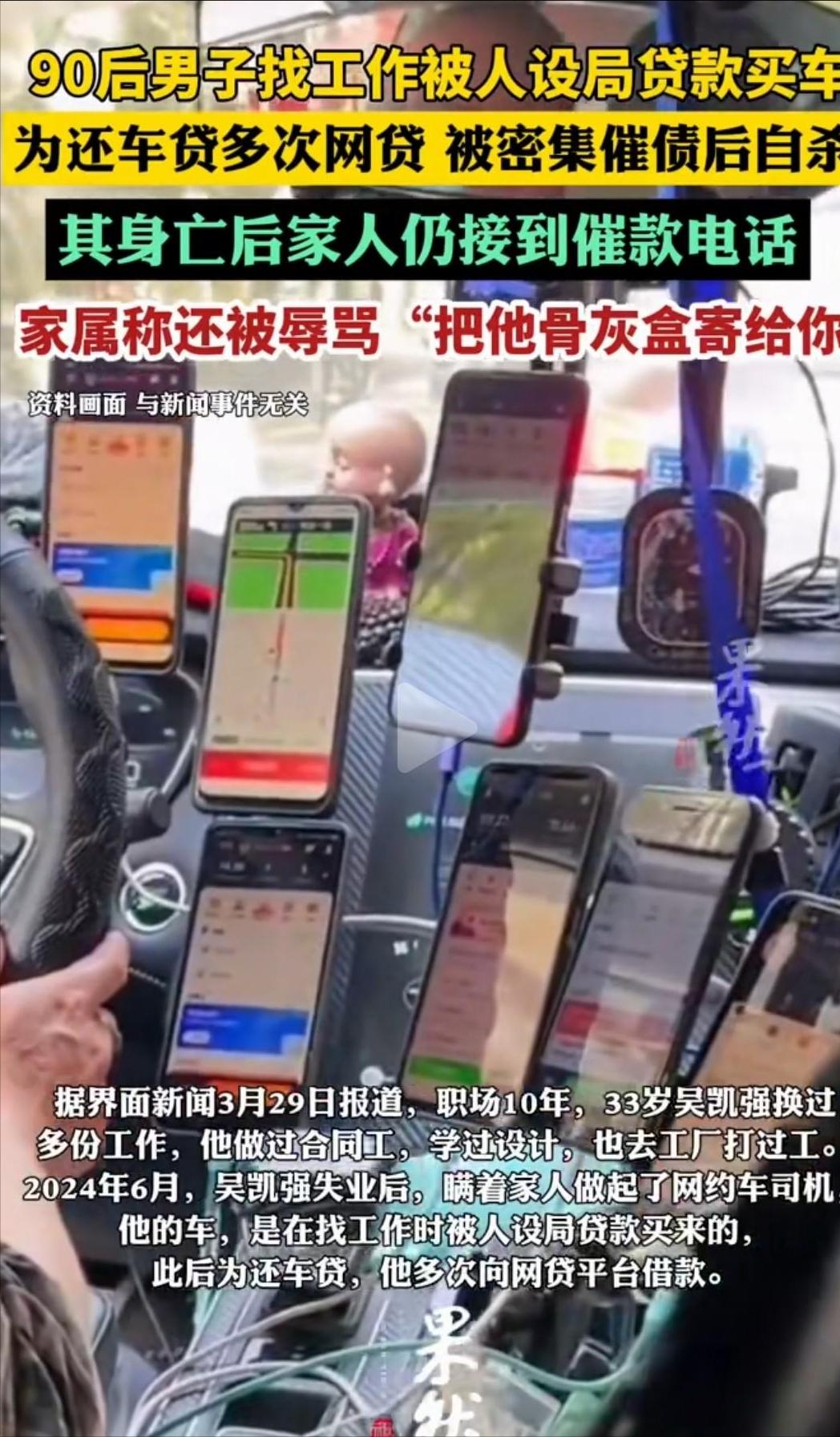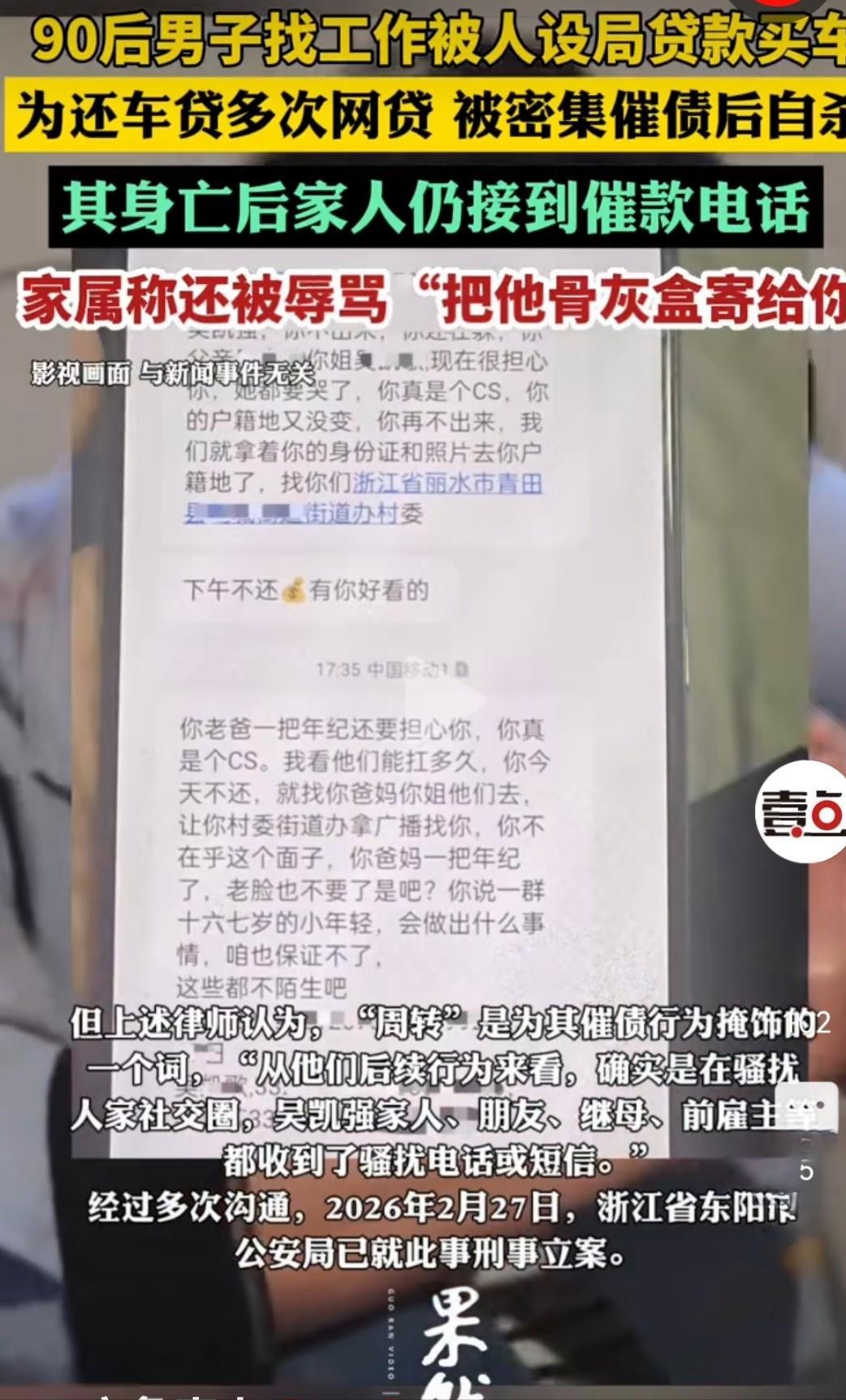 33岁的青年吴凯强,驱车来到浙江东阳。他将车稳稳停在一座墓碑旁,静谧的氛围里,似乎正酝酿着一段不为人知的故事。 车内空无一人,根本无人能够施以援手将他解救。他的处境,恰似孤立无援的孤岛,绝望的气息在狭小空间里弥漫。 那座肃穆的墓茔,静静卧于时光一隅,其中安寝着他至爱的母亲。岁月流转,墓冢似在默默诉说着往昔的温情与思念。 2025年10月19日的深夜,万籁俱寂。他于此处先是饮下农药,而后决然地割开了手腕,让生命在暗夜中面临至暗的考验。 月供3194.82元。 这数字如重负,沉沉地压在他的肩头,似无形巨石,令他每一步前行都倍感艰难,在生活的泥沼中挣扎,难以挣脱。60期,总共要还19.32万。然而,他收入最高的那个月,也仅仅只有4101块。如此微薄之数,似在诉说着生活的不易与艰辛 差多少?一算就懂 一年之前,他于林业公司遭遇失业之困。彼时,生活的转折突如其来,让他陷入一段迷茫之境。33岁,没存款,没背景,急得像热锅上的蚂蚁 彼时,一条招聘广告蓦地映入眼帘:诚聘驾驶员,保底月薪达1.2万,公司提供车辆,且无需缴纳押金 他想都没想就冲过去了 对方自称为“A风总监”,在微信上与我方相谈甚欢。而后,急切敦促第二天携带身份证前往东阳,言辞之间尽显催促之意。见面之后,情形出人意料。对方全然不提工作事宜,径直拉着他去看车,而后便催促着签字,一切进展得仓促而突然。全程逼得紧,文件根本没时间细看 等反应过来,名字下已经多了辆车 14万的车价,要背19.32万的债。合同上的签名是别人代签的,地址是假的 吴凯强以为自己找到工作了,其实他成了一名借款人 承诺的高薪根本没影儿。对方仅要求他去注册成为一名网约车司机,专职跑顺风车业务,除此之外,并未提及其他工作安排或要求。然而,此车保险标注为“非营业”,这意味着它不具备合法营运的资格,若用于营运,显然有悖相关规定。一旦遭查,非法运营之行为必将暴露无遗 欲退车?然合同既已签署。无奈之下,他只能鼓起勇气,咬紧牙关,强忍着内心的怯意,硬着头皮向前奔去。天天早出晚归,熬到深夜,就为了凑够月供 怎么办?借新债还旧债。一年内,他在网贷平台借了5次,每笔3.8万到4.9万不等,年利率16.31%。还有“先息后本”的套路,前头还得少,最后一期要一次性还本付息。资金压力如雪球般不断累积,在时光的滚动中持续膨胀,恰似一场无法停歇的雪崩,势头愈演愈烈,让人心生忧虑 2025年10月,撑不住了 逾期的第一天,催收电话就像轰炸机一样砸过来。不分白昼与黑夜,那狂猛的炮火持续不断地进行着轰袭,仿佛要将一切都彻底摧毁,在这无尽的轰炸中,世界陷入了一片混沌与恐惧 更绝妙的是,通过支付宝向他转了0.01元,还在备注处留下一行字:“且看你能隐匿多久 催收不止骚扰他一个人。家人、朋友、前老板、继母,所有能联系的人都接到了电话。身份证号竟被置于短信之中公然泄露,接踵而至的是威胁的寒意、恐吓的阴霾与辱骂的恶语,种种恶行,一样不落 那日,他独坐于屏幕前,神情落寞。在浏览器的搜索框中,手指颤抖着敲下“怎么死”,而后一条条地浏览,竟多达八十余条 晚上,他在自己的QQ邮箱里给家人留了最后一段话: 很是抱歉,我实在难以再继续承受这一切,身心的重负已让我无力支撑,此刻,我真的扛不住了。听闻他们声称要来寻你们,我的内心瞬间被恐惧所笼罩。那未知的情形如阴霾般压在心头,令我惶惶不安。我对生的眷恋那般深切,实在是不想面对死亡。每思及此,内心满是抗拒,真的,真的不愿就此消逝 然后,他买了农药,开车来到妈妈的墓旁。他把车停在母亲身边,吞下农药,又割了腕。于车中,他的脚步戛然而止,仿佛时间也在此刻凝固。生命的旅程在此处骤然停歇,只留下无尽的寂静与遗憾 令人义愤填膺的是,斯人已逝,那如跗骨之蛆般的催收竟仍未止息,依旧纠缠不休,着实叫人怒从中来 五日后,一位操着湖南口音的催收员致电姐姐吴凯歌,甫一开口便恶言相加,张狂至极,竟叫嚣道:“把他的骨灰盒寄给你!” 催收员行径恶劣,竟将吴凯强一家三口的身份证号发送至其亲友手机,还以言语威胁:“一群十六七岁的小年轻行事难测,后果如何,实难保证。” 家人报警求助,起初警方未予立案。其认为事件属于“问周转”情形,并非直接威胁,故而未将其纳入立案范畴。 直到律师介入,把吴凯强的遗书摆上台面。那封邮件里写得清清楚楚——催收要来找家人,他很害怕,扛不住了。 2026年2月27日,公安局依据相关法律规定,正式对该案件予以刑事立案,标志着司法程序的严肃启动,将依法彻查案件真相。 案子立了,但人没了。还有多少个“吴凯强”正走在这条路上?警方已经立案,真相迟早会来。但更重要的是,怎么从根子上堵住这些漏洞?一个生命的代价,应该换来整个社会的警觉。 参考:《浙江东阳一男子遭“套路贷”自杀警方刑事立案》央广网