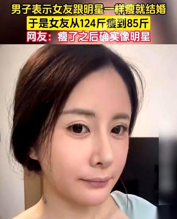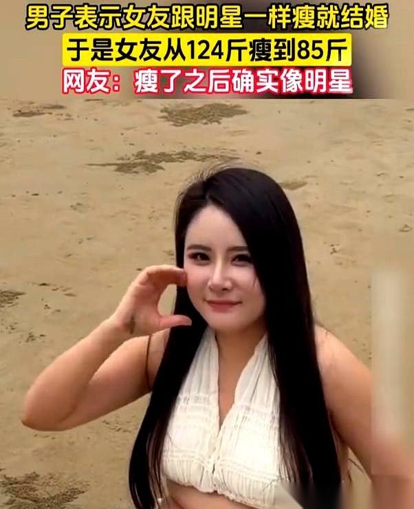 浙江一个哥们,冲着自己124斤的女友开了个玩笑。 他指着电视里的杨幂说:你要是能瘦成她那样,我立马娶你。 三个月后,一个85斤的姑娘站在他面前,身形跟他想的一样,但眼神,跟他想的完全不一样。 那三个月,她把自己的嘴当成了仇人。 以前满满一碗米饭,后来变成半碗,再后来,是几根孤零零的水煮青菜。同事递来的奶茶,她手直接挡开,头也扭过去,像是怕多看一眼,里面的糖分就会钻进身体里。 跑步机上的汗,不是往下滴,是往下甩。最难熬的是半夜,饿得胃里像有只猫在抓,翻来覆去,脑子里全是炸鸡腿、小烧烤在开派对。 她有好几次看着镜子里那个咬着牙、脸色发白的自己,差点就想把体重秤给砸了。 但最后砸下去的,还是身上的几十斤肉。 直到体重跌破100斤那天,她洗完澡,在水汽还没散尽的镜子前,看着里面那个轮廓分明的下颌线和能放下硬币的锁骨,心里那个一直催着她“快一点、再快一点”的声音,忽然就停了。 她发现,自己拼了命想要的,好像已经不是那句承诺了。 再见面那天,哥们手里的手机都差点滑下去。 他准备了一肚子的话,想问她怎么做到的,想说点什么缓和一下。可话到嘴边,一个字都吐不出来。 因为他看见的,不止是一个瘦下来的女朋友,而是一个眼神里再也没有“讨好”这两个字的,一个崭新的,甚至有点陌生的女人。 他那句玩笑,像个回旋镖,飞了三个月,不偏不倚,正中自己的脑门。 现在,她朋友圈晒的都是健身餐,是新买的裙子,是阳光下的自拍,唯独没有他。 他那句轻飘飘的“我娶你”,当初听着像个天大的恩赐。 现在,更像个烫嘴的山芋。 这就叫,你以为你给她设了个终点线,其实是亲手给她递了把发令枪。