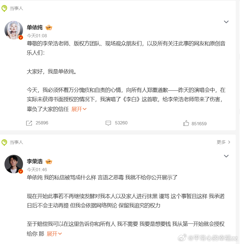 单依纯承担全额版权使用费及赔偿热点观点 李荣浩明确拒绝后仍硬唱?单依纯这波操作不冤“申请被拒,硬唱《李白》”——单依纯的深圳演唱会,把自己唱进了版权漩涡。李荣浩3月29日直接开炮:授权明确被拒,歌还是唱了。音著协更定性为“强行侵权”。单依纯从“正在了解”到长文致歉,承认未亲自核查授权,将承担全额版权费及赔偿。信任主办方不是理由,歌手站上台的那一刻,责任就只在自己。被拒还唱,这学费交得不冤。