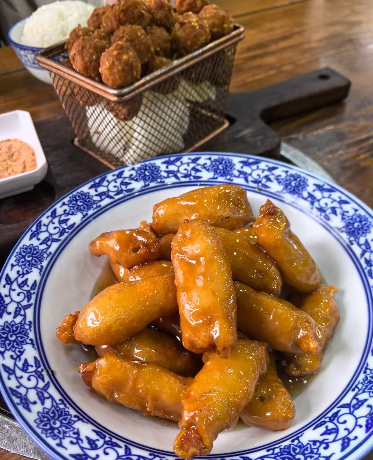 1️⃣.焦溜丸子,外皮炸得金黄酥脆,裹满酸甜芡汁,咬开爆汁嫩到流油