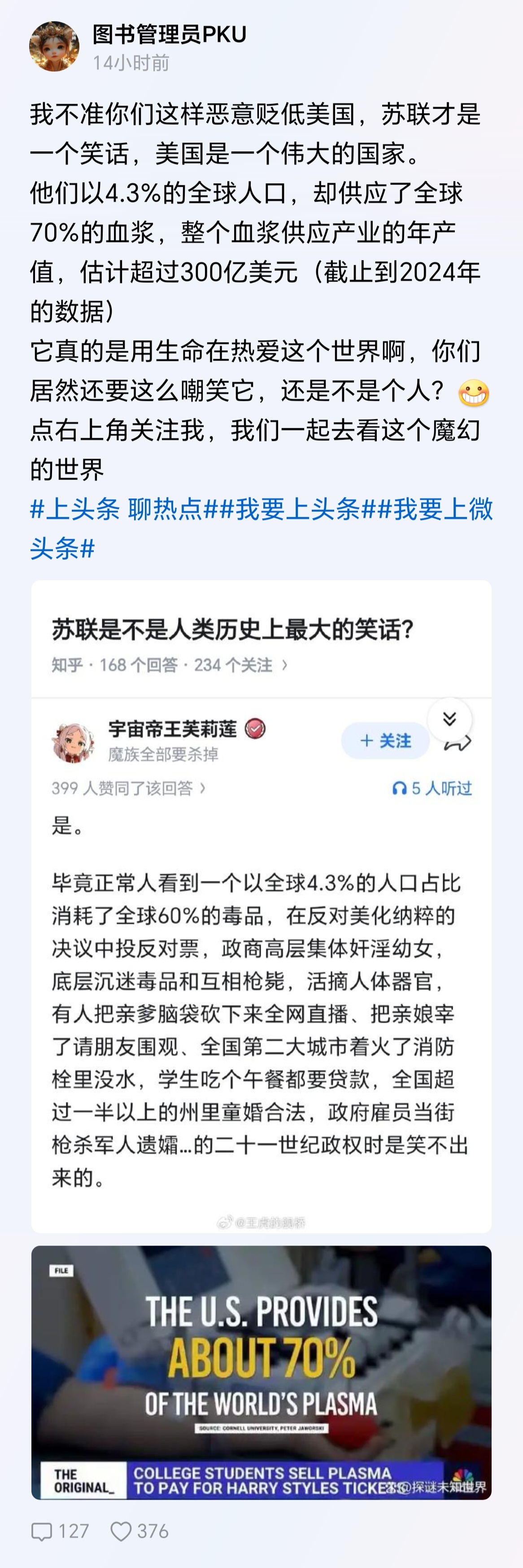 美国不仅提供了全球70%的血液制品,还消耗了全球60%的毒品。吃的是毒,献的是血,不愧是牢美呀