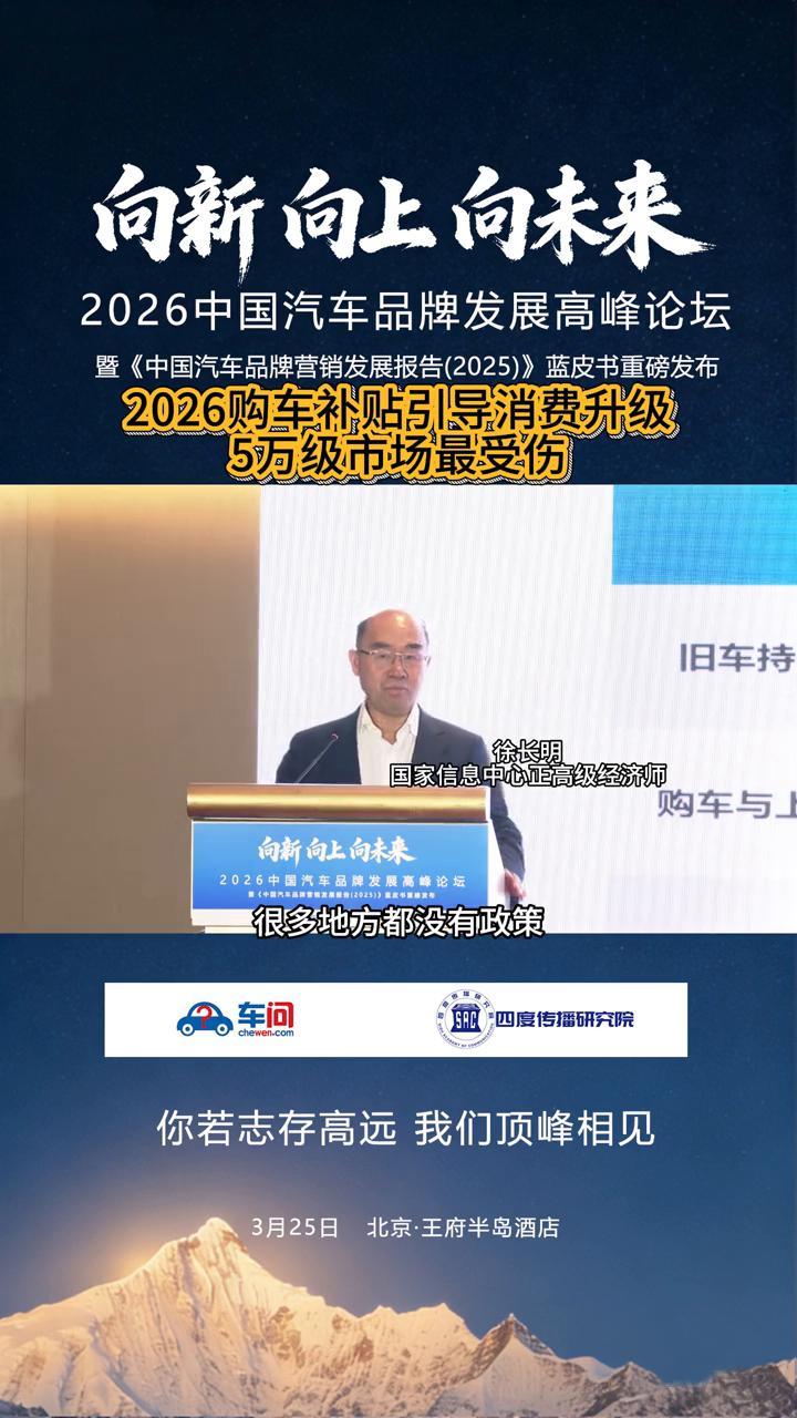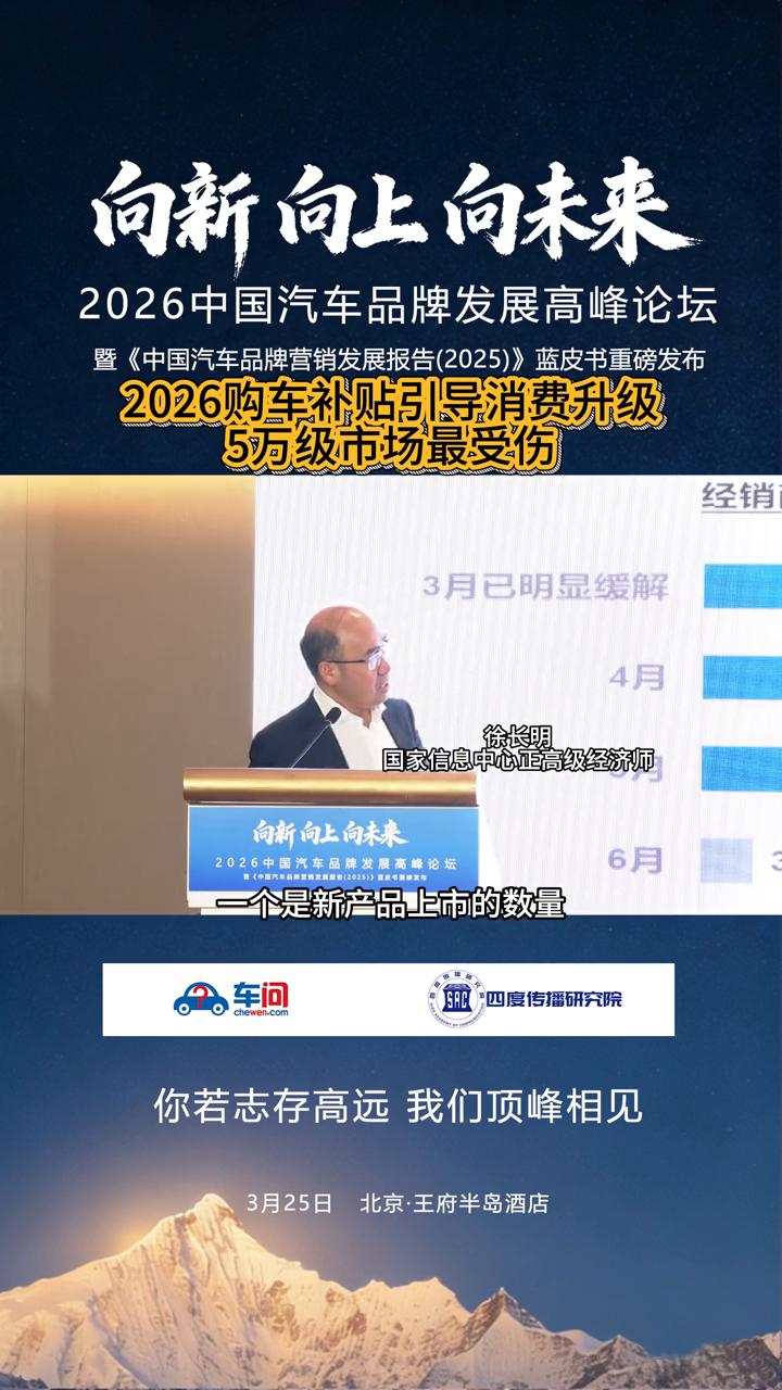 向新向上向未来,2026中国汽车品牌发展高峰论坛暨《中国汽车品牌营销发展报告(2025)》蓝皮书重磅发布。 国家信息中心正高级经济师。 去年一个人既可以享受报废旧车,买新车享受一次政策,还可以把旧车卖掉,买新车再享受一次,今年只能享受一个。这个政策调整就会使政策在同样金额下优惠更多的人群,有更多的人可以享受政策的好处。 今年预判不会出现去年这样,6月份之前敞开用,6月份之后很多地方就弱了,9月份之后就大部分减弱,11月份开始很多地方都没有政策。今年预判这个政策钱应该在全年可以得到持续,所以我觉得大家把买小车节约钱用于买中大型,那块量肯定要掉的,5万以下的销量肯定是要掉。今年因为补贴跟去年相比差距太大了。 所以总的来讲政策是优化的,在这个情况下预判今年全年应该比去年4月份之后可能会见好,但是一季度减少的量后边预判是补不回来的。所以现在预判的量比去年年底对今年预测量稍微的要减一点。 什么时候能起来市场?预判大概二季度初就开始。从供给侧有两个方面来助推好转。 ·一个是新产品上市的数量。现在调查到的数据二季度将有65款新车发布上市,去年的2026年一季度是26款,去年三季度、四季度分别39、27款新产品上市的,整个市场的推动还是比较明显的。 ·另外现在很多企业开始做促销,因为一季度销售形势问题也会有助于市场的好转,所以预判二季度开始市场会逐步的恢复到正常状态。