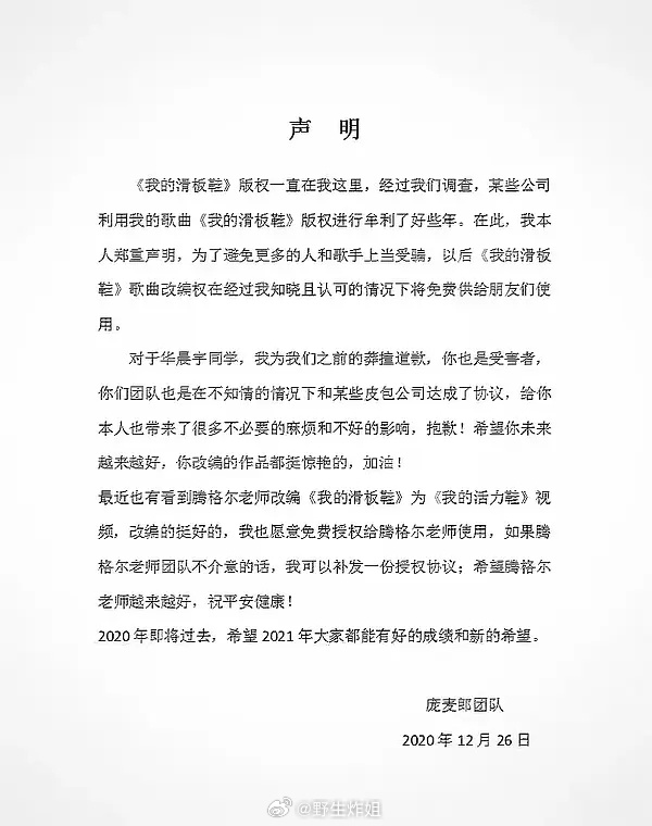 庞麦郎2013年将《我的滑板鞋》全部著作权独家签约给华数传媒,合同至2019年7月。