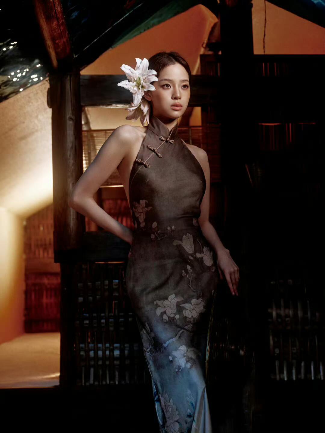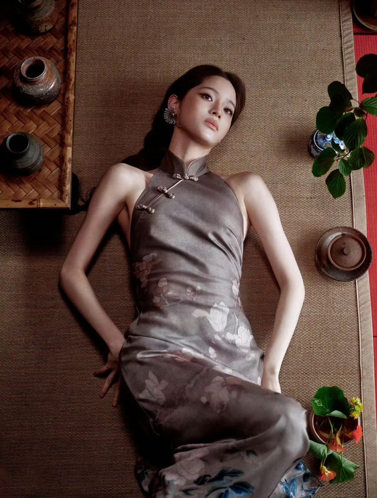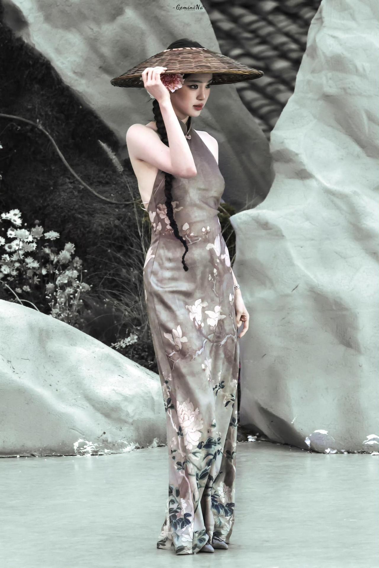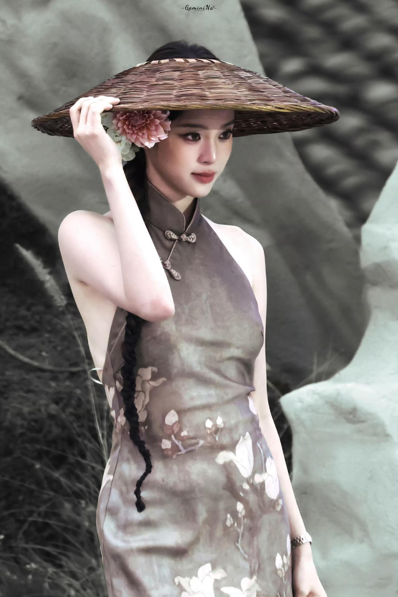 欧阳娜娜 席纹织着旧时光 青瓷与陶盏静卧 你把长发铺成墨色的河 枕着半盏未凉的茶烟 旗袍上的花,在光影里沉眠 每一片盘扣都扣着 江南的软与静 二、檐下 斗笠压着一朵大丽花 长辫垂过腰际 你抬手,把风挡在檐外 目光漫过石与草 像在寻一句未说尽的诗 衣摆扫过尘埃 把市井的喧嚣,都隔在身后 三、归处 从茶席到山野 从静卧到行走 你始终是那幅水墨 灰调里藏着粉与白 旗袍的花,斗笠的影 都是时光写给你的 温柔注脚