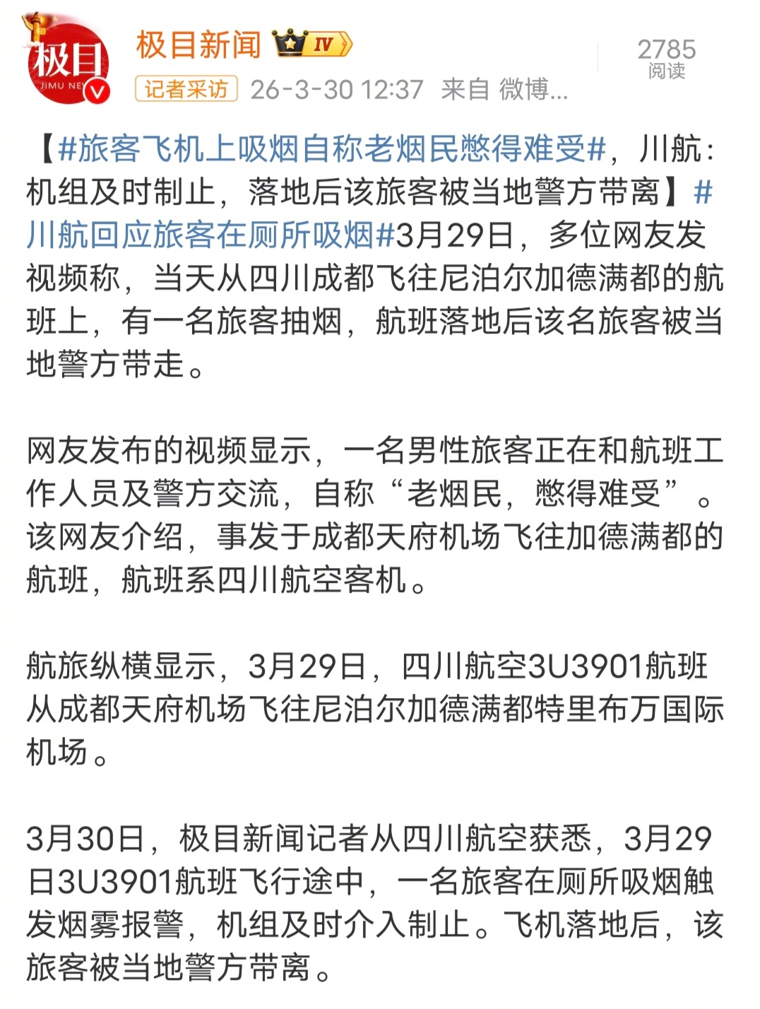 旅客飞机上吸烟自称老烟民憋得难受在飞机上抽烟,你这是老寿星吃砒霜——故意作死啊,