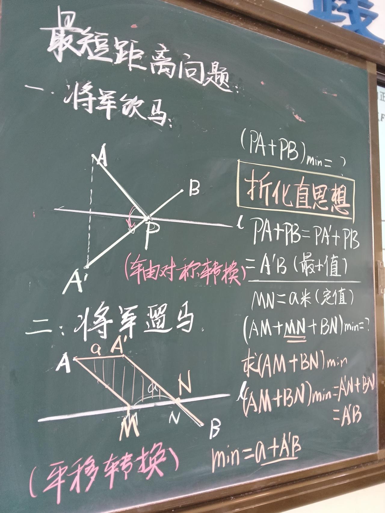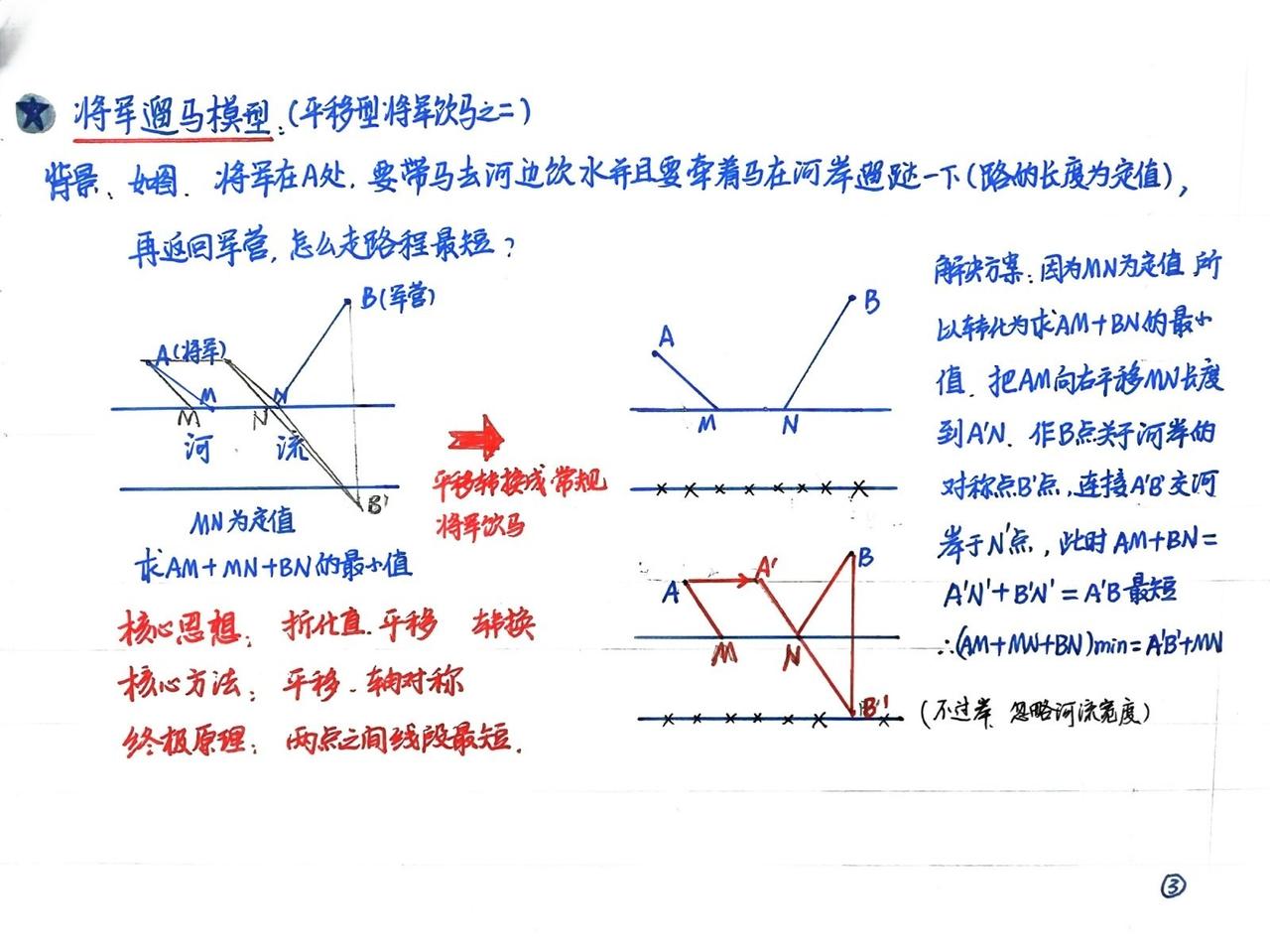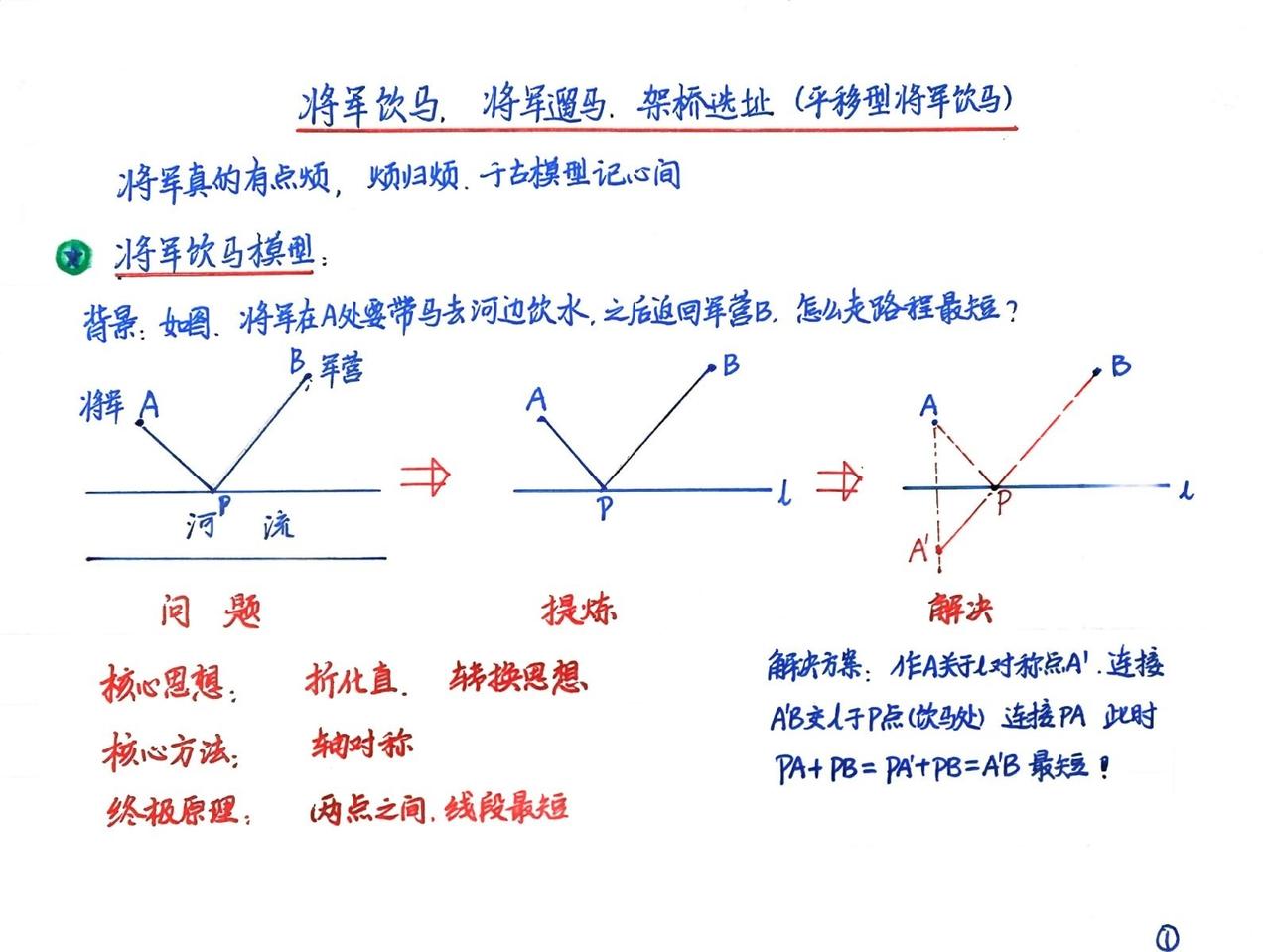 途虫数学教学日志,最短距离之将军饮马,将军遛马和架桥选址。这是初中数学最短距离问题的重要组成部分,核心思想是折化值的思想,核心解决理论是两点之间线段最短,核心转换方法是轴对称转换,平移转换。看上去挺复杂,其实并不难。教育 几何最短路径 万唯中考几何模型辅助线初中2026版数学全国通用几何解题技巧推荐