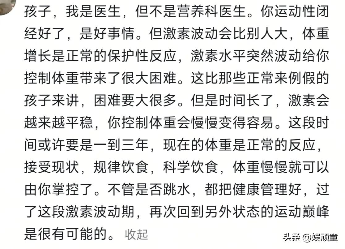 今天看到一位医生网友,给全红婵关于来例假以后,减肥难的一个分析,感觉挺有道理! 现在普遍营养比较好,多数女生都是12或者13岁来的例假,全红婵是17岁,算是比较晚了! 另外全红婵减肥需要控制饮食,跳水又需要力量,本身就很冲突,正常人只减肥就很难,对于全红婵而言,又瘦又要有力量,肯定更难!