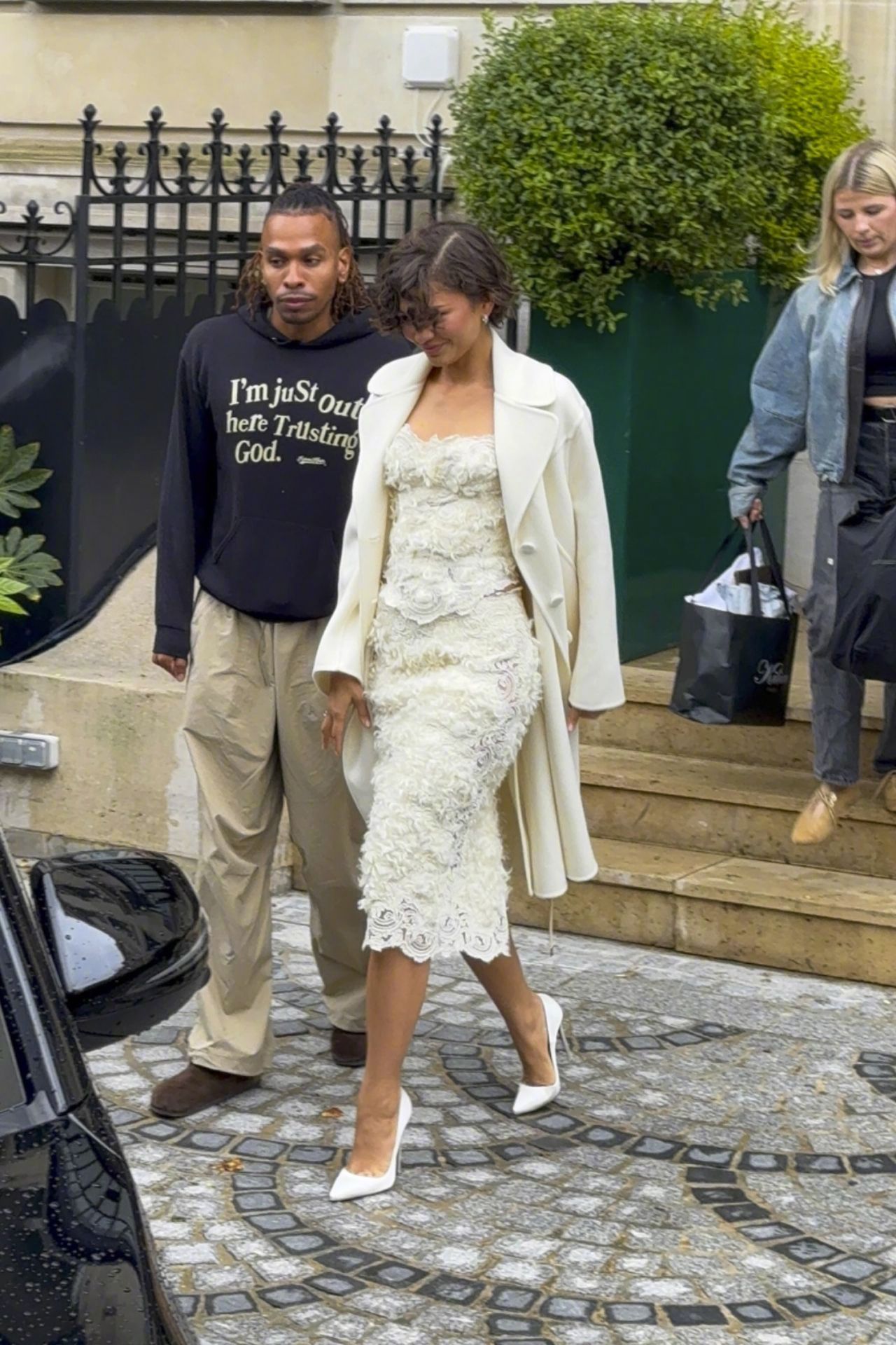 赞达亚新片《The Drama》跑宣传又一套新娘风造型。身穿的是 Ermanno Scervino 2026早秋系列一件纹理蕾丝连衣裙,裙长及膝,修身的底衬上层叠着精致的花卉贴花。面料宛如雕琢的蕾丝刺绣。外搭了一件白色修身大衣 ,简洁的线条与内搭的华丽质感形成平衡。脚穿白色 Christian Louboutin 高跟鞋,鞋型尖锐利落,拉长整体身形。佩戴的是 Messika 耳环 、 戒指。