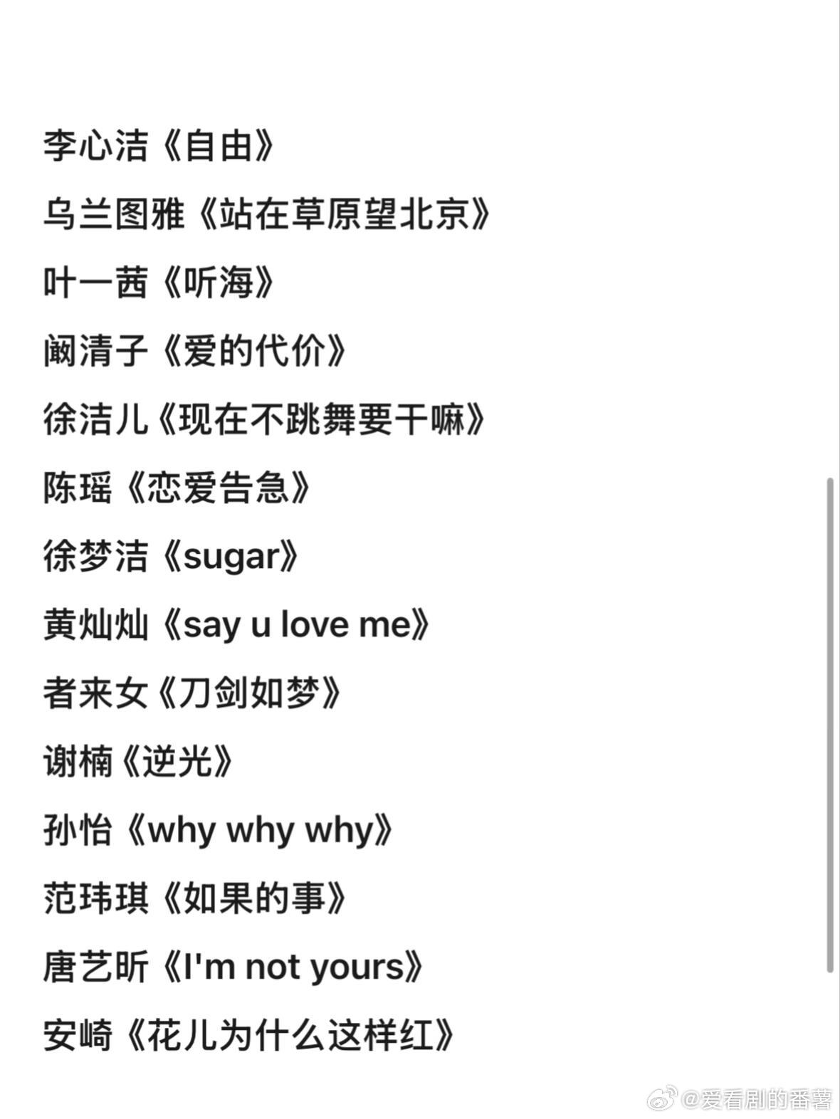 浪姐7/乘风2026·初舞台歌单(确定版)李心洁《自由》乌兰图雅《站在草原望北京》叶一茜《听海》阚清子《爱的代价》徐洁儿 《现在不跳舞要干嘛》陈瑶《恋爱告急》徐梦洁《sugar》黄灿灿《say u love me》者来女 《刀剑如梦》谢楠 《逆光》孙怡《why why why》范玮琪《如果的事》唐艺昕《I'm not yours》安崎《花儿为什么这样红》