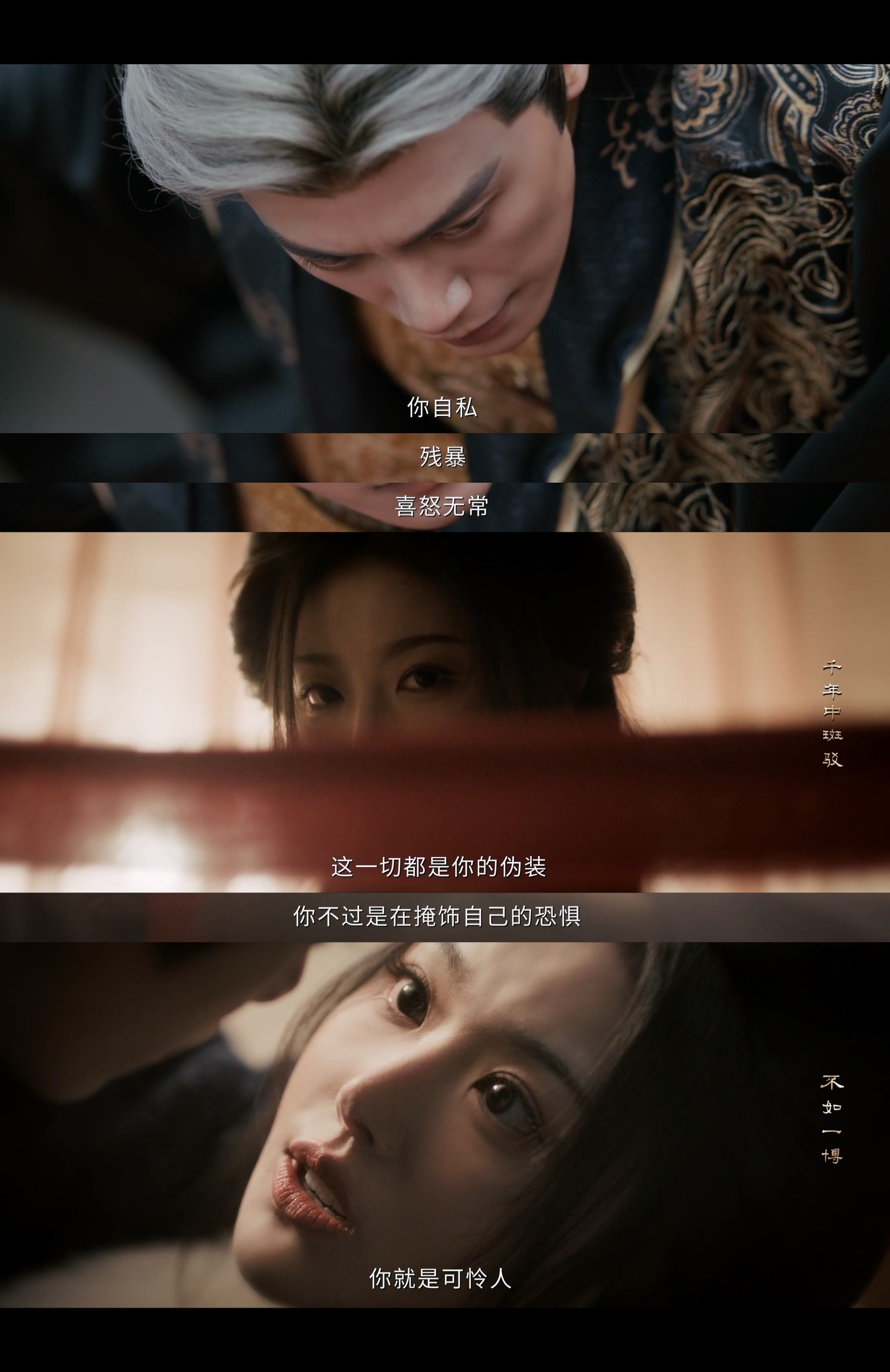 真正导致两人成为镜子两面的, 并不是一个在爱中成长一个缺爱,而是他们如何面对“过去伤痕”的方式。谢征选择了对外抗争,他在战场上杀敌,选择了将自己的愤怒和找寻真相的渴望,利刃只会对敌。他永远是大胤的忠臣,即便是朝堂上传来风言风语,他的选择也不是“武力解决”,而是直面皇帝让他心虚而退。而齐旻选择对内防御,他恐惧身边一切的人,因为忠心的嬷嬷看中的只是自己的血脉;养父一旦知晓自己的身份,等待他的只有死亡。他只能习惯性竖起防御的姿态,对所有本该亲近的人都怀有心防,甚至自己的亲子,因为关系越亲近,他会越怕。他习惯性试图将一切握在手心,甚至为了复位和反贼联手。