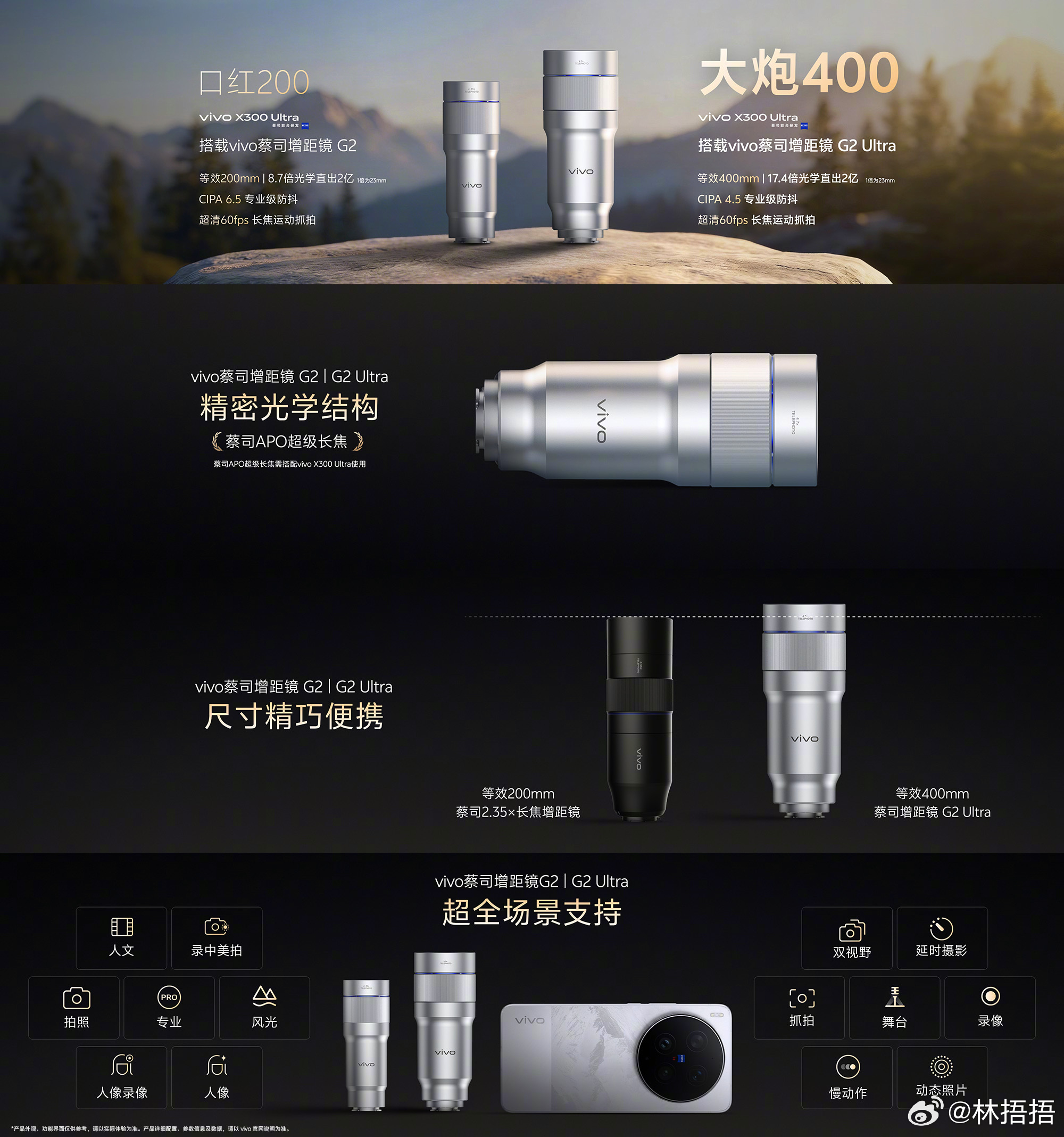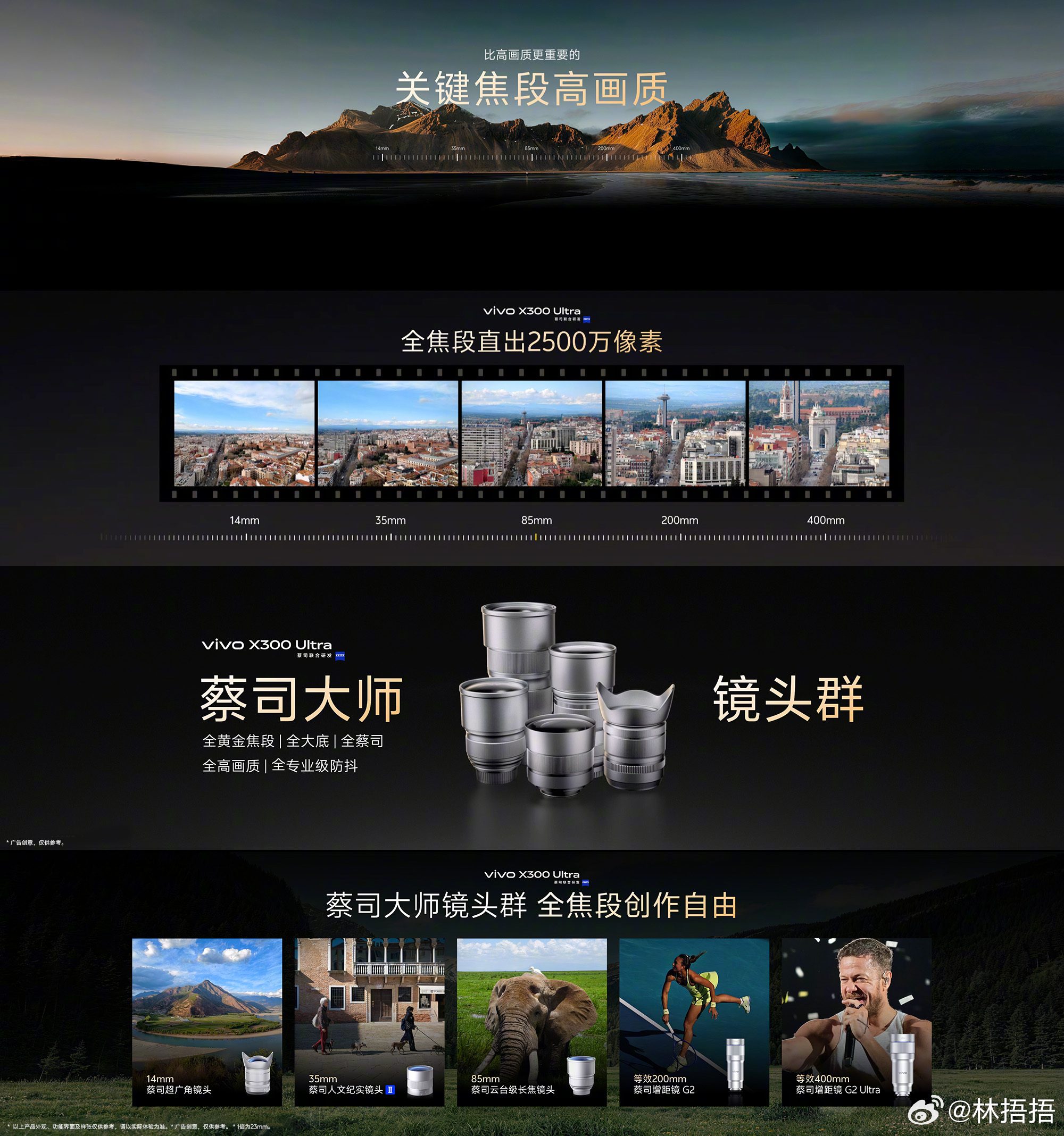 vivo X300 UItra蔡司大师镜头群:14mm蔡司超广角镜头,1/1.28英寸超大底,CIPA 6.0专业级防抖。35mm蔡司人文纪实镜头II,蓝图×索尼LYTIA 901,1/1.12英寸超大底,原生35mm光学直出;镀膜全面升级,搭配1G 6P镀膜。85mm蔡司云台级长焦镜头,蓝图×三星HP0,支持3° OIS光学防抖(CIPA 7.0级)。蔡司增距镜 G2 Ultra|等效400mm蔡司增距镜 G2 Ultra,2组15片精密光学结构,5片超低色散玻璃+1片玻璃非球面镜片。蔡司增距镜 G2|等效200mm蔡司增距镜 G2,约8.7倍光学直出2亿像素,叠加85mm镜头3°OIS光学防抖,实现CIPA6.5。久违的东西:全焦段直出2500万像素|从14mm到400mm,全焦段直出2500万像素。vivo X300 Ultra专业V单