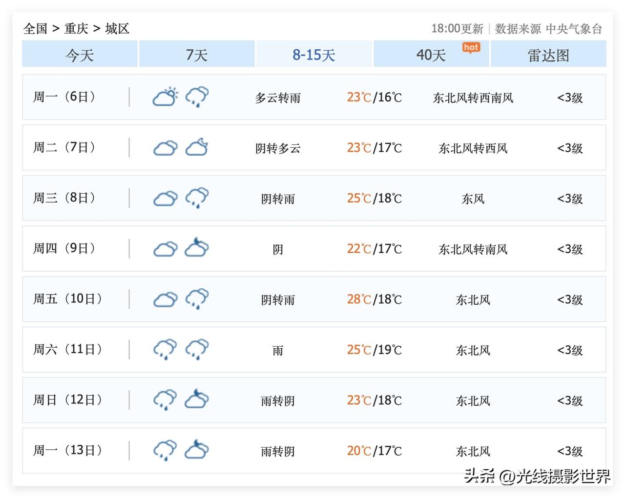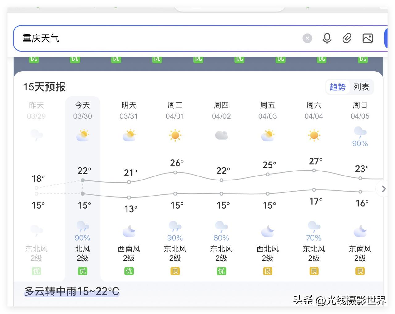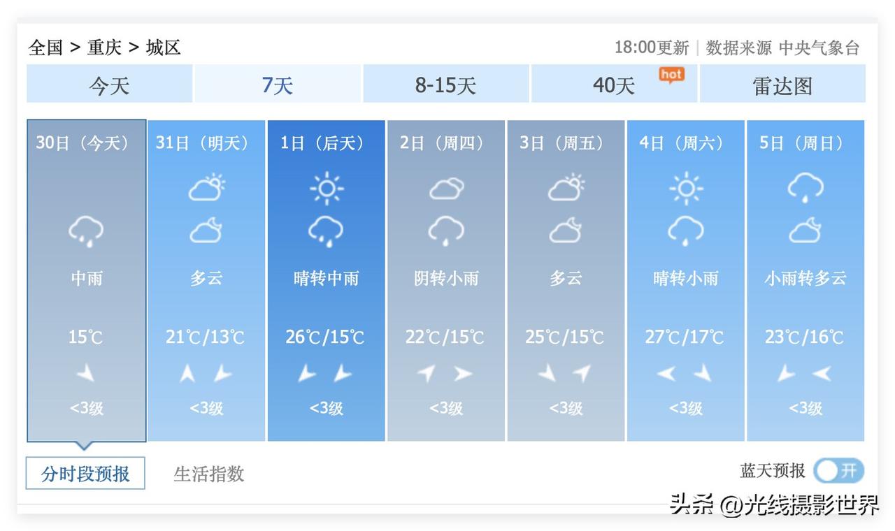 尽管中央气象台的最新重庆天气预报显示,3月31日到4月7日,重庆主城区,会经常出太阳……但是,苹果iphone手机自带天气预报显示,未来10天,重庆主城区,依旧是阴雨连绵,不是下雨就是阴天……所以,总体来说……4月1日到7日,重庆主城区,可能,也许还是会经常偶尔出现昏昏太阳…… 3月30日晚上8点,重庆主城区,忽然下起雨…… 总体来说,3月的重庆,半夜三更下雨是经常的时候,白天是阴天是经常的事情……白天出现昏昏太阳是偶尔的事情…… 所以,结合多个天气预报……估计啊,4月1日到7日,估计还是会经常晚上下雨,白天经常阴天,经常偶尔有昏昏太阳甚至日落……哎,最近,重庆的日出真的太罕见了!