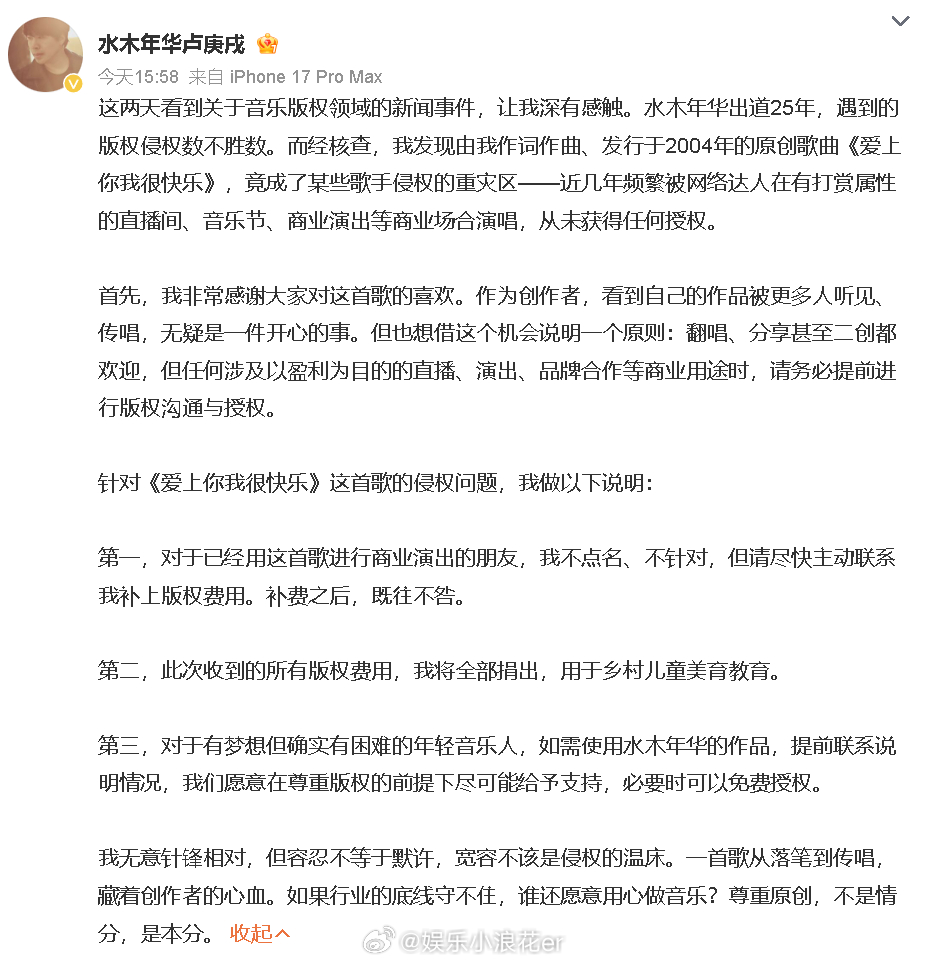 水木年华卢庚戌追讨版权费水木年华卢庚戌称被侵权 发文,称自己作词作曲、发行于2004年的原创歌曲《爱上你我很快乐》被严重侵权,对于此他表示:1、对于已经用这首歌进行商业演出的朋友尽快主动补上版权费用;2、收到的版权费将全部捐出;3、对于有音乐梦想但困难的人可以提前联系,必要时可以免费授权。