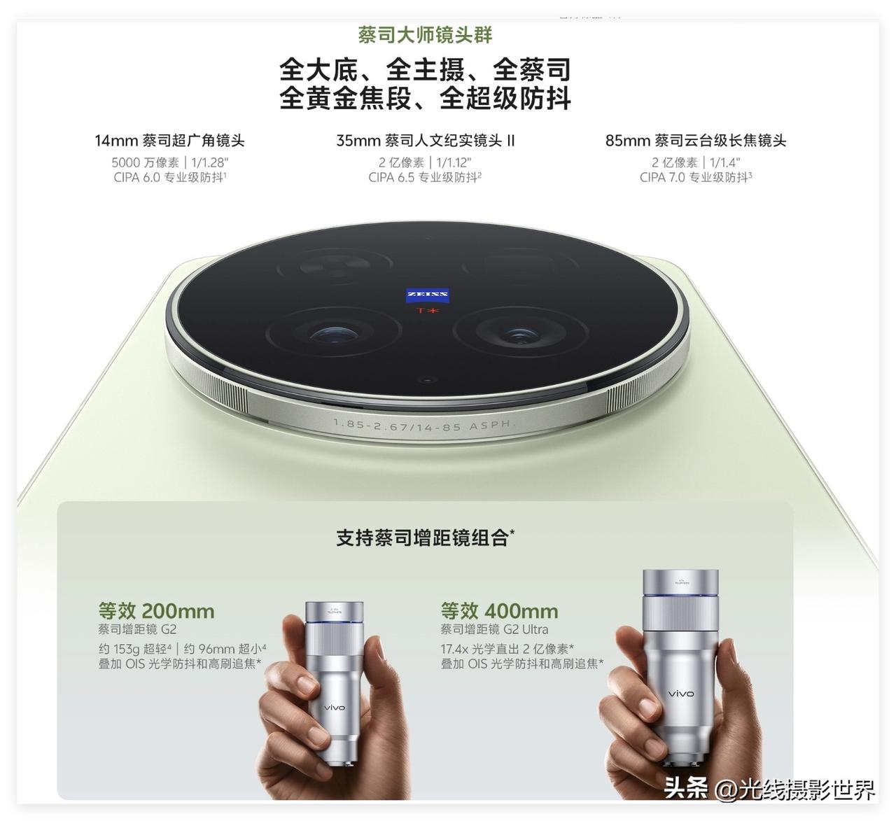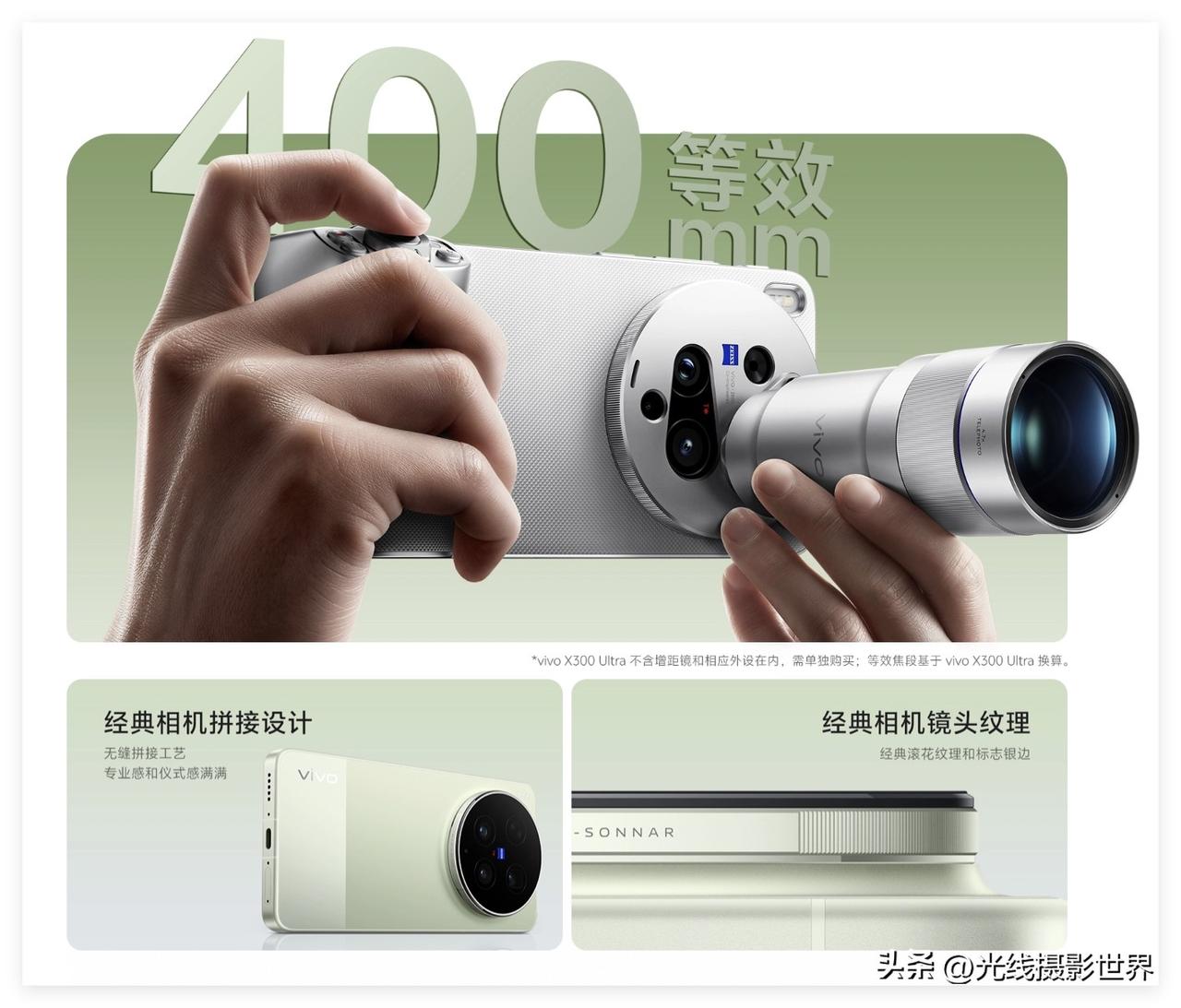 vivo X400Ultra,将会如何升级呢?!3月30日,VIVO X300U正式发布,最大的争议点,恐怕就是35mm主摄像头了吧?!是的,X300U的35mm主摄像头,已经用上了2亿像素……那么,X400U如果继续用2亿像素主摄像头,完全应该把主摄像头从35mm改为24-27mm的焦段啦! 为什么?!因为,2亿像素的24-27mm的主摄像头,裁剪后拍摄的35-50mm焦段的照片,应该会很不错! 就目前来说,主摄像头,还是24-27mm这个焦段更加好用,更加易用……尤其是对于短视频拍摄创作来说! 24mm到27mm这个焦段,对于大多数人和大多数拍摄场景来说,其实是更刚需的焦段…… 毕竟,所谓的35mm经典人文摄影,其实本质上来说,就是比较小众的! 当然,对于已经拥有苹果iphone的用户来说,对于已经拥有24-27mm这个焦段的用户来说,再买一个VIVOX300U,多拥有一个原生的35mm焦距镜头……也是很好的! 好吧,如果是2亿像素的影像传感器,我觉得,更适合搭配24-27mm这个焦段,而不是搭配35mm这个焦段…… 因此,2027年春天,全新的VIVO X400Ultra,最大的改变,最大的不同,可能就是主摄像头将会回归24-27mm这个焦段! 至于说X400Ulta的长焦镜头……估计不会有什么实质性的提升…… 至于说X400Ultra的超广角镜头……估计也不会有什么实质性的提升…… 嗯,最后,也许VIVO X400系列的前置摄像头,都会使用方形摄像头吧?!光线摄影世界曾兰谈天说地