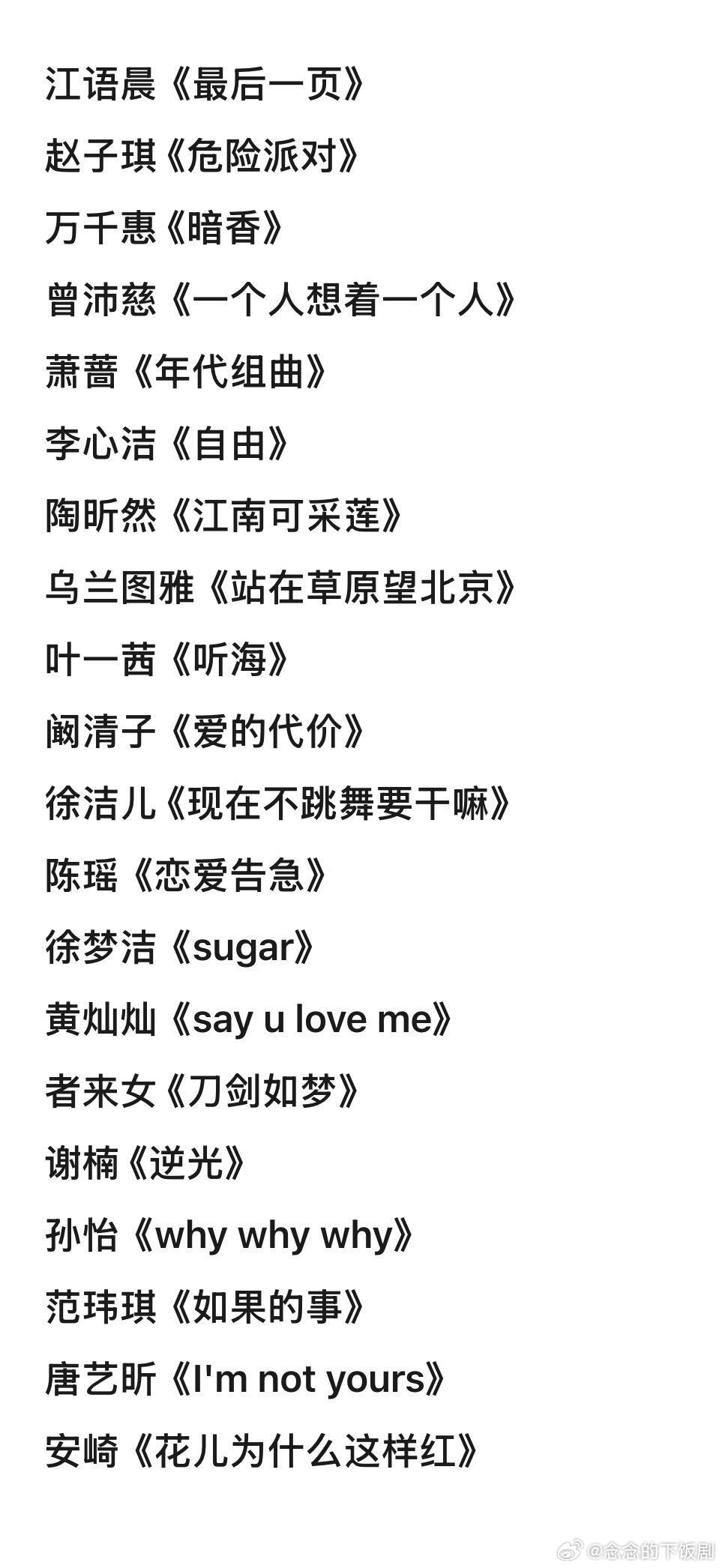 浪姐7/乘风2026初舞台歌单持续更新浪姐7初舞台歌单(确定版)江语晨《最后一页》赵子琪《危险派对》万千惠《暗香》曾沛慈《一个人想着一个人》萧蔷《年代组曲》李心洁《自由》陶昕然《江南可采莲》乌兰图雅《站在草原望北京》叶一茜《听海》阚清子《爱的代价》徐洁儿《现在不跳舞要干嘛》陈瑶《恋爱告急》徐梦洁《sugar》黄灿灿《say u love me》者来女《刀剑如梦》谢楠《逆光》孙怡《why why why 》范玮琪《如果的事》唐艺昕《I'm not yours》安崎《花儿为什么这样红》持续更新
