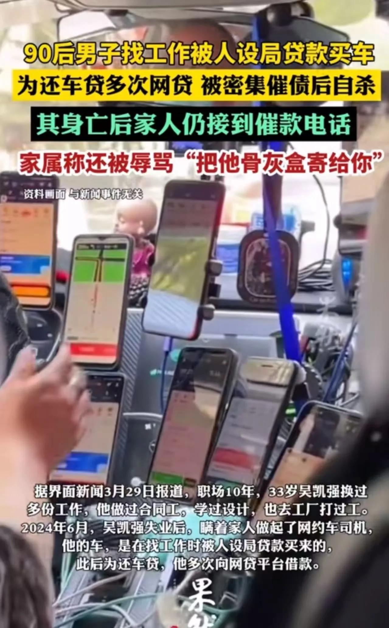 东阳一名33岁男子,把车停在母亲墓旁,喝下农药、割腕自尽,留下“我不想死但扛不住”的遗书,同时背着19万车贷、5笔网贷、几十条催收威胁短信,这不是简单轻生,是被一整套链条直接压垮。 事情从一条招聘开始,“司机月薪保底1万2,公司配车”,对一个刚失业、要养家的成年人来说,这种话就是钩子、就是命门,一看就抓住人心,可人一到现场,岗位没了,变成卖车的“总监”,合同一摞一摞递过来,人还没反应过来,签字就完成了,工作没入职,债先到位。 车标价14万,被做成贷款19万,60期,每月3194元,这种结构不是失误,是设计好的利润结构,车是壳,贷款才是肉,他一旦签字,角色直接从求职者变成负债人,关系瞬间翻转。 然后收入彻底崩塌,他只能自己跑顺风车,收入波动极大,好时四千多,差时一千出头,车贷像闹钟一样每月准时扣,这种现金流结构,本身就注定扛不住,一旦补不上,就开始借网贷。 五笔网贷叠加,利息滚动,这一步基本就是锁死局面,钱不是用来发展,是用来填坑,越填越深,接着催收登场,电话轰炸、短信轰炸、亲友连坐,这套流程在很多人身上重复过无数次。 关键在这一步,催收直接越界,发威胁信息,公开家庭成员身份信息,点名父母、姐姐,甚至用“十六七岁的人会做什么谁也保证不了”这种话去恐吓,这已经不是催债,是赤裸裸的威胁,是在拿人的安全感做筹码。 他开始隐瞒家人,说自己被调外地,其实住在没有卫生间门的小屋里,这种细节很扎人,一个成年人,不敢回家,不敢说实话,每天跑车、接单、接催收电话,外面是路,里面是洞。 2025年10月,催收全面升级,短信开始辱骂、恐吓、威胁家人,他扛不住了,这种压力不是一天两天,是连续的、无出口的压迫,人被困在里面,精神会被一点点磨掉。 他给姐姐发邮件,说“我不想死,但扛不住了,他们要找你们”,这句话已经很直白了,人不是想结束,是找不到活路,他最后选择去母亲墓旁结束生命,这个选择本身就是绝望的极点。 更冷的是,他去世5天后,催收还在发短信,甚至说“把骨灰盒寄给你”,这种行为已经完全脱离人性,连死亡都不能让链条停下,这不是个体问题,是整个体系在失控。 一开始警方没有立案,理由是“催收不构成威胁”,直到舆论炸开、律师介入,2026年2月才刑事立案,这个时间差,本身就说明问题,规则跟不上现实,后果却由普通人承担。 这件事最刺眼的地方,不是一个人被骗,而是流程太熟练了,从招聘诱导、贷款包装、收入错配、网贷叠加、催收逼迫,一环扣一环,像流水线一样运转,任何一个普通人,只要踩进去,很难全身而退。 还有人说“性格太老实”,这话站不住,人不是输在胆子,是输在信息差和结构性陷阱,对方是团队、是脚本、是算好的模型,你拿个人经验去对抗,本来就不对等。 “高薪司机、公司配车”这种广告,现在看就该直接拉黑,它本质不是工作,是金融产品,是把人引进债务的入口,很多人以为是机会,其实是门口。 更关键的是催收这条线,电话轰炸、骚扰家人、泄露隐私、威胁未成年人,这些行为如果不被严格认定为刑事问题,那就等于默认这种手段可以继续存在。 这个案子用一条命换来立案,这个代价太重了,但它也把问题撕开了:招聘可以变贷款,贷款可以变网贷,网贷可以变威胁,人最后被逼到极端,这条链必须被截断。 不截断,下一个人还会重复。