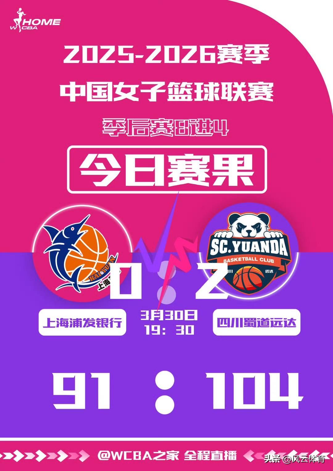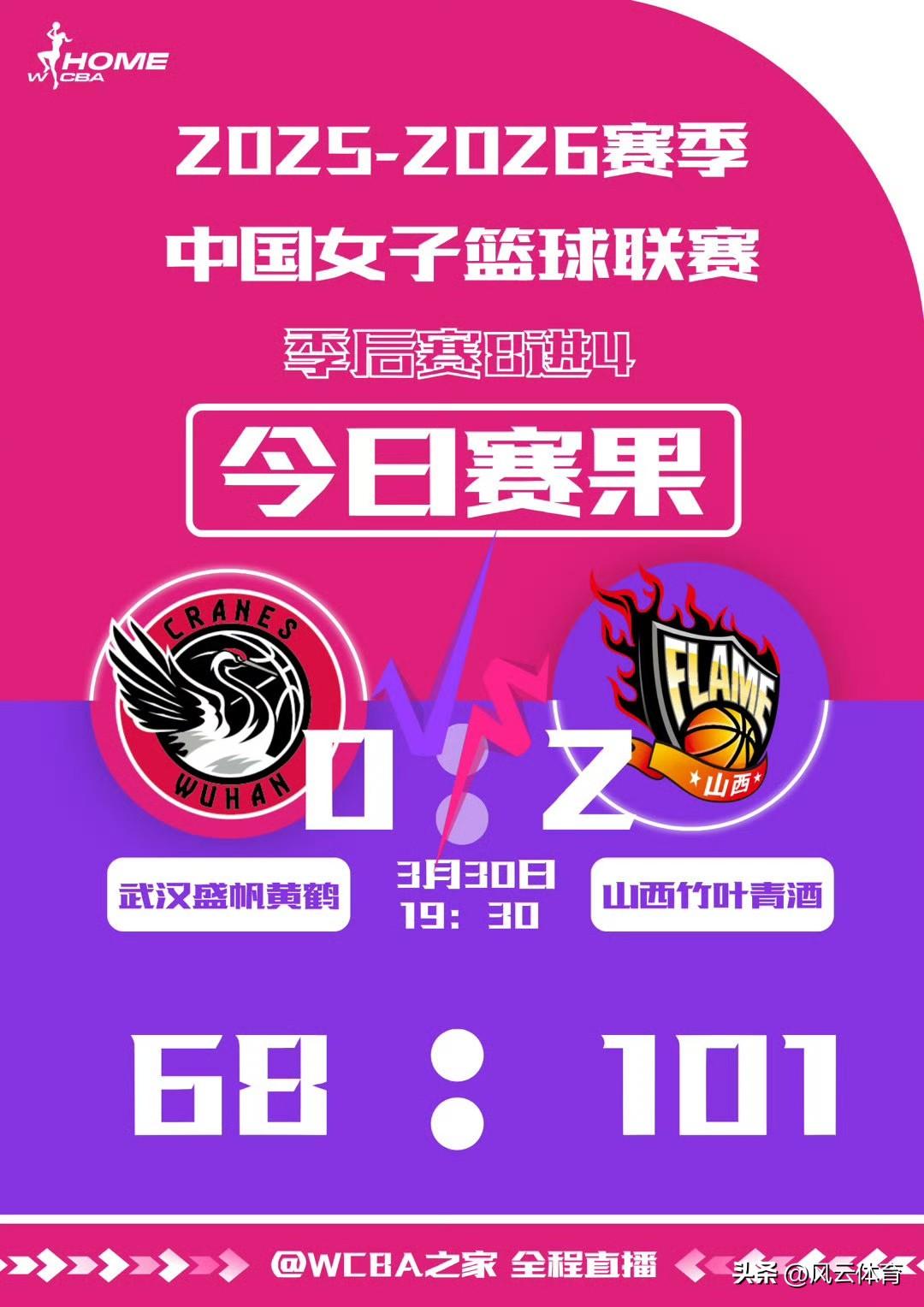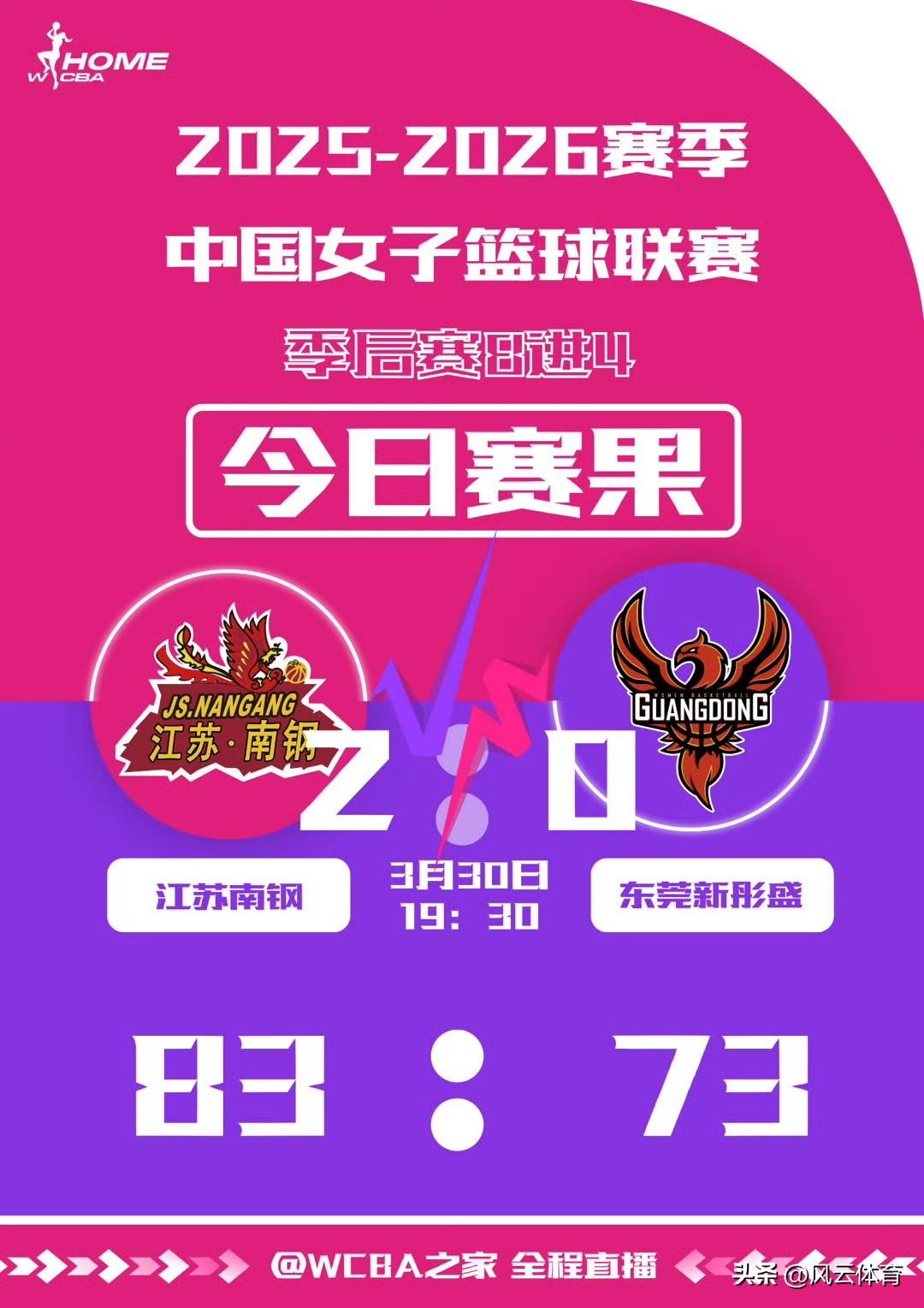 卫冕冠军折戟!晋川苏闯入WCBA四强! 在刚刚结束的2025 - 26赛季WCBA季后赛8进4第二轮比赛中,江苏女篮上演以下克上好戏,以83:73击败广东女篮,以大比分2:0淘汰卫冕冠军,成功挺进四强! 另外三场比赛里,山西女篮客场以101:68的大比分战胜武汉女篮,以2:0的战绩拿到四强入场券!四川女篮以104:91战胜上海女篮,同样以2:0的成绩晋级四强! 山东女篮在主场以86:80战胜新疆女篮,将总比分扳成1:1平。双方将在新疆争夺最后一张四强门票!