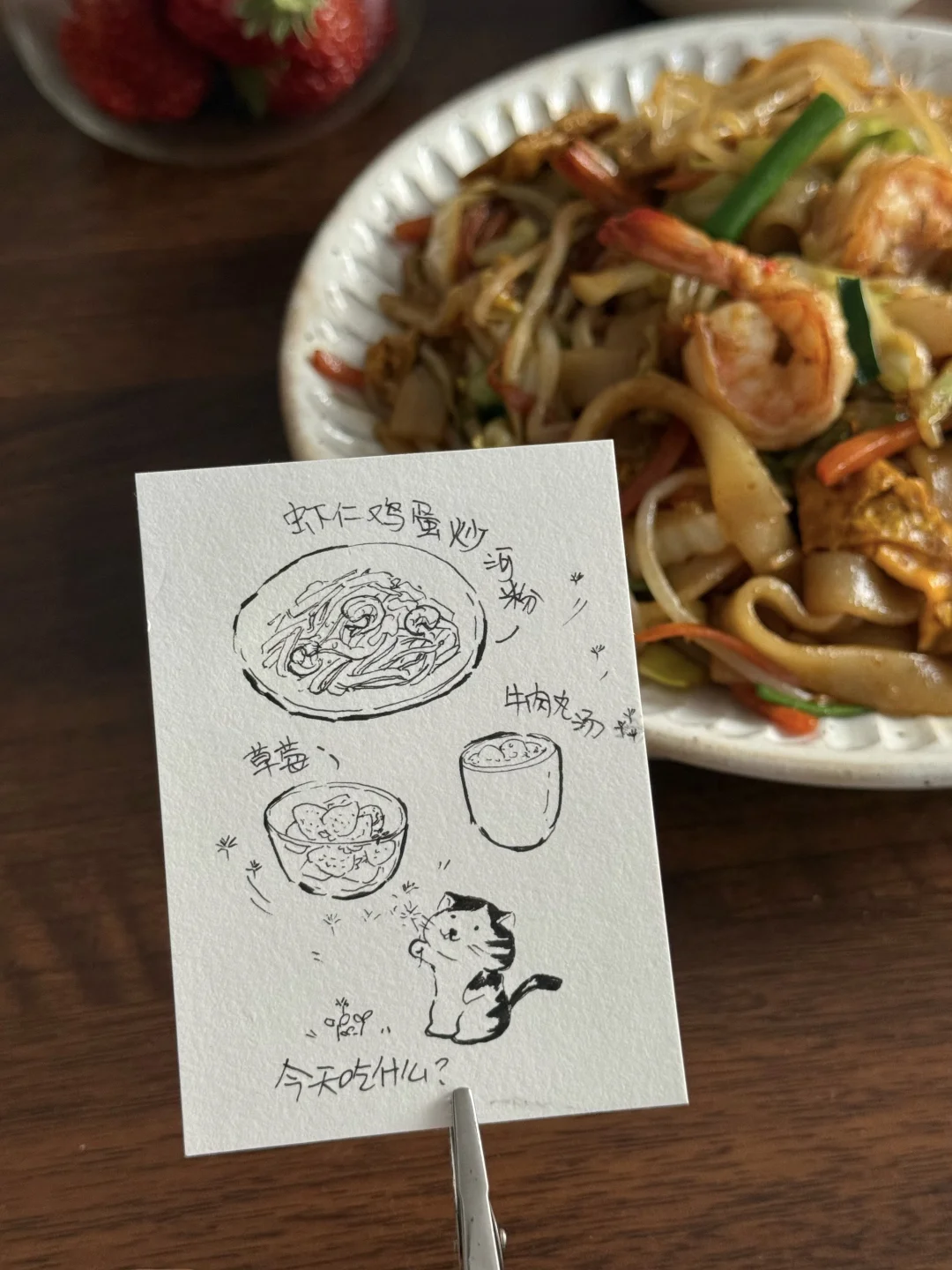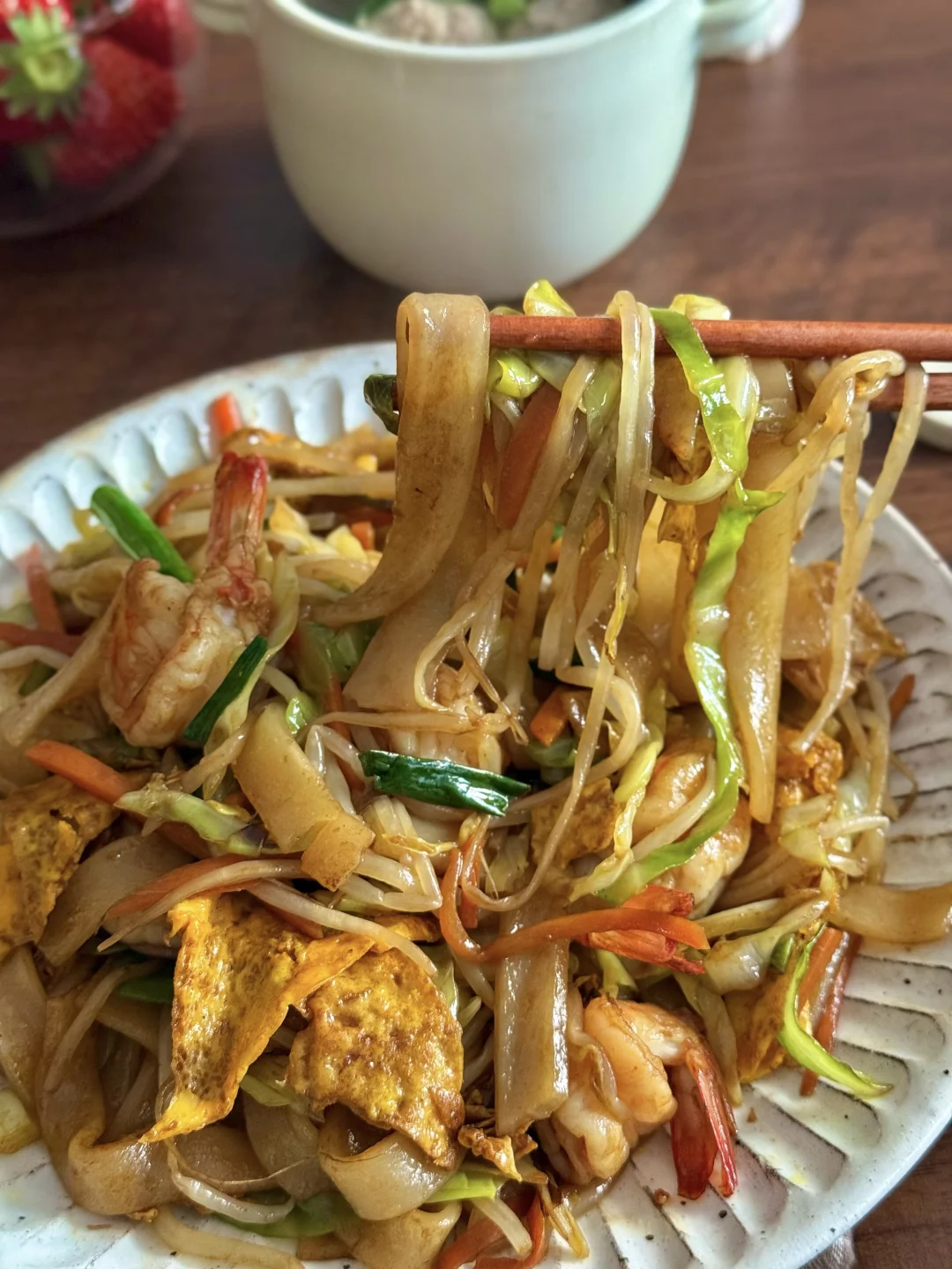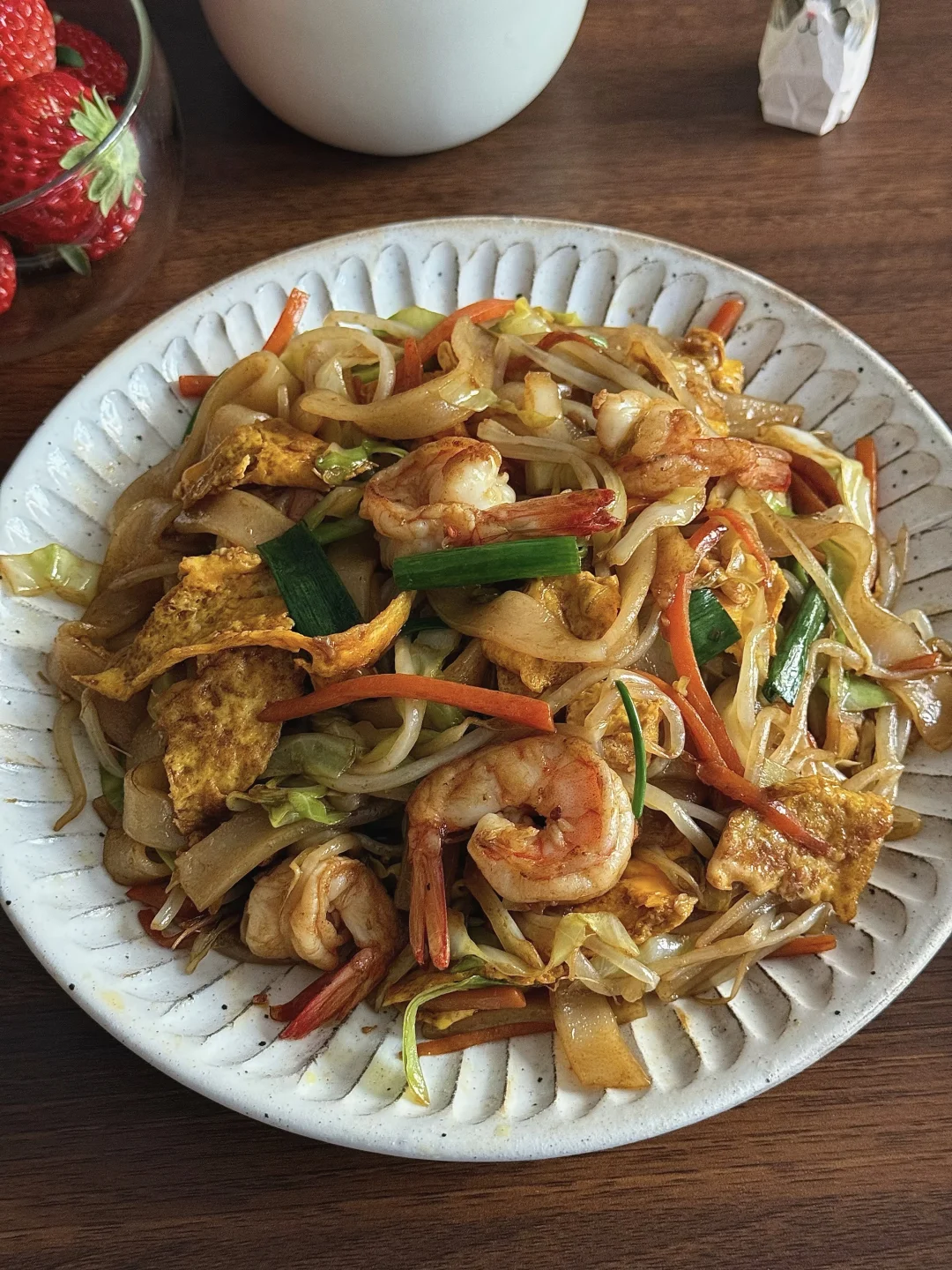 🥙美食分享:虾仁鸡蛋炒河粉、牛肉丸汤、草莓 整了盘锅气十足的炒河粉,真的香迷糊了! 河粉裹满酱油香,虾仁弹嫩,,配着脆生生的豆芽和包菜,一口下去超满足。 简单配了碗牛肉丸汤,刚好中和炒河粉的浓郁。 最后再啃几颗甜草莓,一人食的快乐这不就来了嘛~