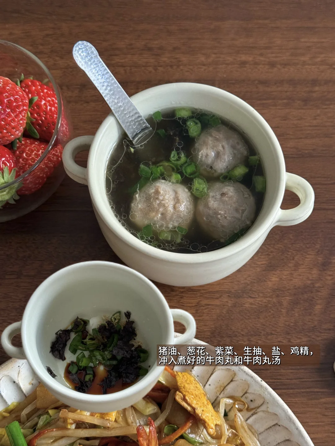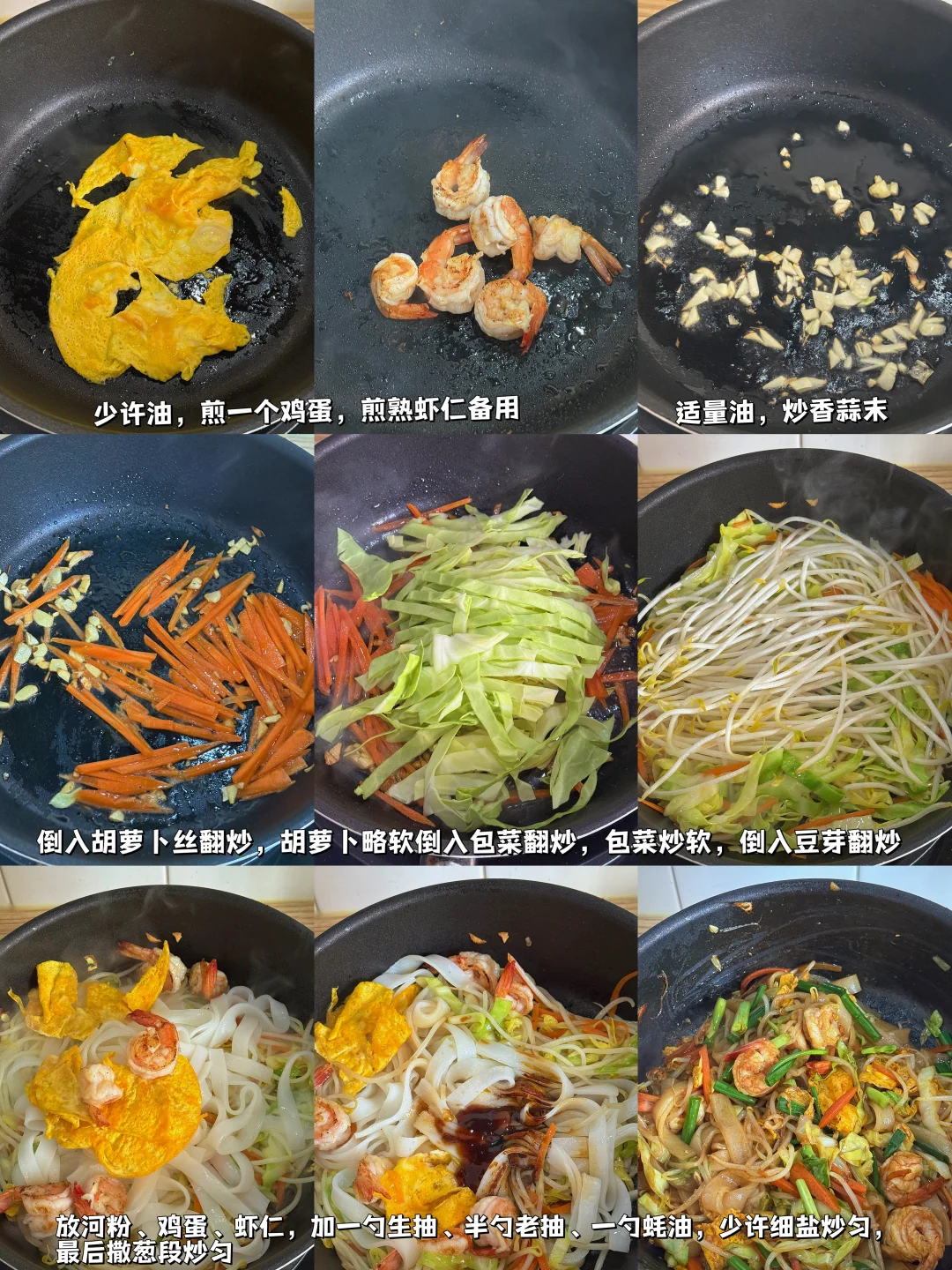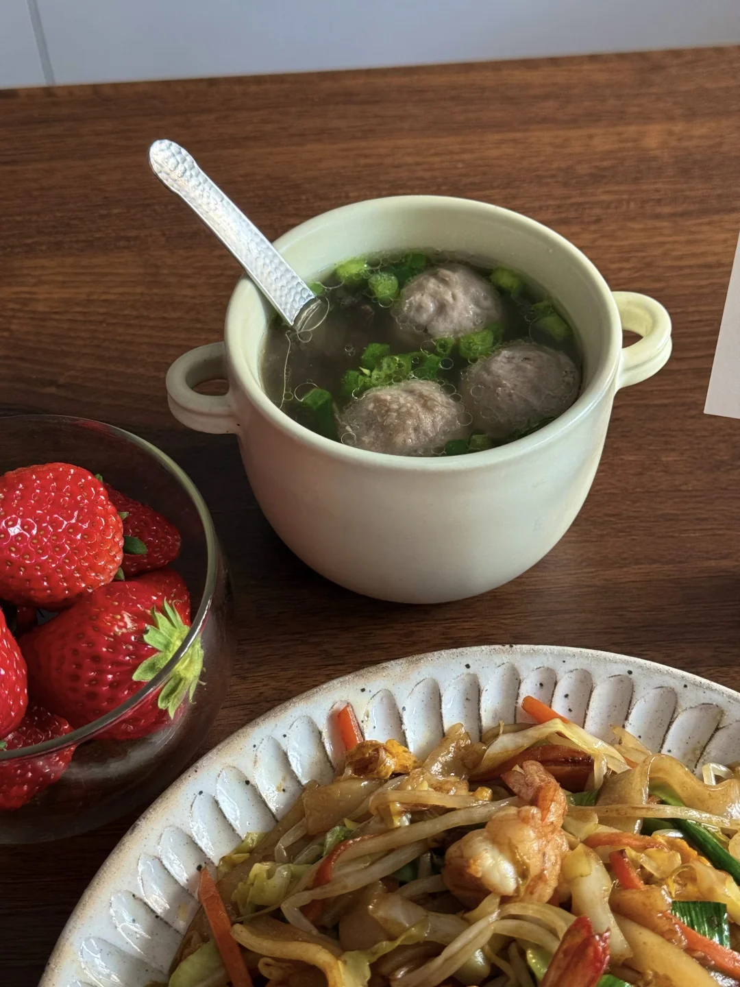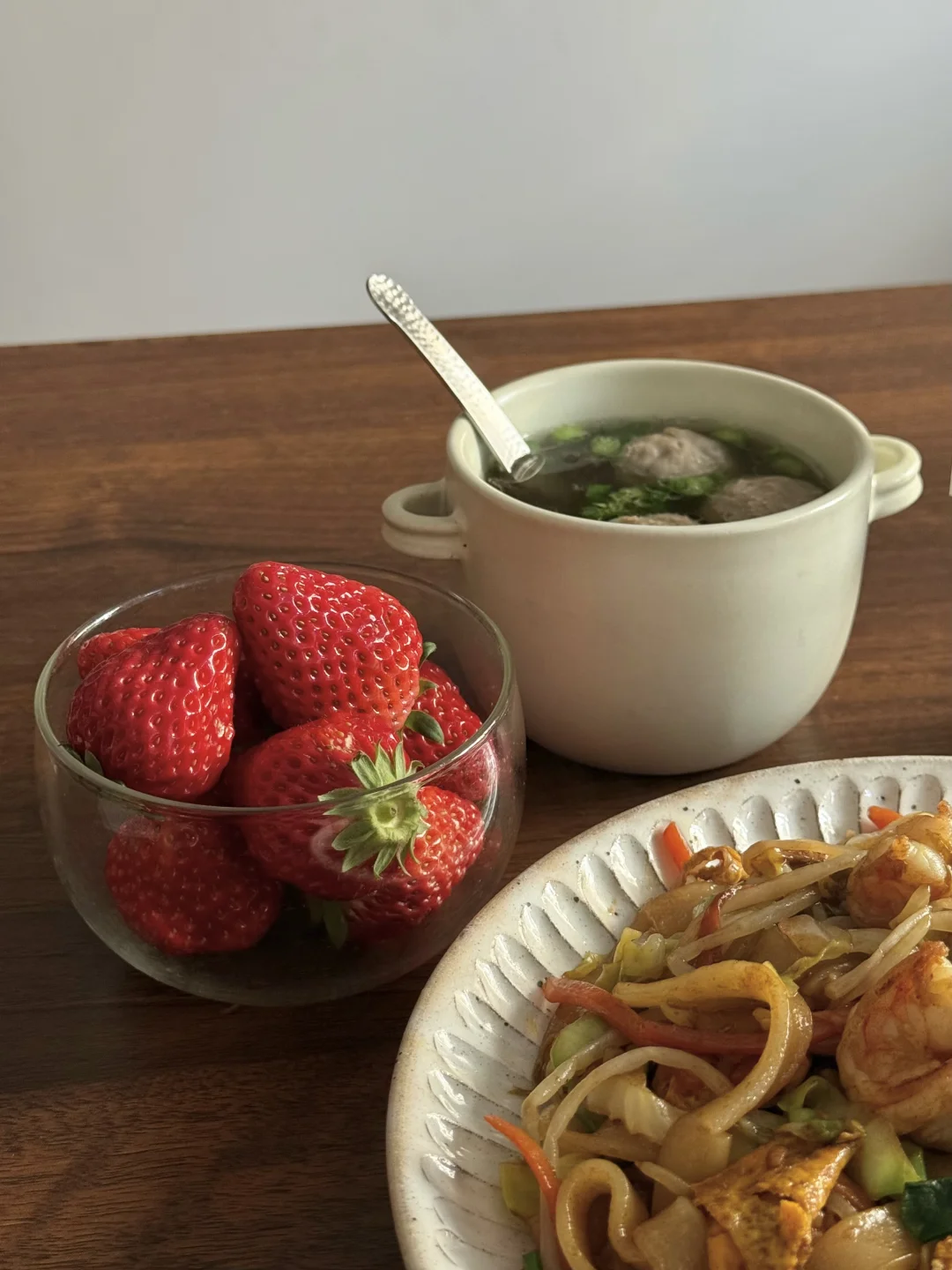 🥙美食分享:虾仁鸡蛋炒河粉、牛肉丸汤、草莓 整了盘锅气十足的炒河粉,真的香迷糊了! 河粉裹满酱油香,虾仁弹嫩,,配着脆生生的豆芽和包菜,一口下去超满足。 简单配了碗牛肉丸汤,刚好中和炒河粉的浓郁。 最后再啃几颗甜草莓,一人食的快乐这不就来了嘛~