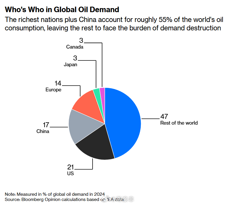 美国、中国、欧洲、日本和加拿大约占全球石油消费量的 55%, 这意味着这些国家有能力支付更高的油价。