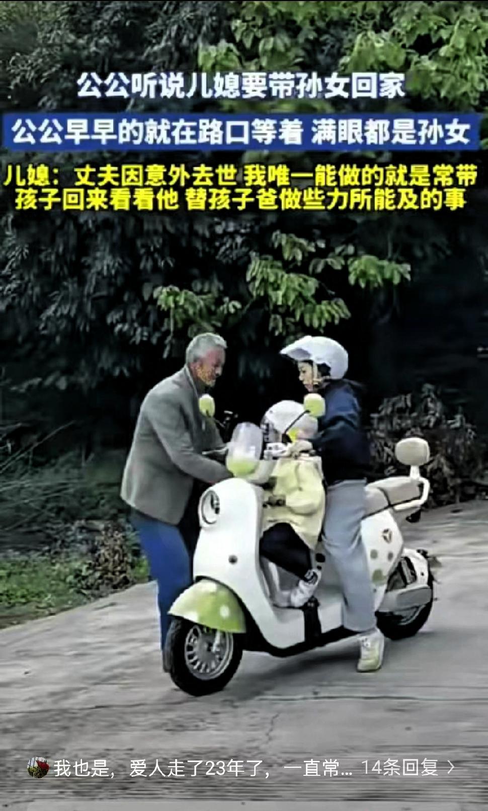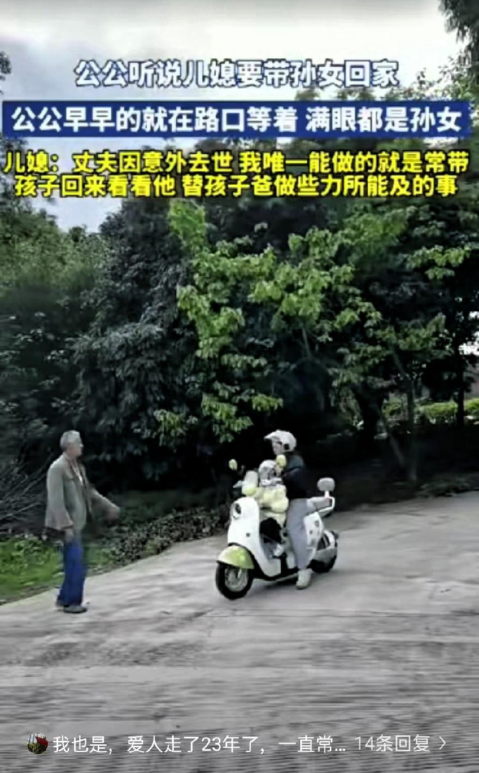泪目了!四川,老人的独生子因意外去世,在得知儿媳将带着孙女回乡来探望自己后,提前几小时就守在路口等候。 老人的独子因意外去世,家里一下子少了主心骨,晚年生活也变得冷清孤寂。按常理,丈夫不在了,儿媳与婆家的关系很容易慢慢疏远,可这位儿媳并没有这样做,依旧把老人当作亲人,时常带着女儿回乡探望,用行动维系着这份亲情。 得知儿媳和孙女要回来,老人在家根本静不下心,提前几个小时就来到村口路口等候。他安静地站在路边,目光一直望着进村的方向,没有过多动作,却满是藏不住的期盼。对一位失去独子的老人来说,儿媳和孙女已是他最亲近的人,也是生活里重要的精神寄托。 当车驶来,老人上前轻轻抱起孙女,脸上露出了平静的笑容。没有激烈的情绪,却能让人感受到久违的温暖。从法律层面来说,儿媳对公婆并没有法定赡养义务,她完全可以选择自己的生活方式,可她依旧坚持常回家看看,只想替逝去的丈夫尽一份心意。 这份情感无关强制责任,更多是出于本心与情义。老人的等待,是对亲情的朴素渴望,也是独居生活里难得的期待。儿媳的坚守,则是对家庭情义的珍惜,也是对老人无声的安慰。 生活里总说血浓于水,但真正长久的亲情,往往离不开彼此的惦记与付出。简单的相聚,短暂的陪伴,对老人而言就是最好的慰藉。