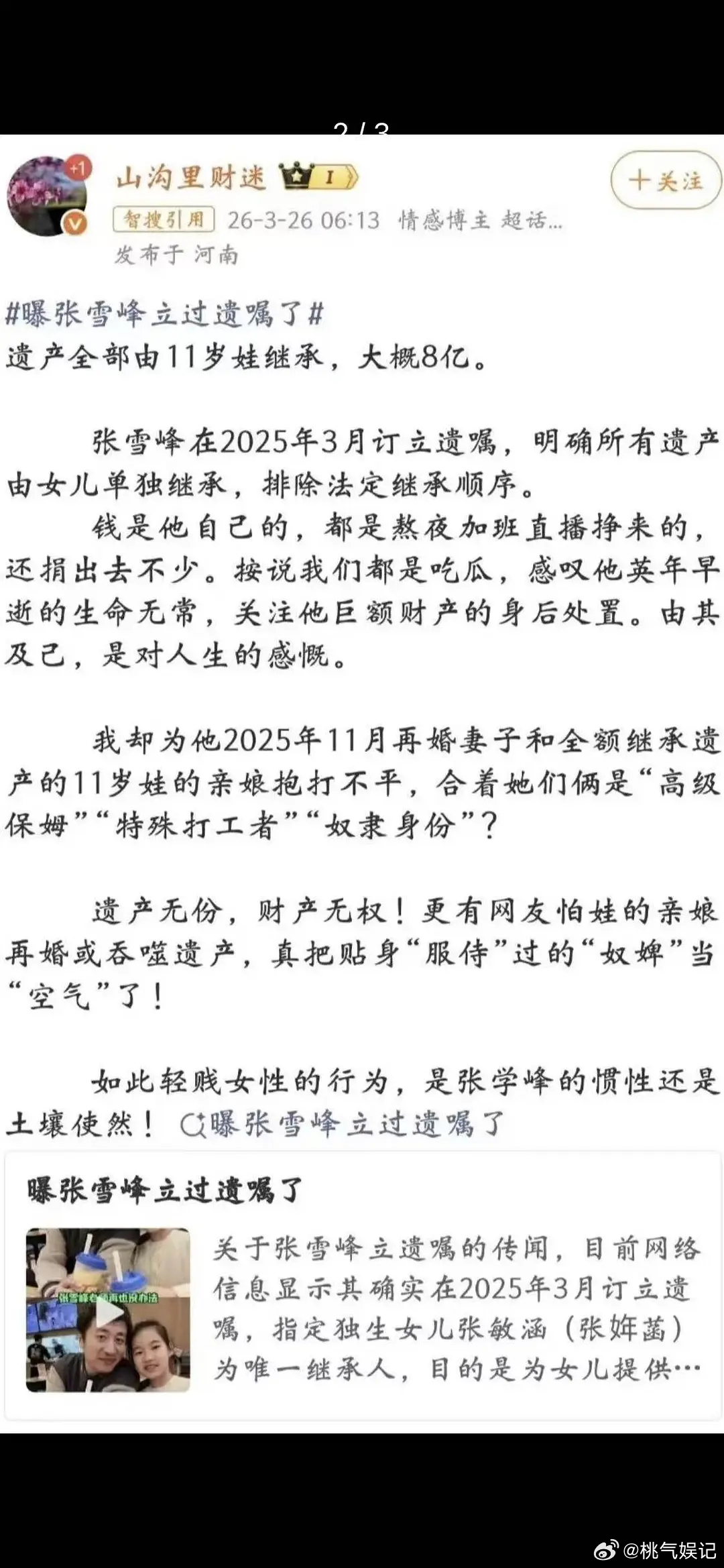 略懂书生 2 2026-03-31 13:08 记得一个剧有个剧情,兄弟二人一起打拼,到五十几岁有十几个亿的身家,哥哥娶了一个比他年轻15岁的妻子后边生了一个女儿,女儿十岁的时候哥哥病逝,病逝前遗嘱资产给弟弟,妻子要挣家产,弟弟说,不会把兄弟奋斗的结果给女方,因为女方会拿这笔钱去找一个年轻的男人再生活。所以张雪峰把钱留给妻子干什么?让妻子有钱了以后找男人?