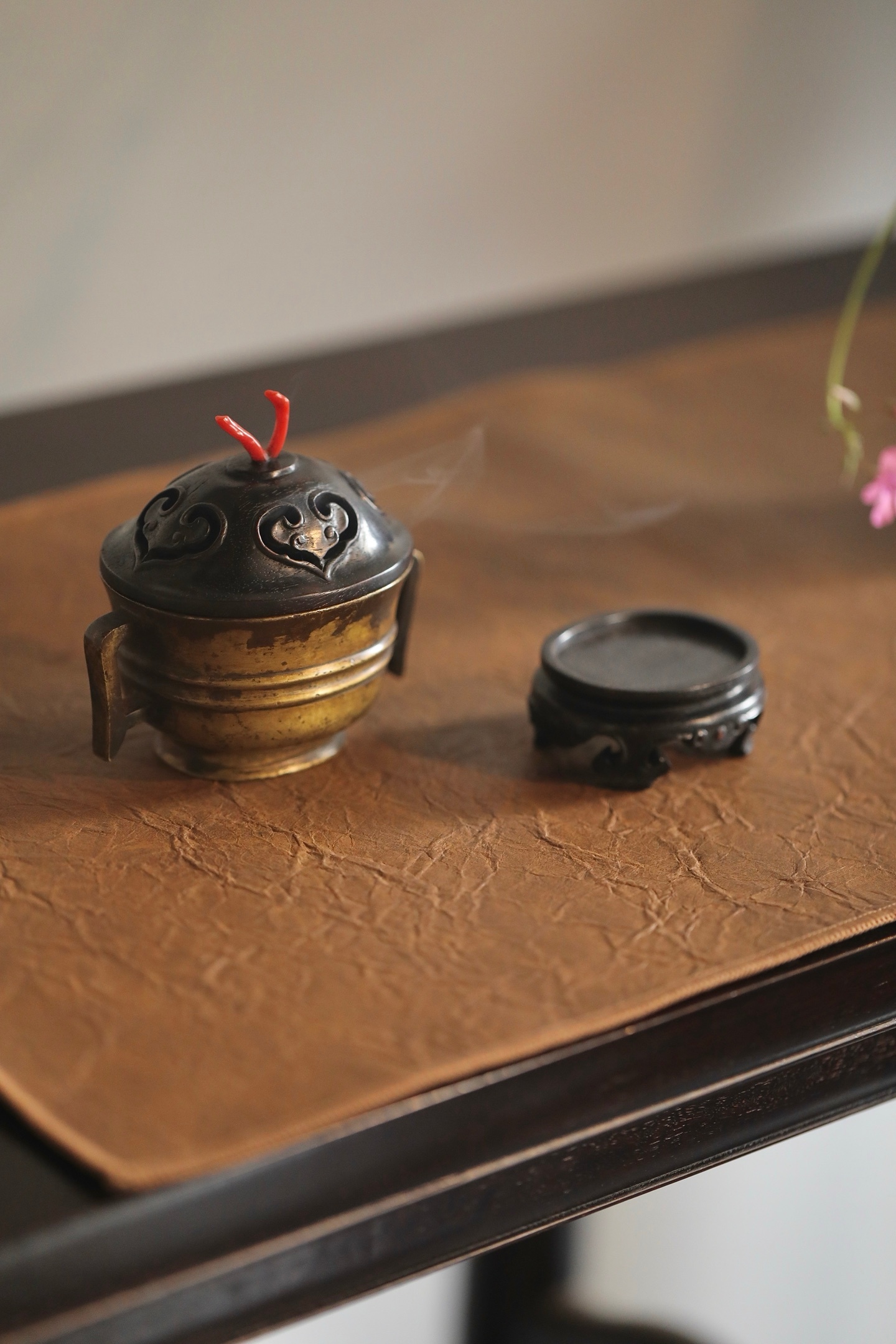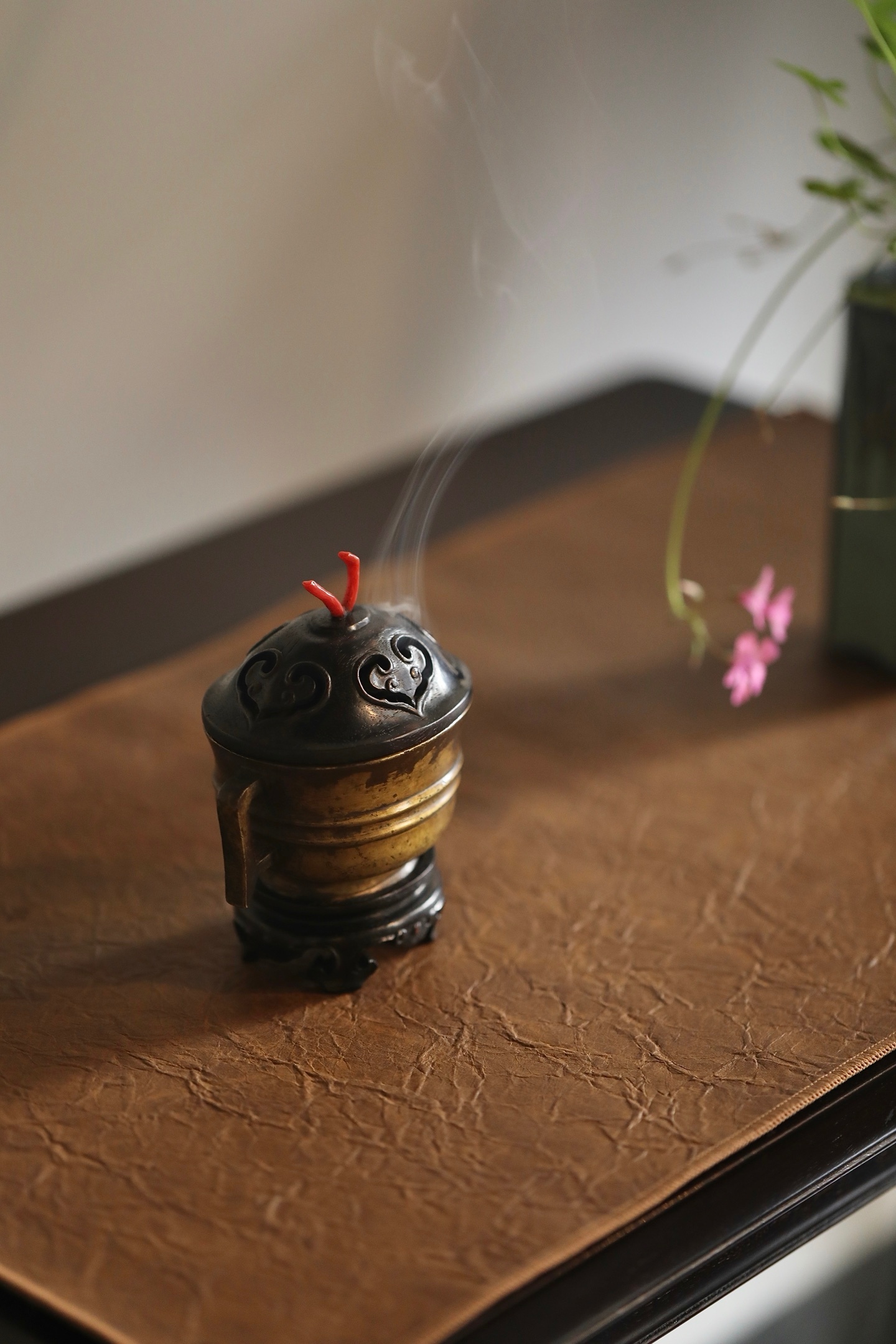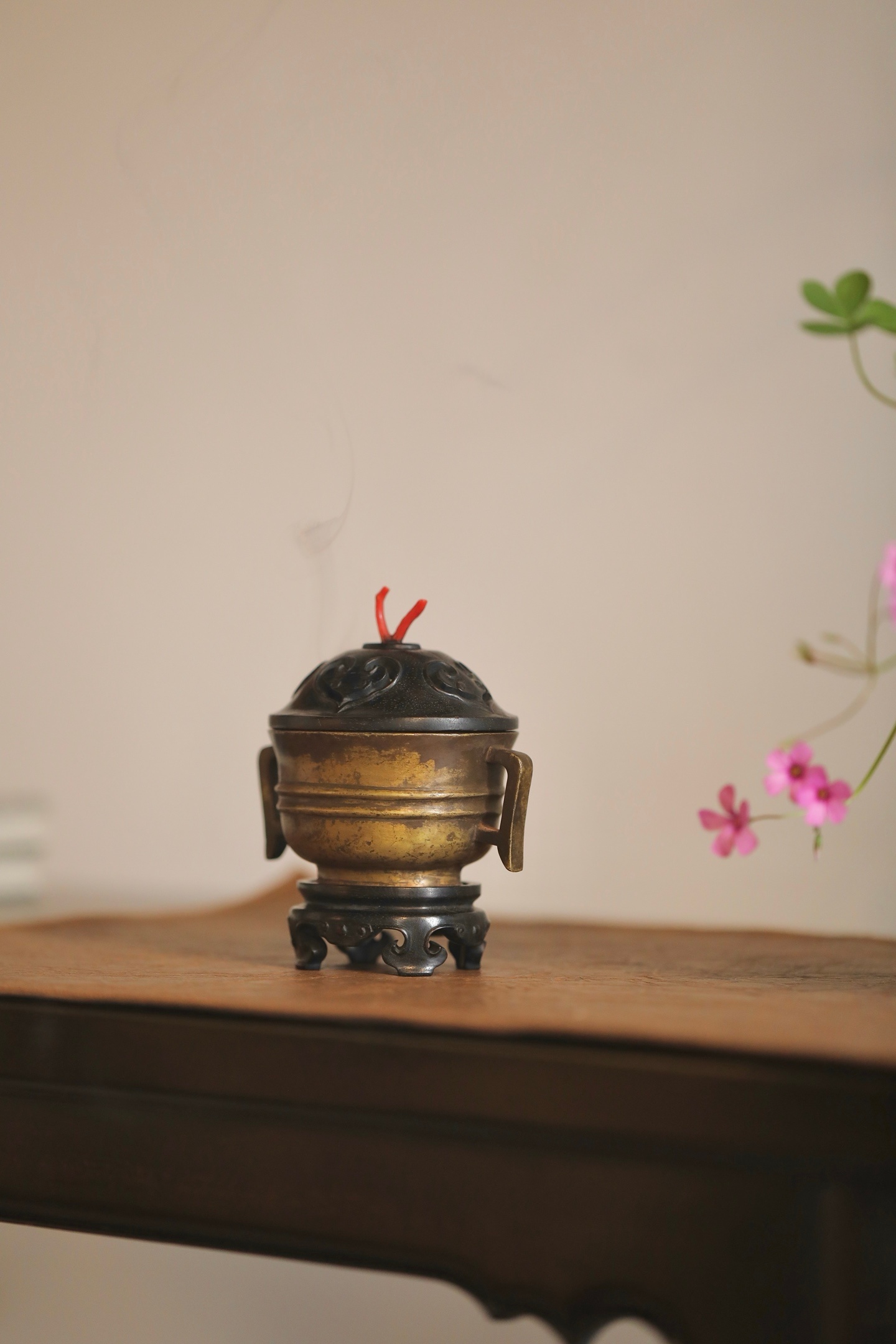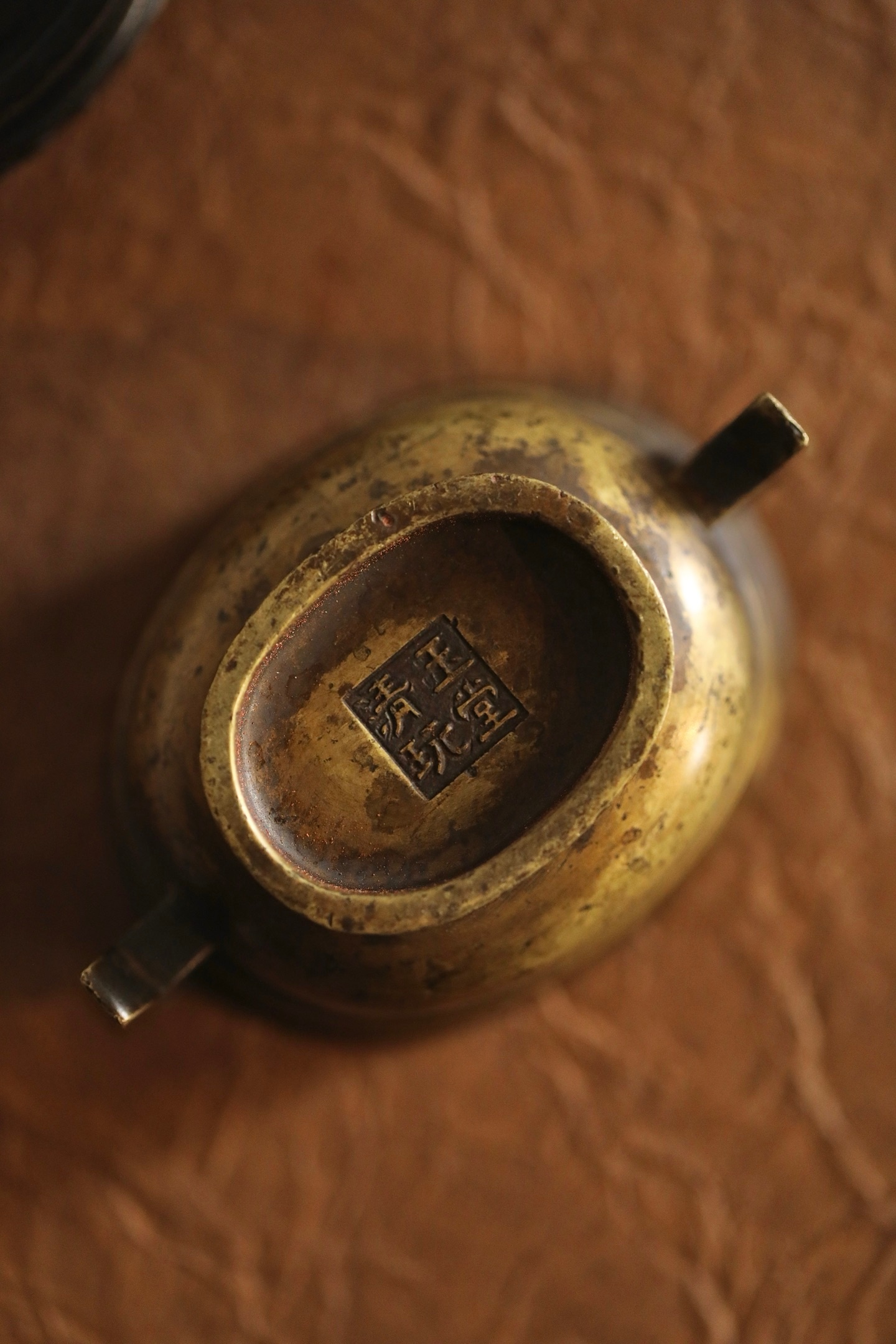 取商周簋器之形,敛口鼓腹,双戟耳挺括刚劲,承托炉身稳重之态。炉身起弦纹数道,线条利落,下承如意云头足,曲中见直,既稳承炉身,又添文秀之姿,朱钮为眼,暗合“藏器待时”之意。一炉之形,藏三代之礼,载文房之雅,是为案头清供之珍。