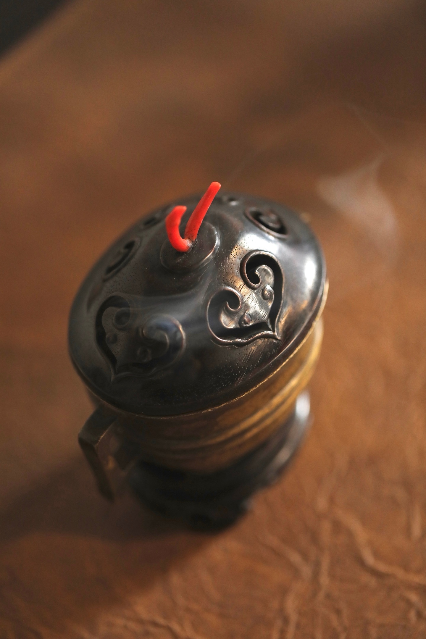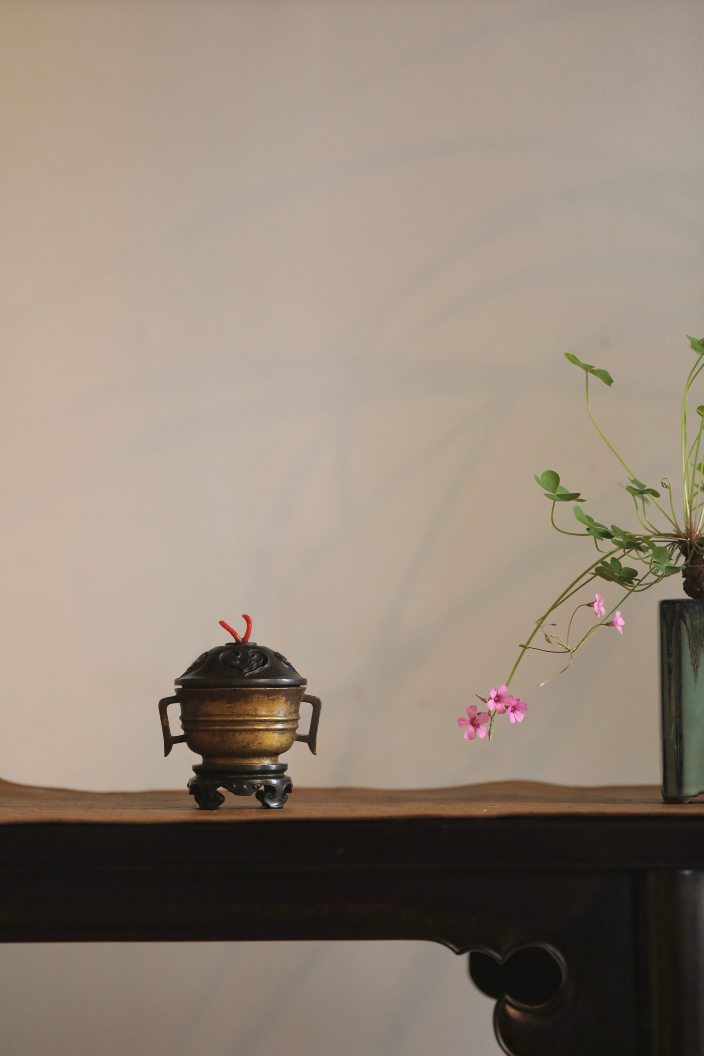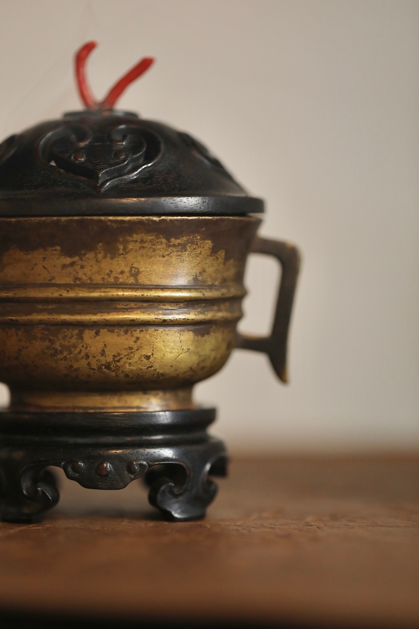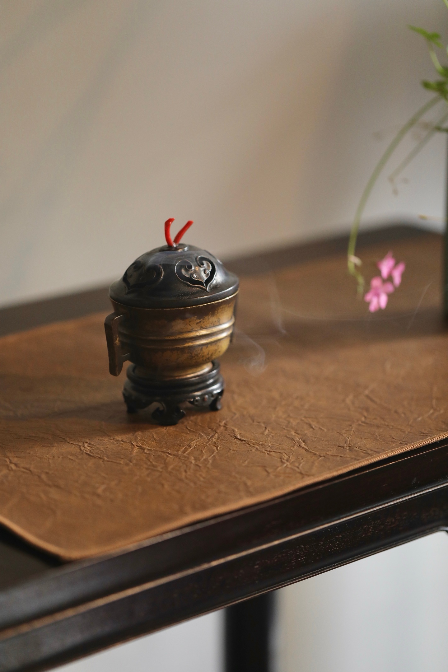 取商周簋器之形,敛口鼓腹,双戟耳挺括刚劲,承托炉身稳重之态。炉身起弦纹数道,线条利落,下承如意云头足,曲中见直,既稳承炉身,又添文秀之姿,朱钮为眼,暗合“藏器待时”之意。一炉之形,藏三代之礼,载文房之雅,是为案头清供之珍。