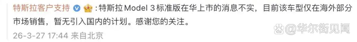 特斯拉在自家官博评论区,亲自留言否认Model 3要国产。 最权威的官方消息,藏在一条微博评论里。 你品品这个画面。 一个网友问,听说Model 3标准版要来了?特斯拉客户支持回:假的,没计划。 就这么简单。 没有公告,没有发布会,甚至没单独发条微博。就在评论区里,像回复一个普通提问一样,把无数人翘首以盼的消息给否了。 这不就是典型的“传说中”吗? 一辆车还没影儿,各种小道消息已经满天飞。有人分析价格,有人猜测配置,有人连提车日期都算好了。结果呢?官方用最轻描淡写的方式告诉你:别等了。 说白了,你等的不是一辆车。 你是在为一个不确定的信息消耗注意力。为一句“听说”,琢磨半天;为一个“可能”,反复纠结。 你以为你在关注市场动态。 其实你只是在信息流里,为一个迟迟不落地的答案买单。 特斯拉为什么要在评论区说? 因为谣言已经传到了需要官方亲自下场、用这种非正式方式截断的地步。市场期待太高了,高到必须立刻澄清,哪怕方式有点“掉价”。 这背后是一种无奈。 也是这个时代最真实的消费图景——我们总在追逐那些尚未发生的事,却对眼前确定的事实视而不见。 让消费回归对现有事实的确认吧。 别再为“传说”浪费情绪了。