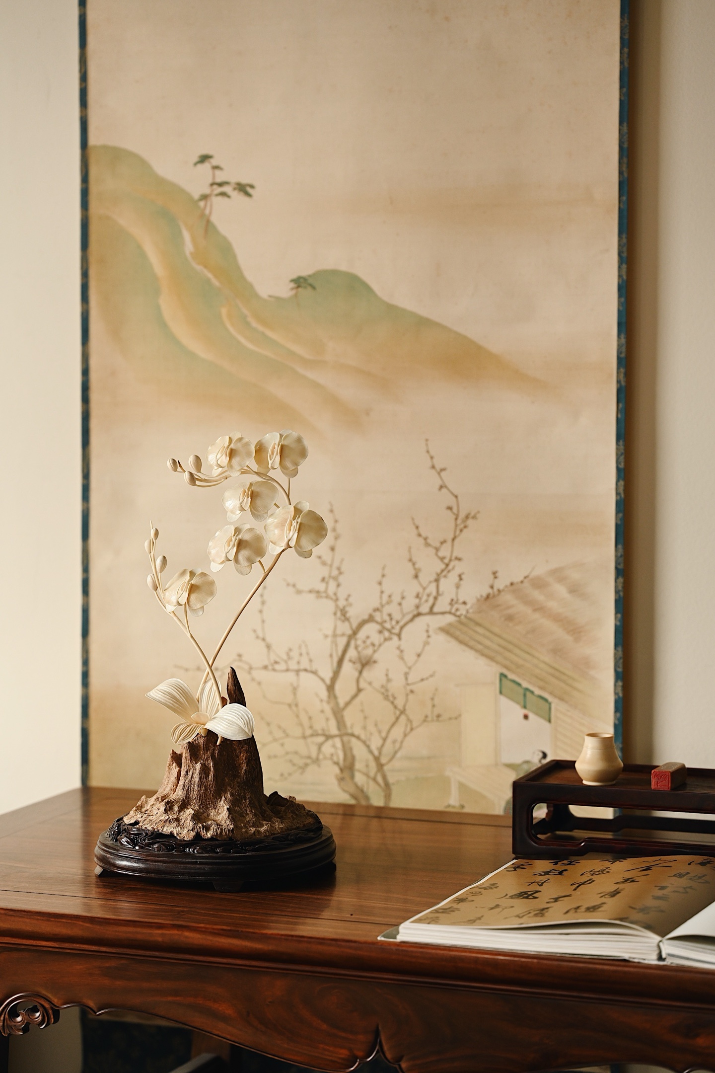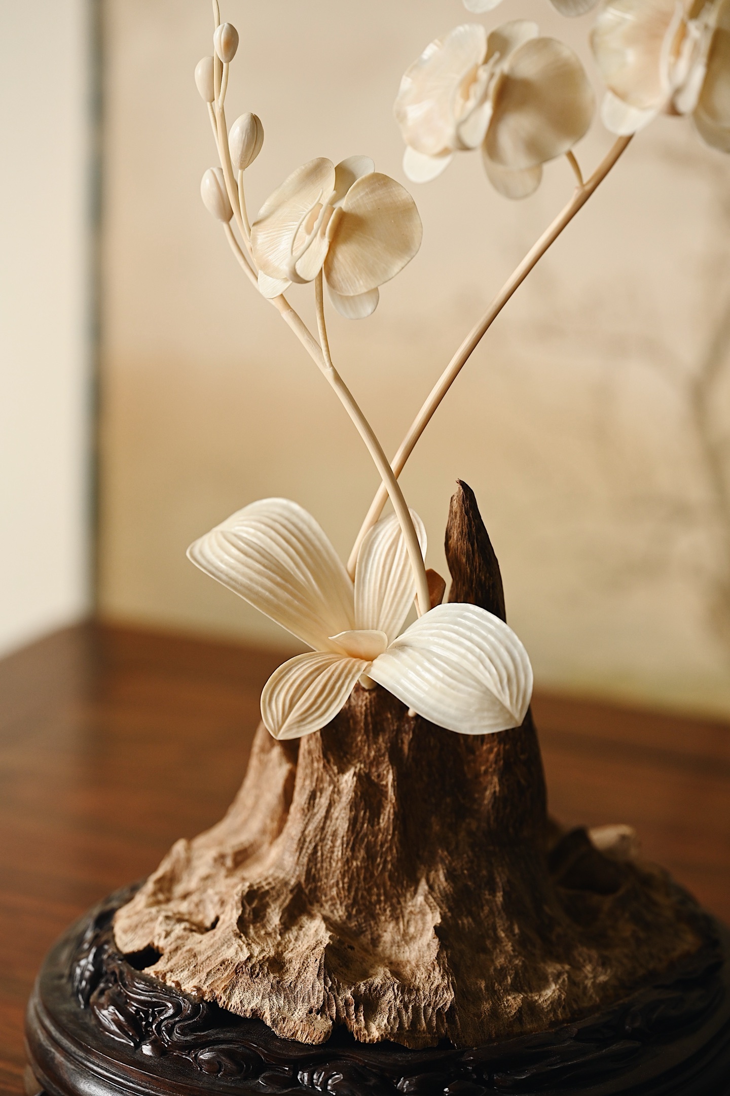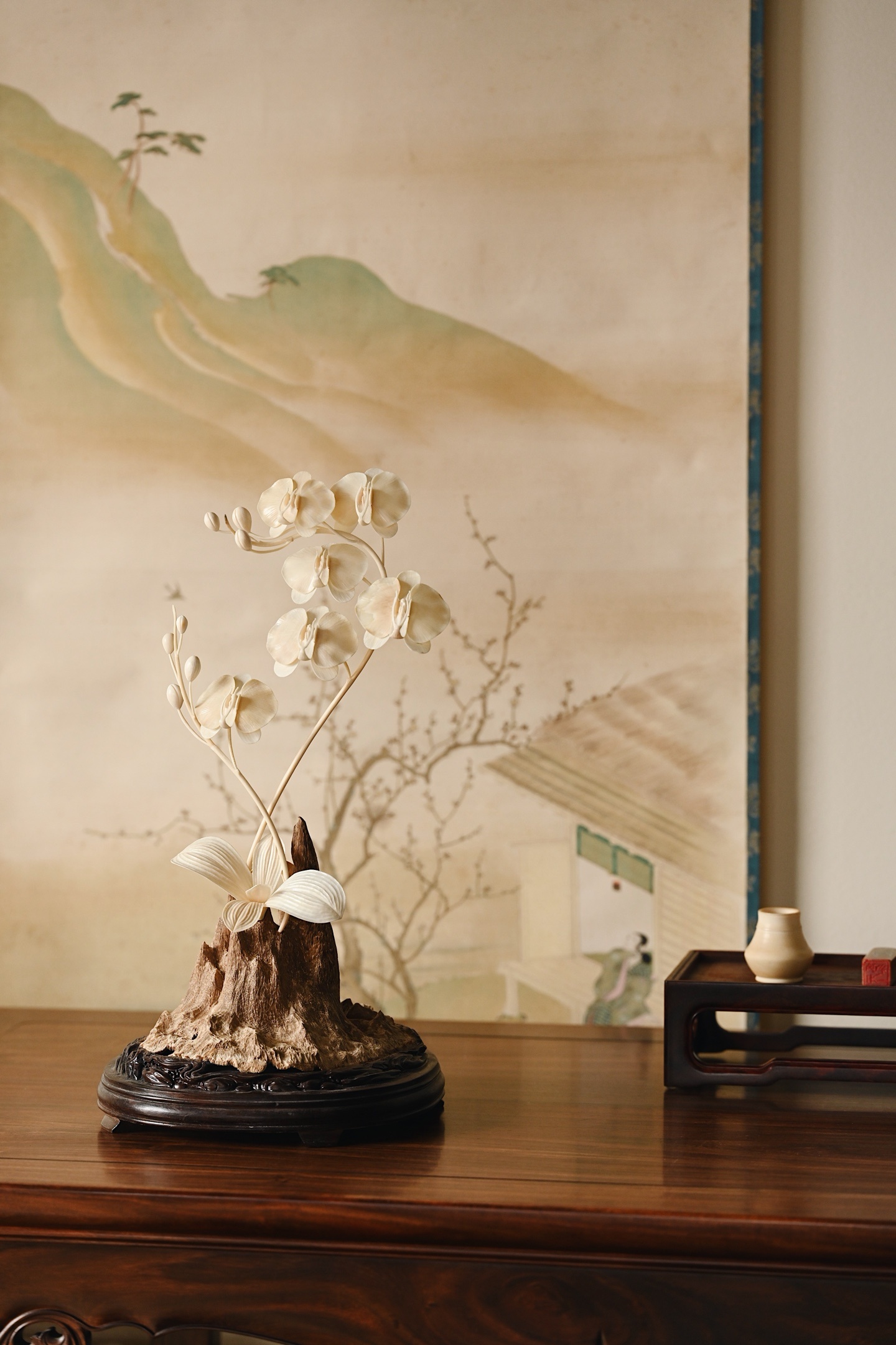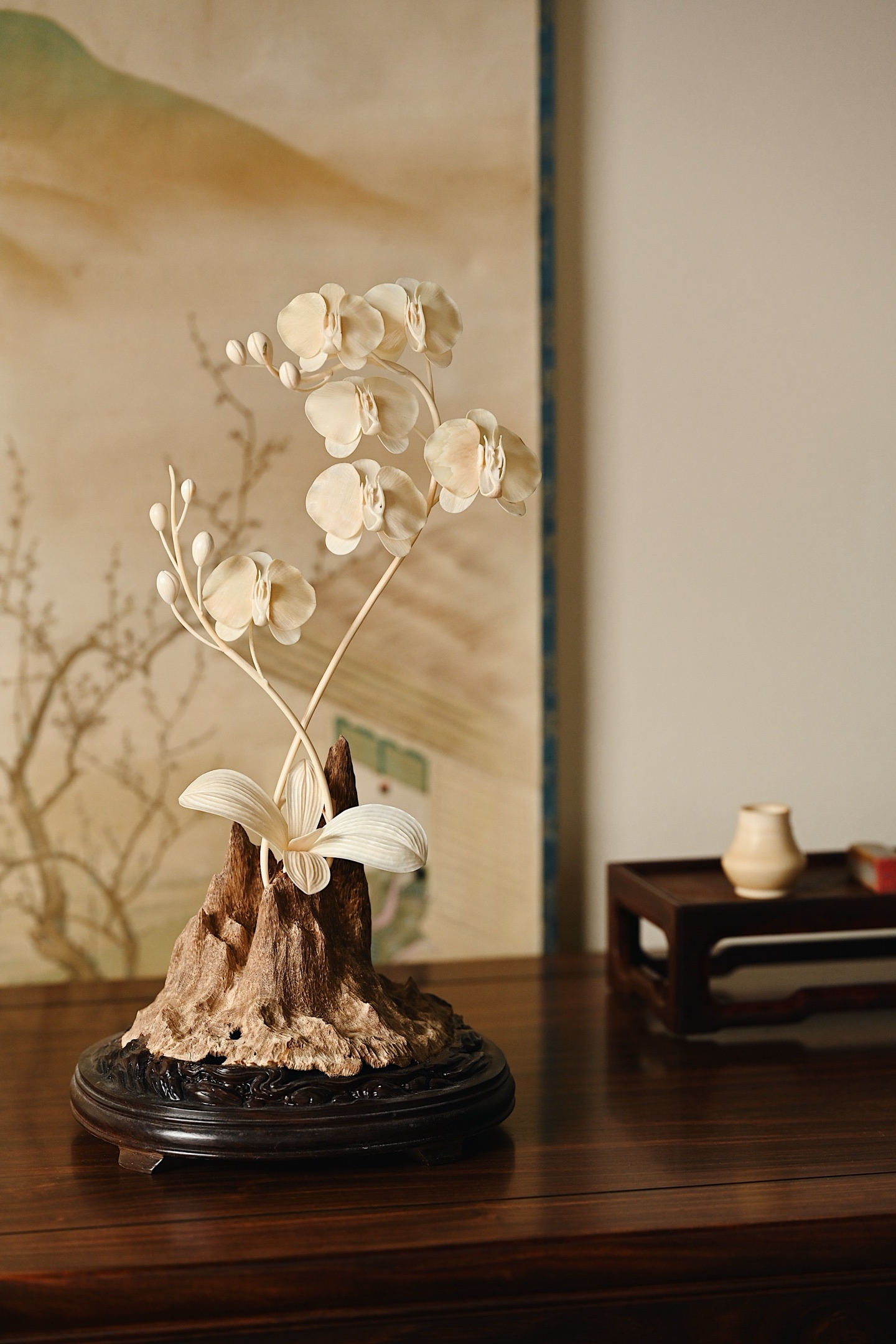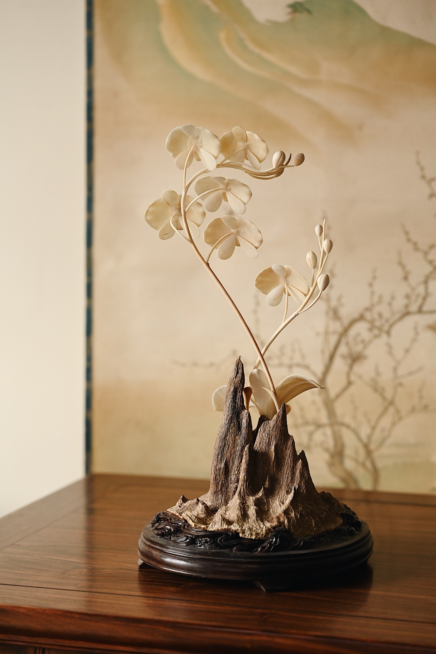 加里曼丹沉香x猛犸 | 兰香幽谷 摆件取天然沉香包头为底,肌理苍劲如峰峦,皮壳如