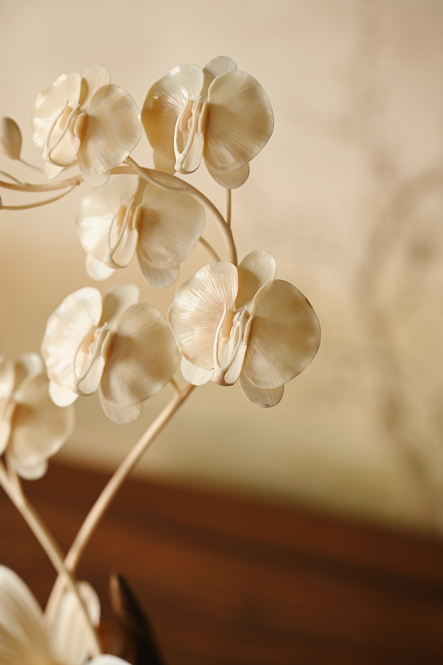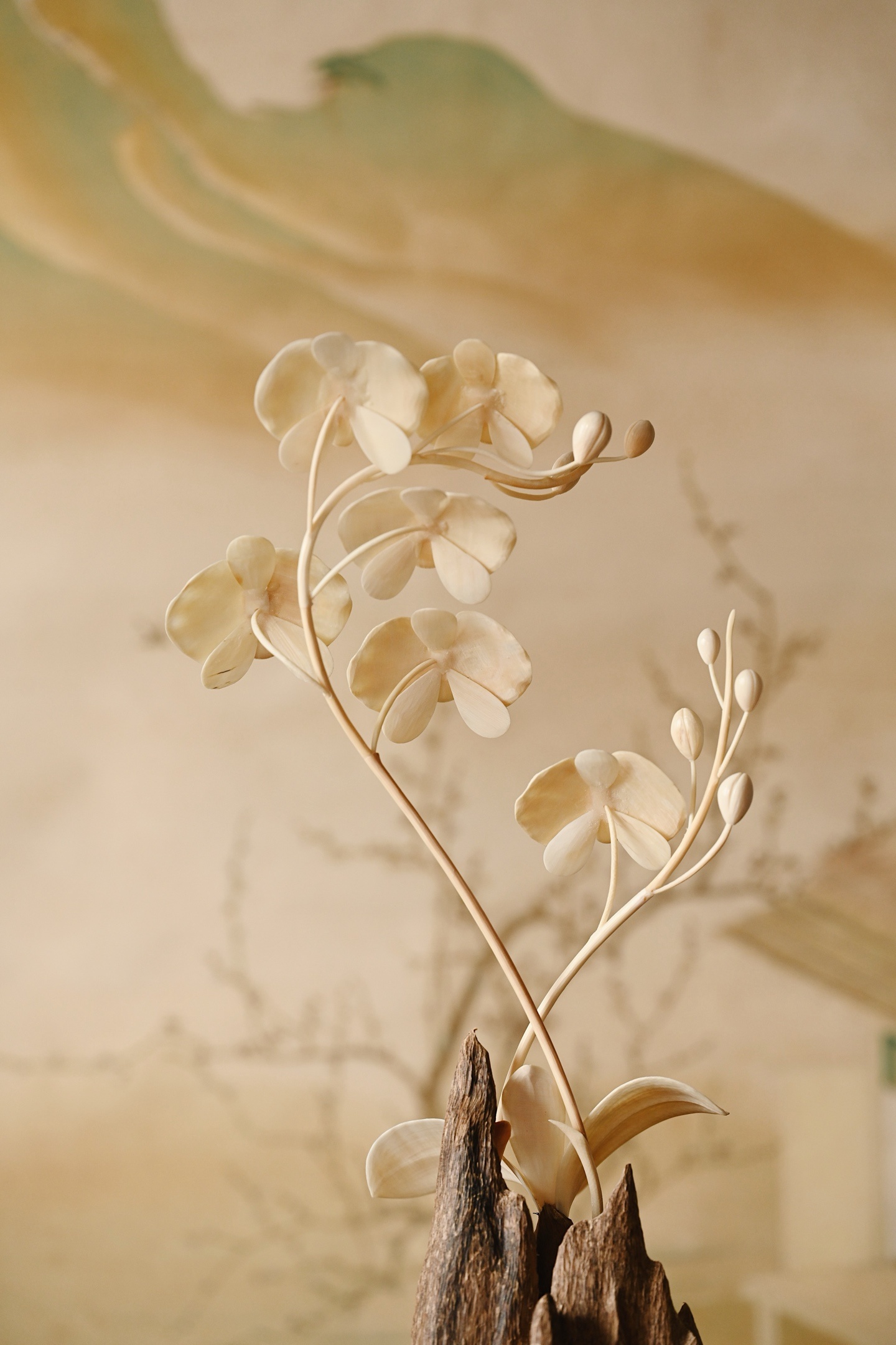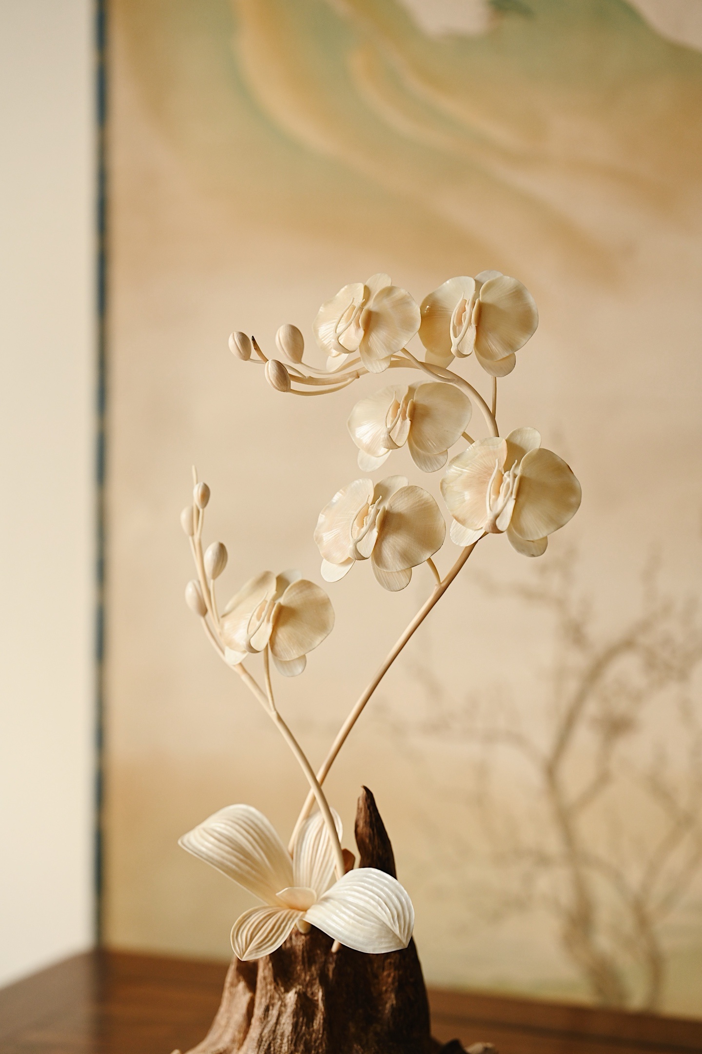 取天然沉香包头为底,肌理苍劲如峰峦,皮壳如山川脉络。嵌蝴蝶兰瓣脉纤毫毕现,莹润如脂,与沉香木的古朴形成刚柔并济之美。