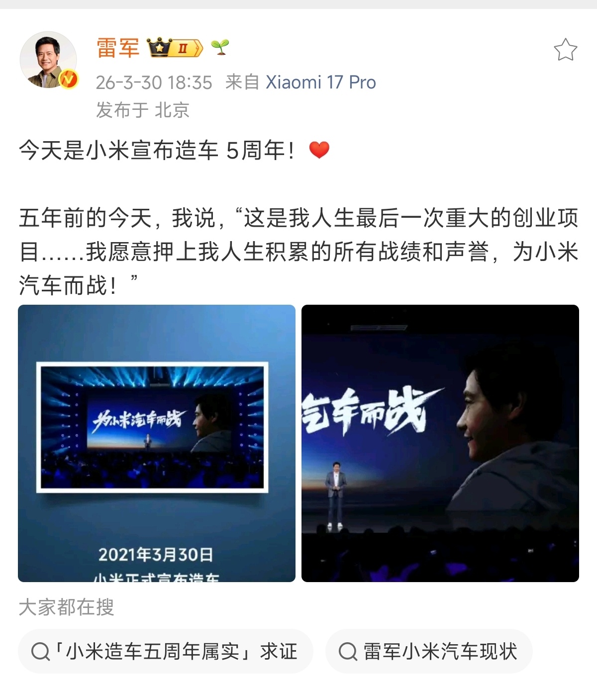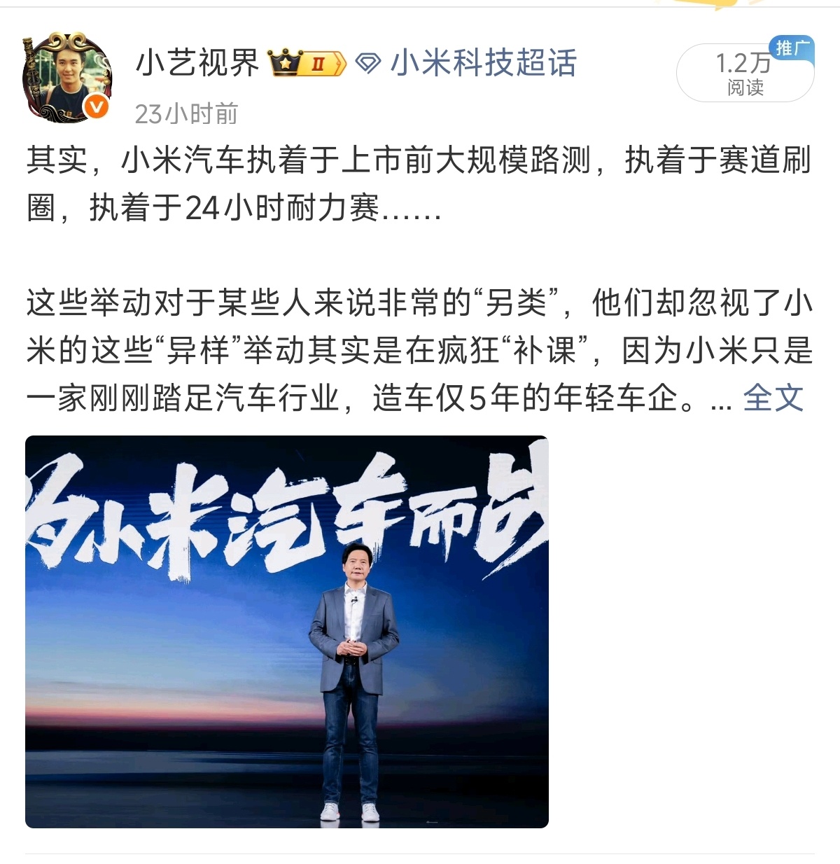 比雷总早发了18个小时,“为小米汽车而战!”
