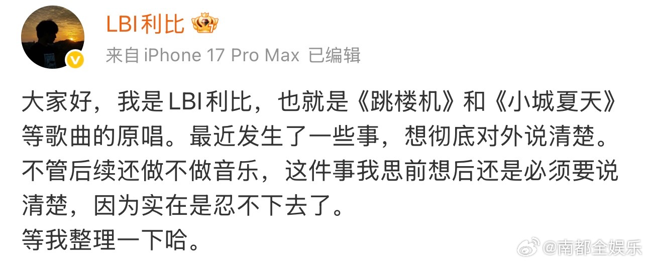 利比被环球音乐威胁跳楼机原唱LBI利比维权今日凌晨,《跳楼机》《小城夏天》原唱歌手发长文维权,他称⬇️:1️⃣环球音乐在没有授权的情况下,私自侵占他的歌曲版权,并发来所谓的“沟通函”进行威胁。2️⃣利比还称环球音乐对外宣传他是环球旗下的签约艺人,并私自与海外场地签订后违约,用双方共同的收益来作抵扣。3️⃣利比称自己目前未收到环球音乐任何一笔款项。 跳楼机原唱实在是忍不下去了