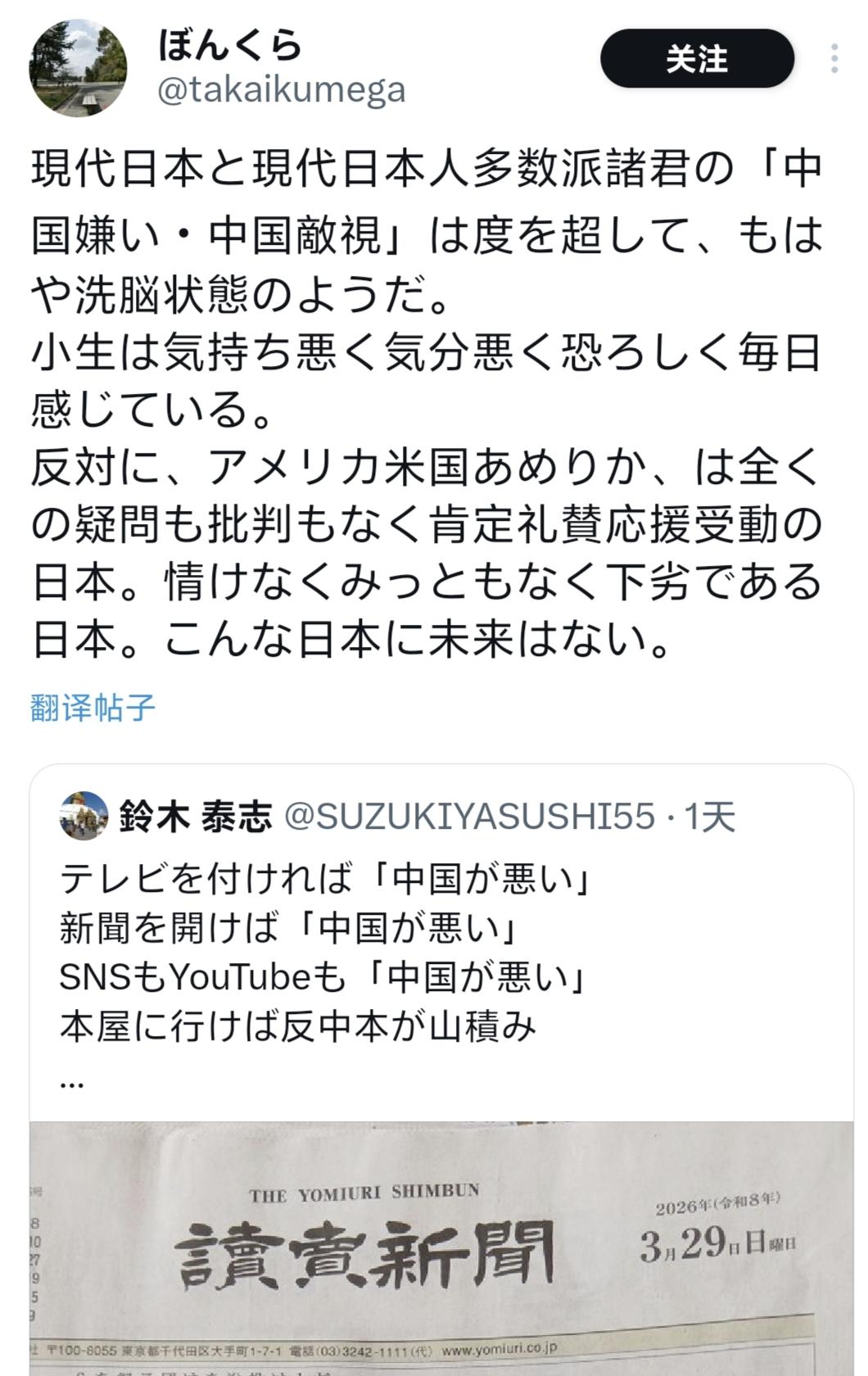 越来越多的日本人认识到:日本政府和媒体宣传使得绝大多数日本人对东大存在莫名其妙的、极端夸大的敌意。 一个日本网友说:现代日本及多数日本人对中国的"厌恶与敌视"已超出正常范围,仿佛陷入了洗脑状态。我每天都感到恶心、沮丧和恐惧。相反,对美国却毫无质疑与批 判,一味地肯定、支持并被动地拥护着这个既无怜悯之心又缺乏道德底线的劣质国家美国。这样的日本无法拥有未来。 另一个日本网友评论说:此外,还有一点需要强调。即便你可以私下认为“东大不好”或“问题出在东大”,但公然嘲讽一个已成长为世界最大工业国的邻国,这种行为实在幼稚。无论如何,我们都绝不能发起一场注定失败的战争。日本曾因美国强大的工业实力而溃败,如今若仍无法避免与最强大工业国东大的冲突,那的确是致命的。 日本这个国家是最奴颜婢膝的,也是最有反骨的,每次都挑最强大的人当对手,当日本被打服的时候,它比孙子还听话;当日本觉得它又行了的时候,每次都挑最强大的国家做对手。