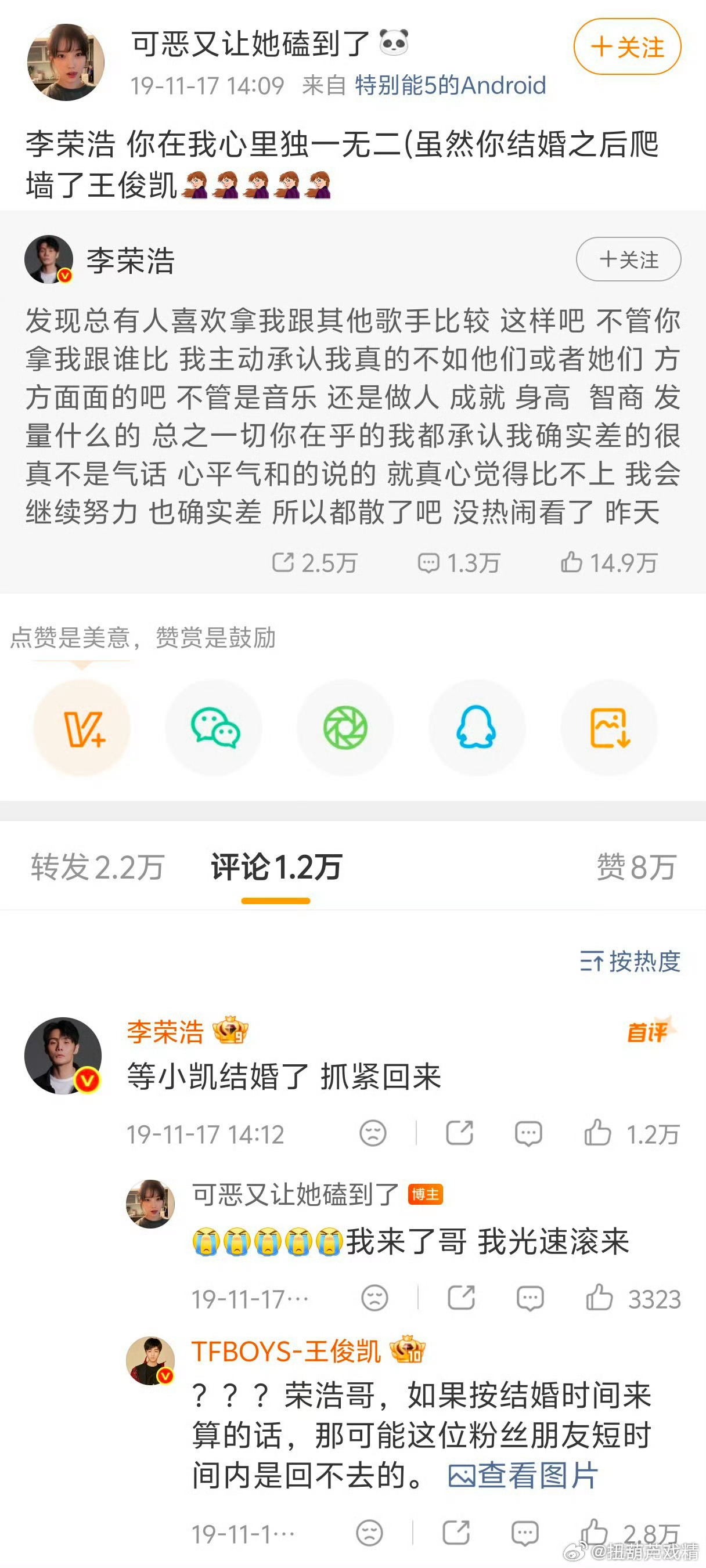 李荣浩、王俊凯?小凯这冲浪速度??王俊凯不应该回复啊,为啥去回复这些无聊?