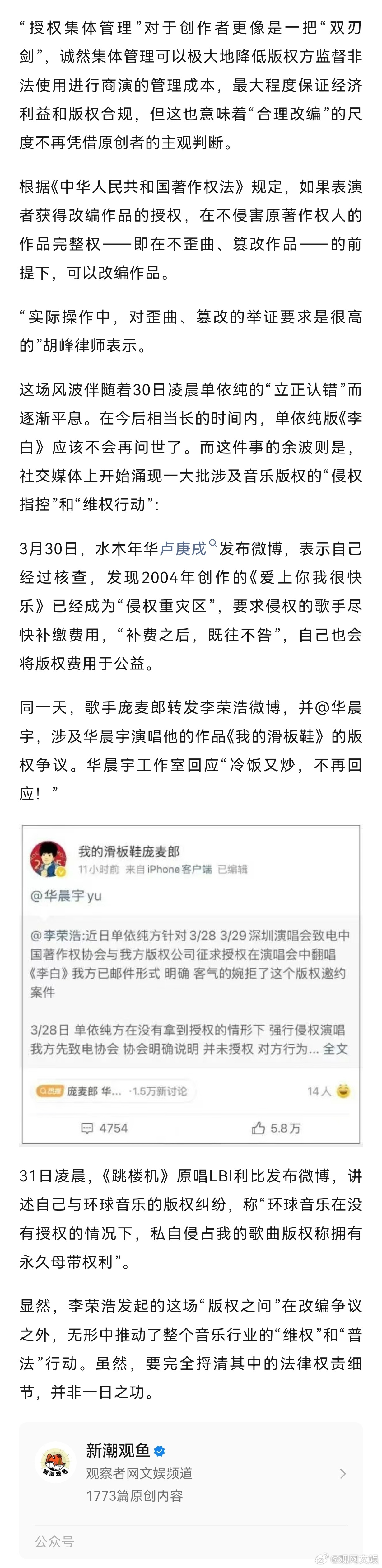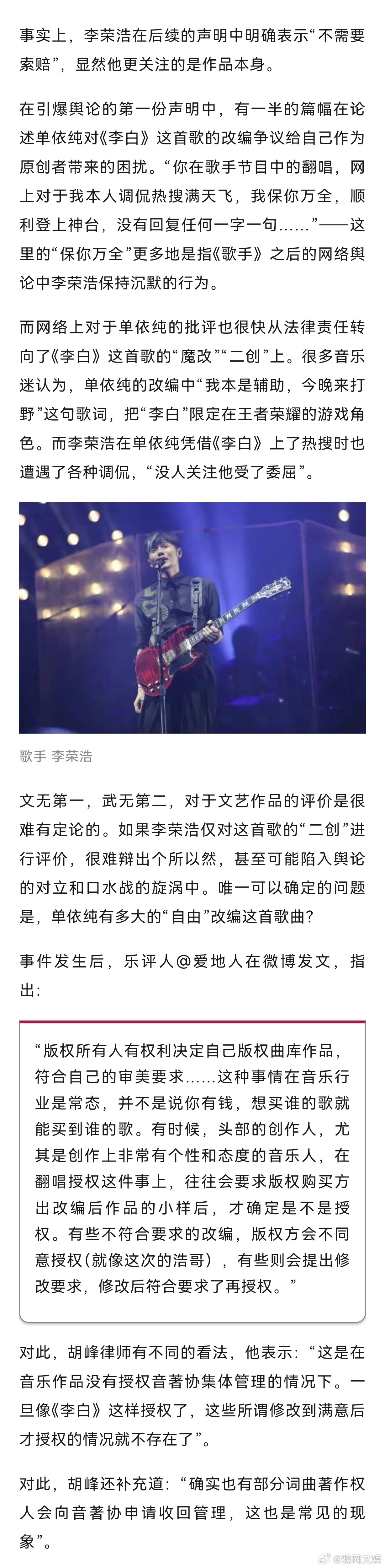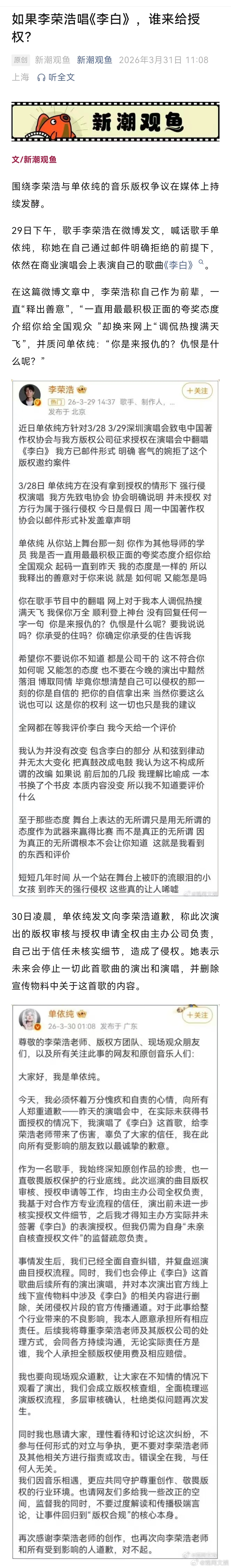 【如果李荣浩唱《李白》,谁来给授权?】律师谈单依纯侵权李荣浩事件单依纯唱李白应该由谁授权就李荣浩直指单依纯侵权纠纷中涉及的法律问题,新潮观鱼对话了两位法律界人士:上海市君悦律师事务所合伙人胡峰博士与太琨律创始合伙人朱界平律师。在李荣浩的声明中首先提及的是单依纯深圳演唱会方“致电中国音乐著作权协会与李荣浩方版权公司征求授权”。在此语境下授权涉及两个单位——中国音乐著作权协会(简称“音著协”)与李荣浩公司。这是否意味着单依纯在演唱会上演唱《李白》需要同时经过这两个单位的授权批准?