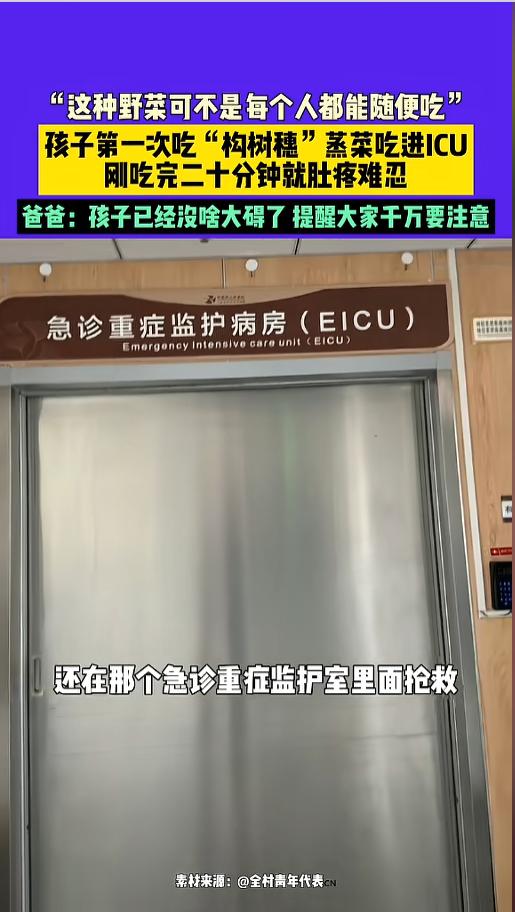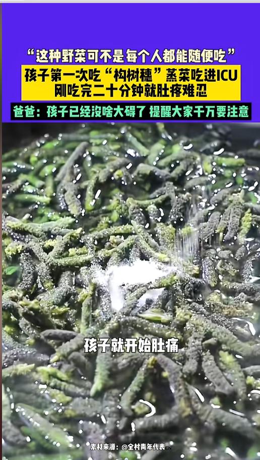 “野菜也不能乱吃!”近日,河南,一男子带着自己的孩子,在外面吃饭吃饭时点了一份“构树穗”,没想到孩子吃完不久后,就开始肚子疼,后面甚至出现了休克,被送往ICU抢救,险些丢了性命。网友:每个人身体素质不一样! 春天万物生发,正是吃野菜的好时候,不少人为了这一口鲜,满山遍野的去挖野菜,很多饭店也顺势推出相关菜品。不过,野菜可不能乱吃,这些不常见的,都是潜在的过敏原。 构树穗是构树的雄性花序,绿绿的,以前饥荒的时候能当饭吃,后来逐渐发展成了一种特色食品,也是野菜的一种。北方很多人都吃过。 当天,男子带着孩子,在饭店里吃饭的时候,就点了一份。男子没什么事,就是孩子是第一次吃。没想到,吃完才二十分钟,孩子就感觉不舒服,肚子非常的痛。 男子见状,带他去了当地卫生院,结果人卫生院说太严重了,让赶紧去大医院。到了医院之后,医生发现孩子呼吸困难,全身还起了疙瘩,是明显的过敏反应导致的休克,直接进了ICU抢救。 好在经过治疗,孩子脱离了危险,抓到了普通病房接受观察。男子也发了视频,提醒大家以后尽量不要再吃这个东西。 其实,野菜的流行是因为以前食物不足,只能用它们充饥,后来忆苦思甜,追求自然野味,逐渐带火了。它最大的问题就是,很多人以前没吃过,无法保证自己会不会过敏,就容易出现孩子的这种情况。 提醒大家,过敏体质的人千万不要尝试,非过敏体质的人,初次食用时尽量少吃,尝个鲜就行! 信息来源:《3月28日(发布)。“这种野菜可不是每个人都能随便吃”。孩子第一次吃“构树穗”蒸菜吃进ICU,刚吃完二十分钟就肚疼难忍。爸爸:孩子已经没啥大碍了 提醒大家千万要注意。》河南广播电视台民生频道