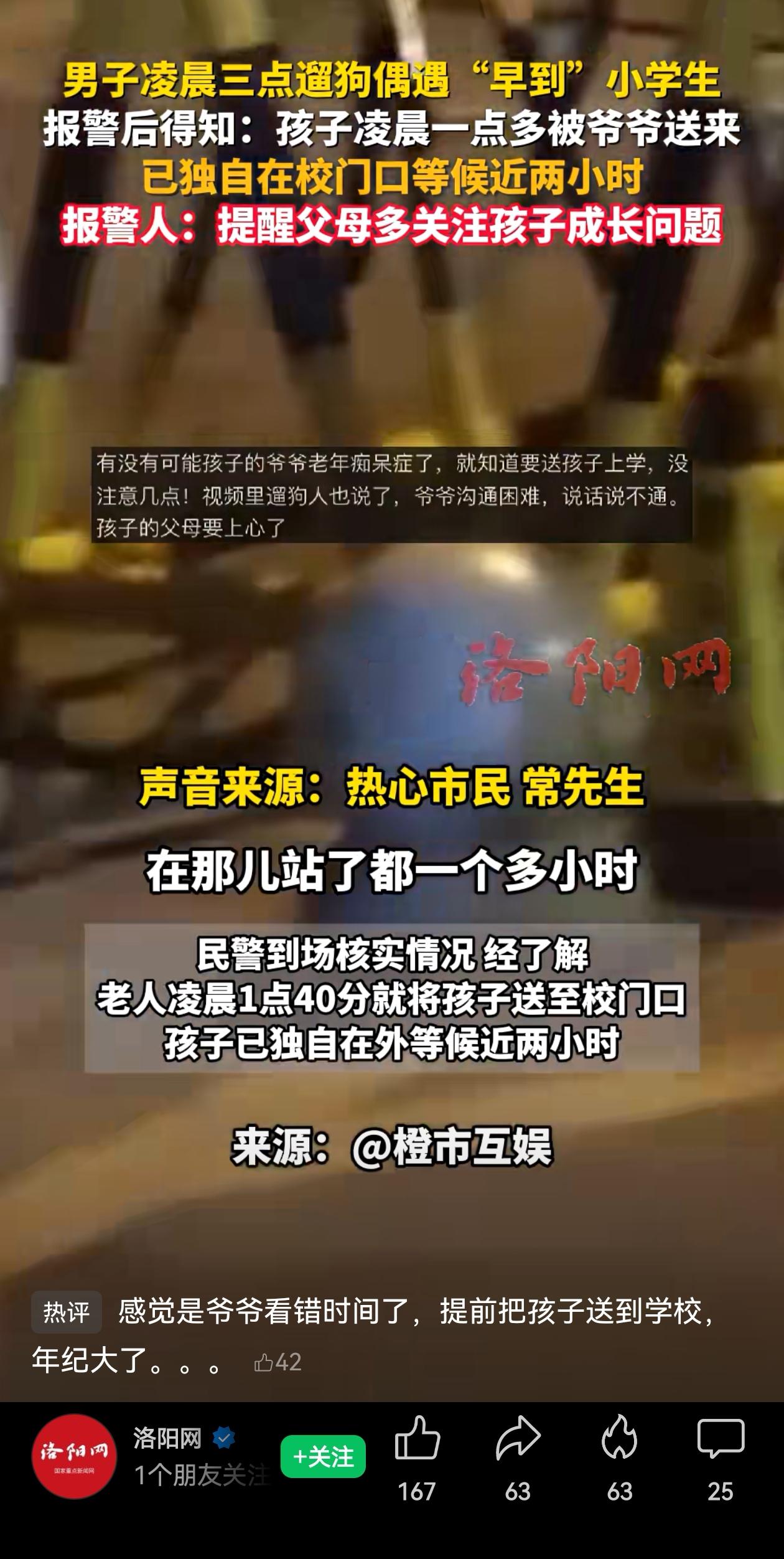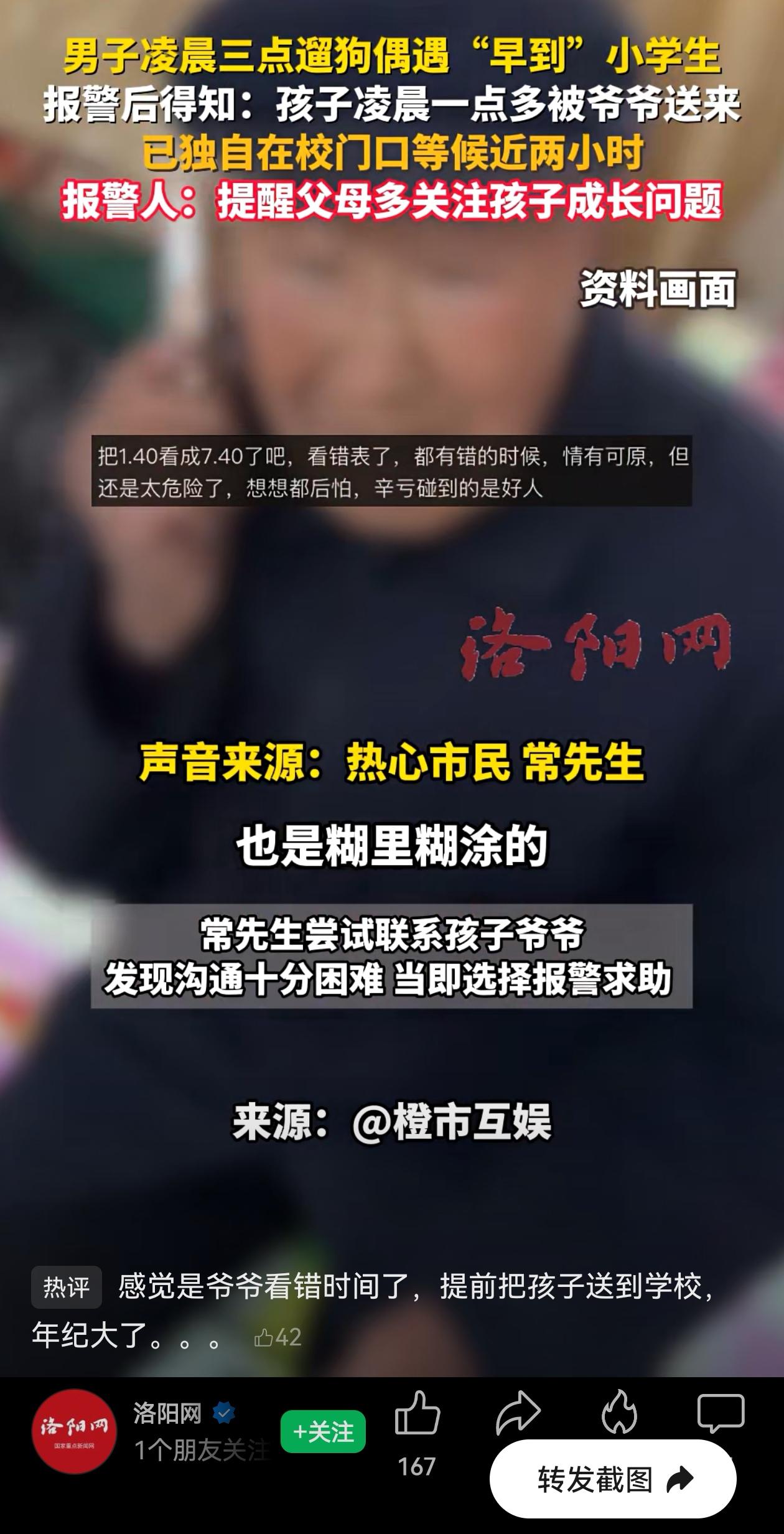 幸亏没出事儿啊!河南洛阳一个小学门口,凌晨三点多,一个出门遛狗的热心市民,看到一个小女孩,一个人蹲在学校门口,天还黑着,天也冷,已经在学校门口等了一个多小时,是爷爷看错时间,被提前送到了学校的。 说实话,一位八十多岁的老人,记着送孩子上学应该是大事,但是年纪太大了,民警打电话给爷爷时,也较糊涂。一个需要被照顾的老人,却要承担起照顾孩子的责任,这本身就挺让人心疼的。 孩子的爸妈呢?大概率是在外打工,或者因为其他原因没法陪在孩子身边。父母出去挣钱,被迫把孩子留给老人带。 可如果老人已经八十多了,身体和精力都跟不上了,这个安排真的合适吗? 小女孩懂事得让人心疼,凌晨1点被送到学校门口,没乱跑、没哭闹,就那么安静地蹲在校门口等着。 可她心里会不会害怕?会不会觉得委屈?凌晨的黑暗和寒冷,会害怕吗? 河南洛阳这事儿看的人心里发紧,年轻人要挣钱养家,老人要咬牙撑着带孩子,能责怪老爷子吗?老人家记得送孙女上学,心里还惦记着别迟到,实在不忍心指责。 老人咬牙撑着带孩子,撑不住了也得撑。最可怜的是孩子,有人管饭、有人送上学,可那种“有人陪、有人疼”的安全感,是不是还差点? 如果没有那个凌晨出门遛狗的好心人呢?如果孩子出了什么事呢?想想就后怕。这次孩子被安全送回家了,但是这件事算是过去了吗? 父母打工挣钱养家,确实不容易。但再难,也不能把这么小的孩子完全丢给八十多岁的爷爷,一送了之啊! 爷爷连自己都需要人照顾,怎么扛得住整夜操心、凌晨送学的重担?孩子凌晨一点多就被送到学校门口,在寒夜里蹲了近两个小时,这要是出点意外,后悔都来不及。 生活再难,孩子的安全也不能靠运气啊!“一老一小”的安全,不能让“没办法”三个字就全部推脱了! 每个孩子都该在安全、温暖的环境里长大,这不是奢望,是最基本的要求吧! 迎着朝阳,安心地走进校门,这不是小学生最基本的要求吗? 信息来源:洛阳网