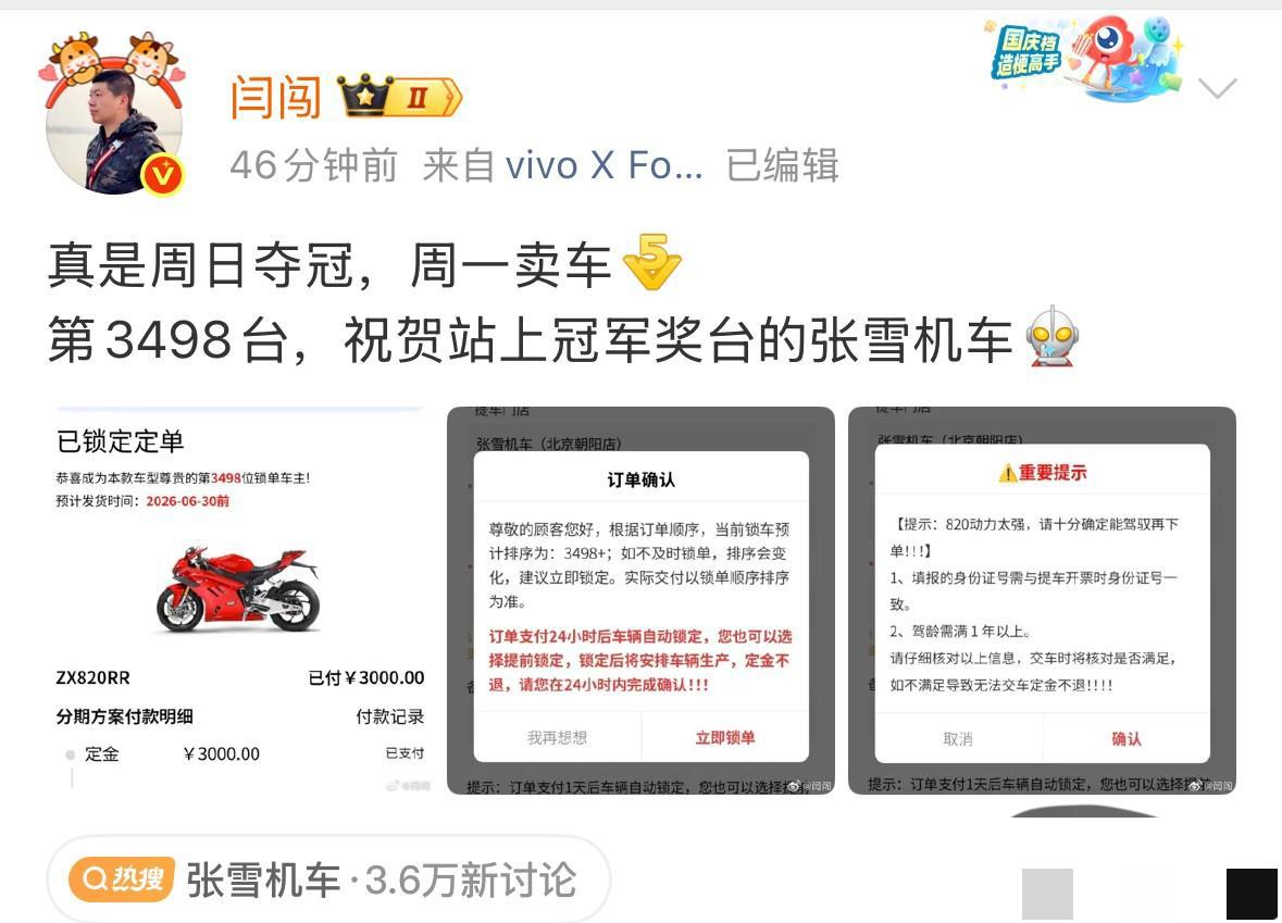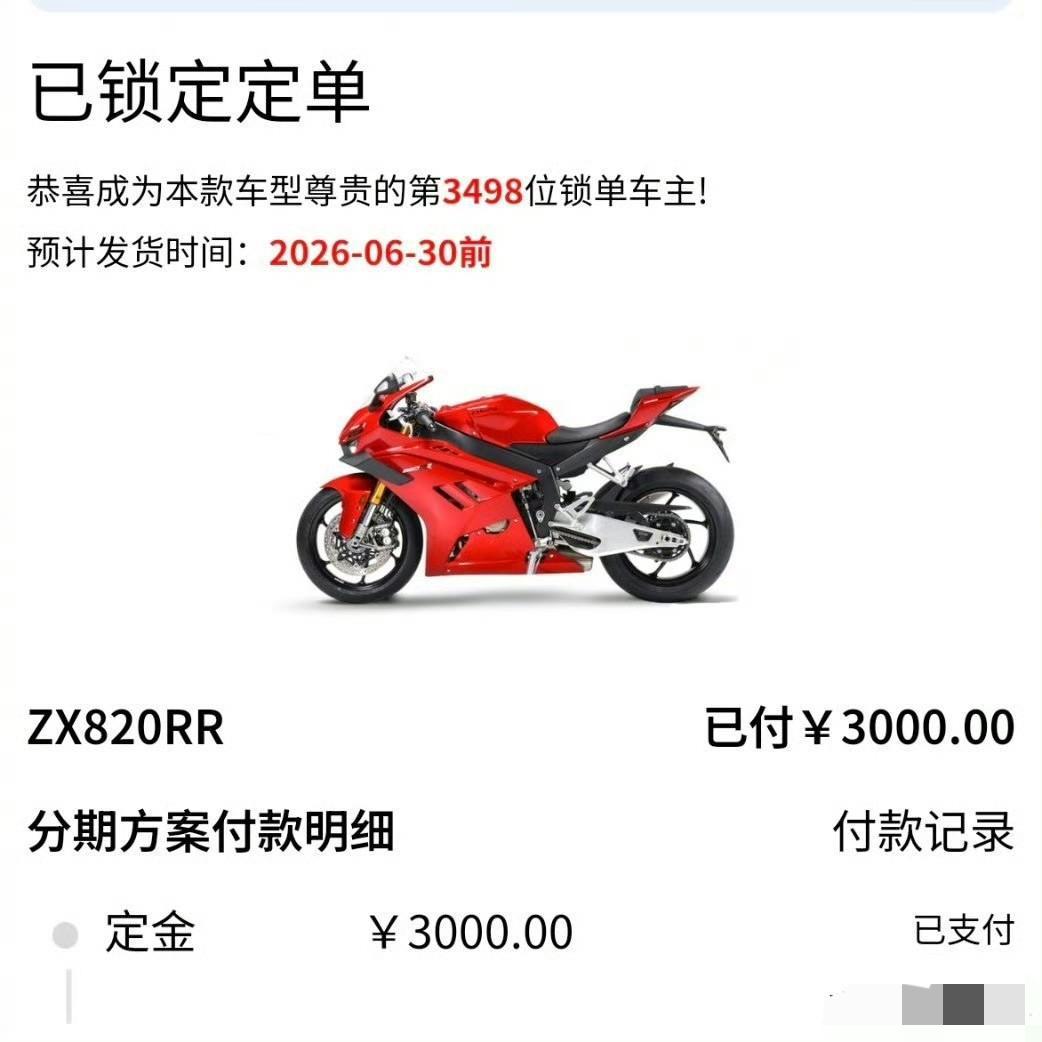 闫闯说到做到,直接订购了一台张雪机车820RR,成为第3498位锁单用户。 这