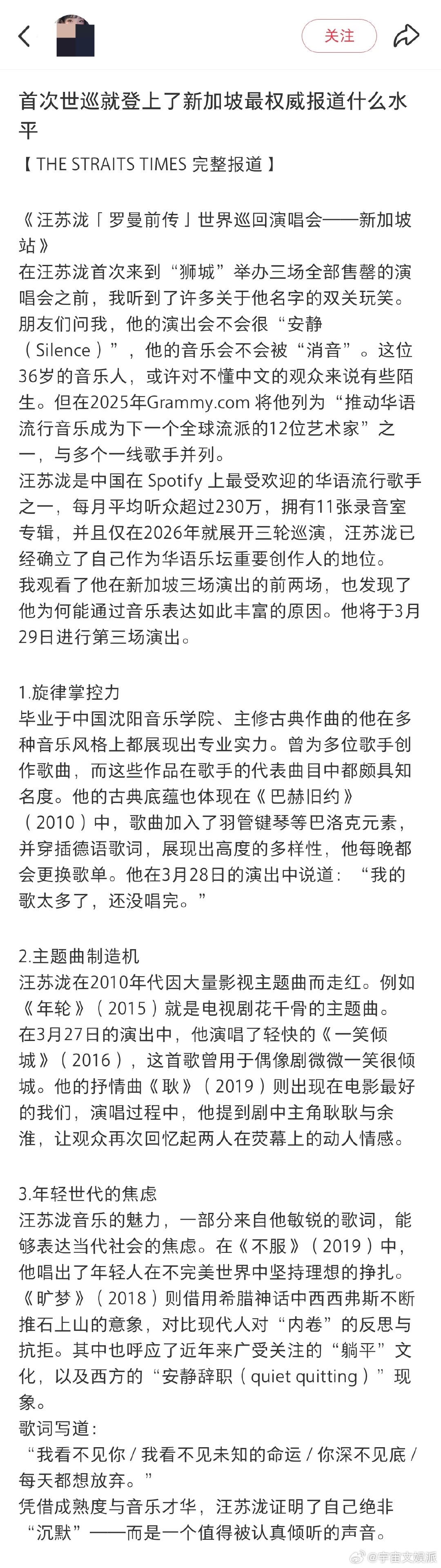 汪苏泷新加坡演唱会登报汪苏泷演唱会登报新加坡《海峡时报》整版报道汪苏泷世界巡演!首登狮城即获国际主流媒体深度乐评,赞誉其“绝非沉默,值得倾听”。音乐实力跨越语言,华流之声闪耀世界舞台。