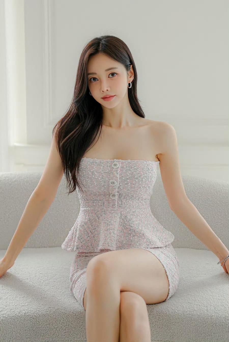 浅粉色小香风挂脖套装也太温柔了吧~ 粗花呢质感高级,挂脖露肩显直角肩, 荷叶边+
