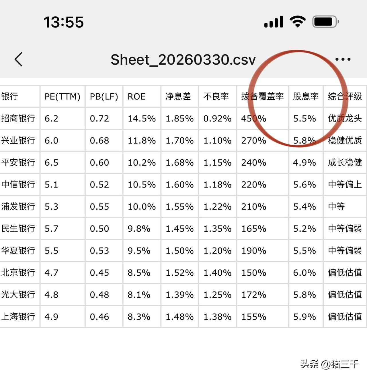避险情绪推动大资金流入银行避险! 建设银行和中国银行接近收复前高, 本轮外围不确定性以来两大银行反弹超10%, 农业银行前面更强所以调整更深一些, 目前是回踩年线的反击。 当然也有浦发银行和民生银行牛后, 又跌成熊样的非优质筹码。 三千试着用银行评判的四个指标: ROE、净息差、拨备覆盖率、不良率, 让豆包排出高股息股, 招商银行仍然最优质, 还有点意思哈…