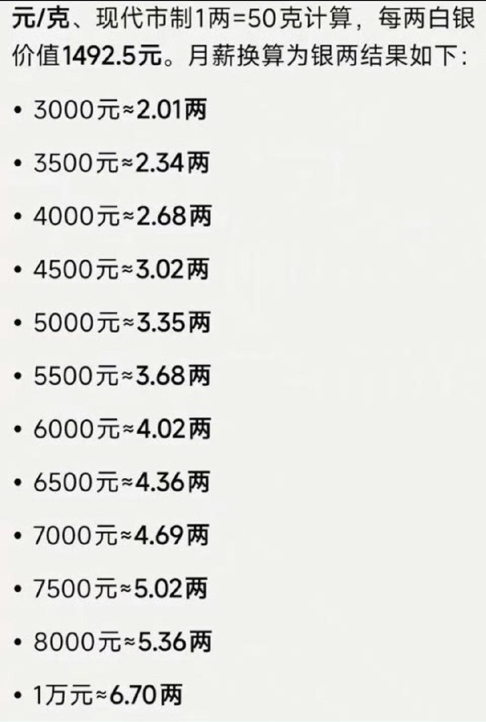 用户10xxx34 1 2026-04-01 10:09 你这就是纯扯淡,你咋不用大米来换算你的工资,你知道清朝一两银子能买多少米吗,康雍乾时米价最低,一两银子值80公斤大米,而月薪3千元现在能买1000公斤大米,现在银贵是因为工业用量大 推车者 回复 04-01 11:07 哪里的米1.5一斤啊