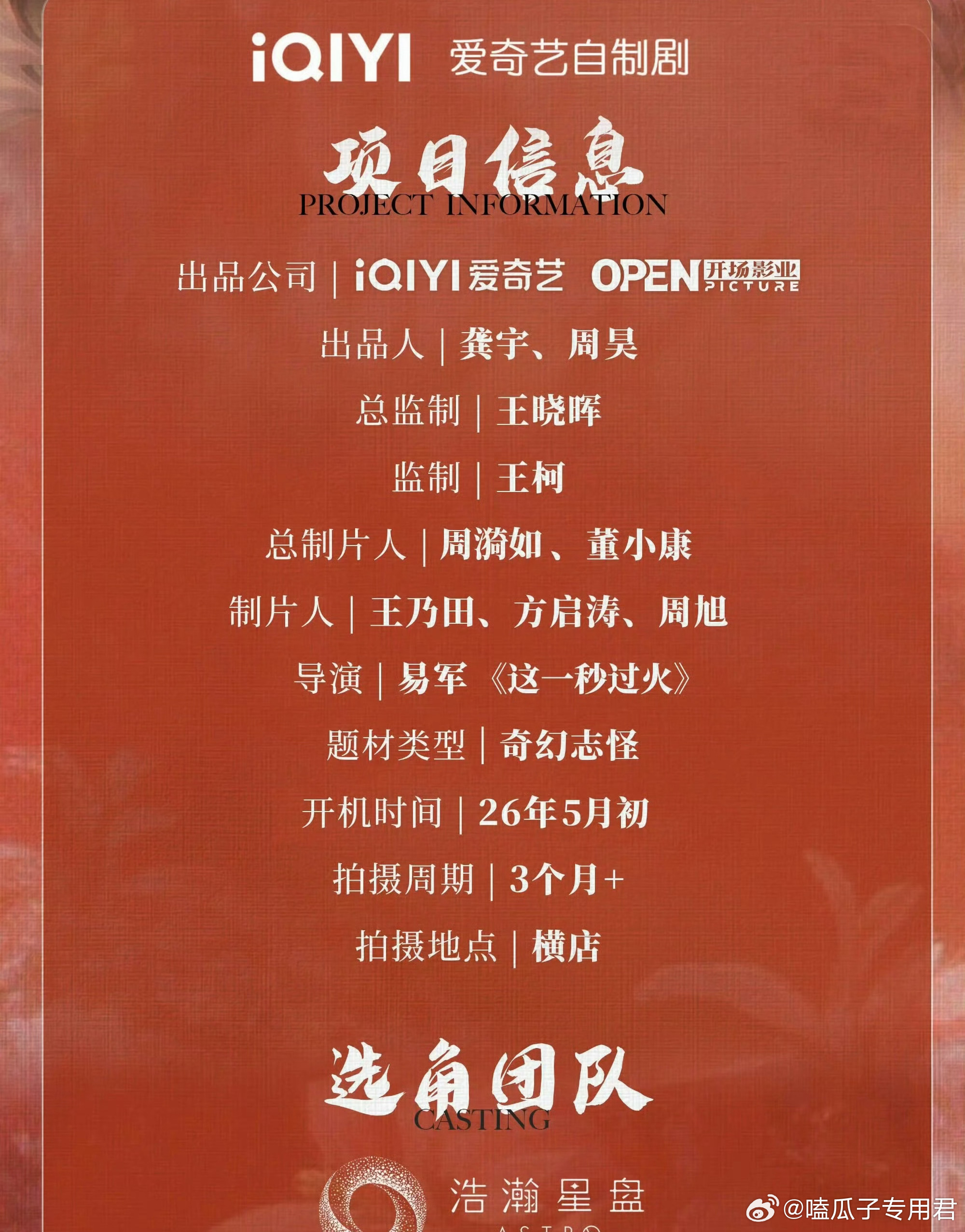 爱奇艺奇幻剧《浮生》主演 陈哲远&王楚然导演:易军《这一秒过火》造型:易小雅《苍兰诀》 5月初横店开机,拍摄周期90天。
